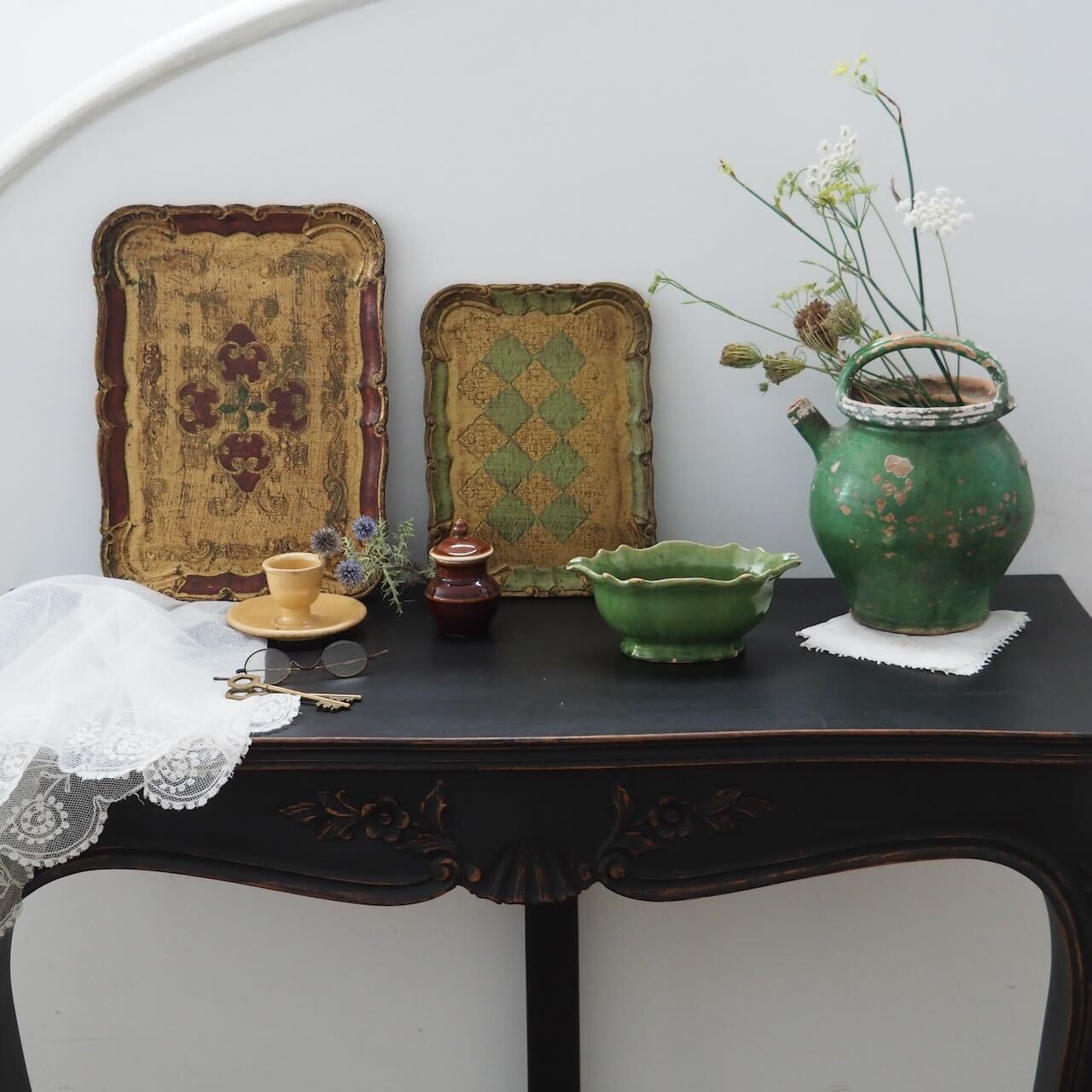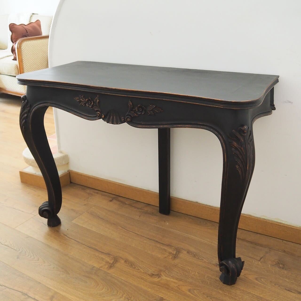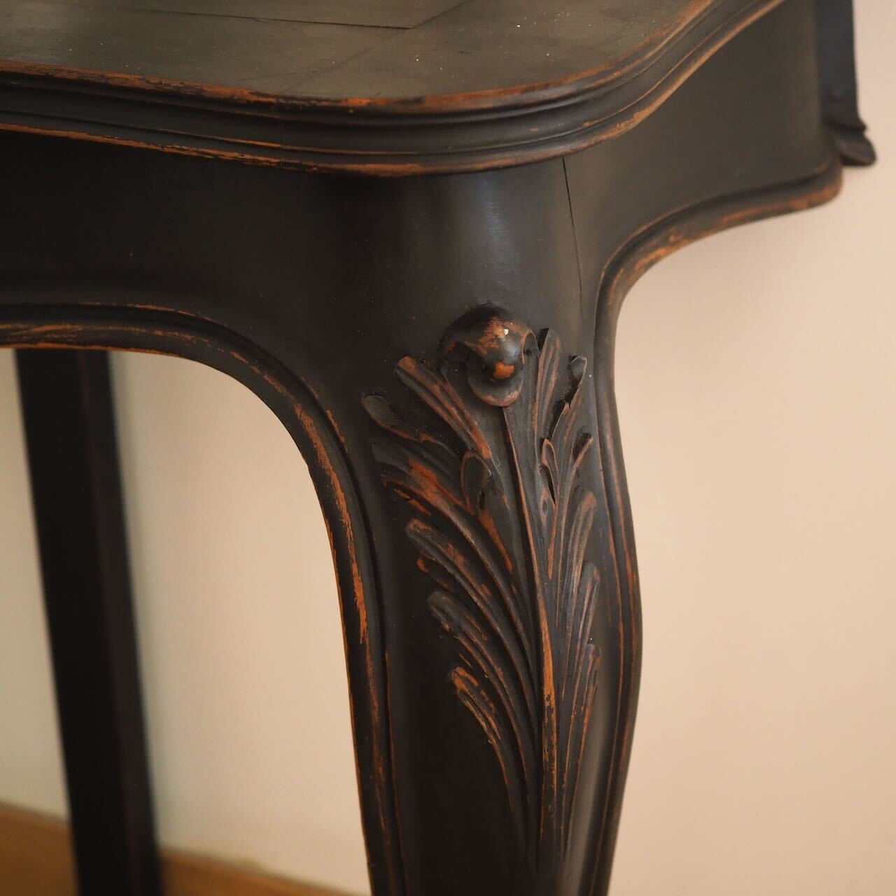リルシュルラソルグのアンティーク市で見つけた、ブラックのコンソールをご紹介します。アンティークのコンソールは脚が前2本だけで、後ろで壁に固定するタイプが多いのですが、こちらは後ろに脚が1本あるので置くだけでコンソールが設置できます。安定感も問題なし。
