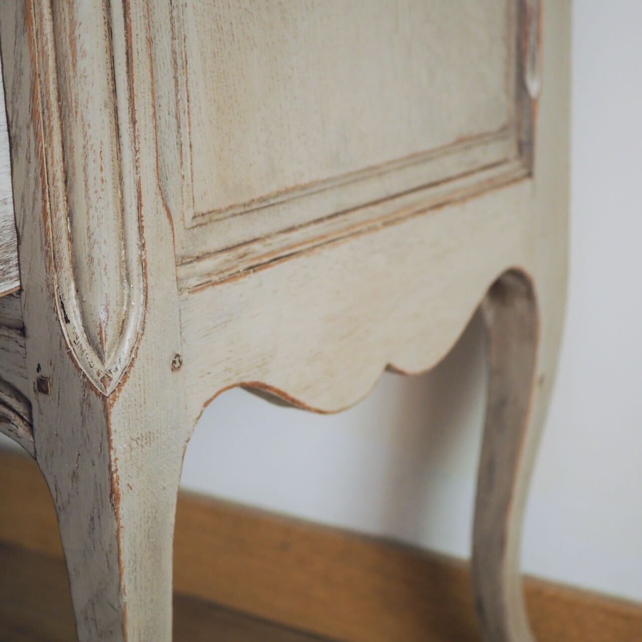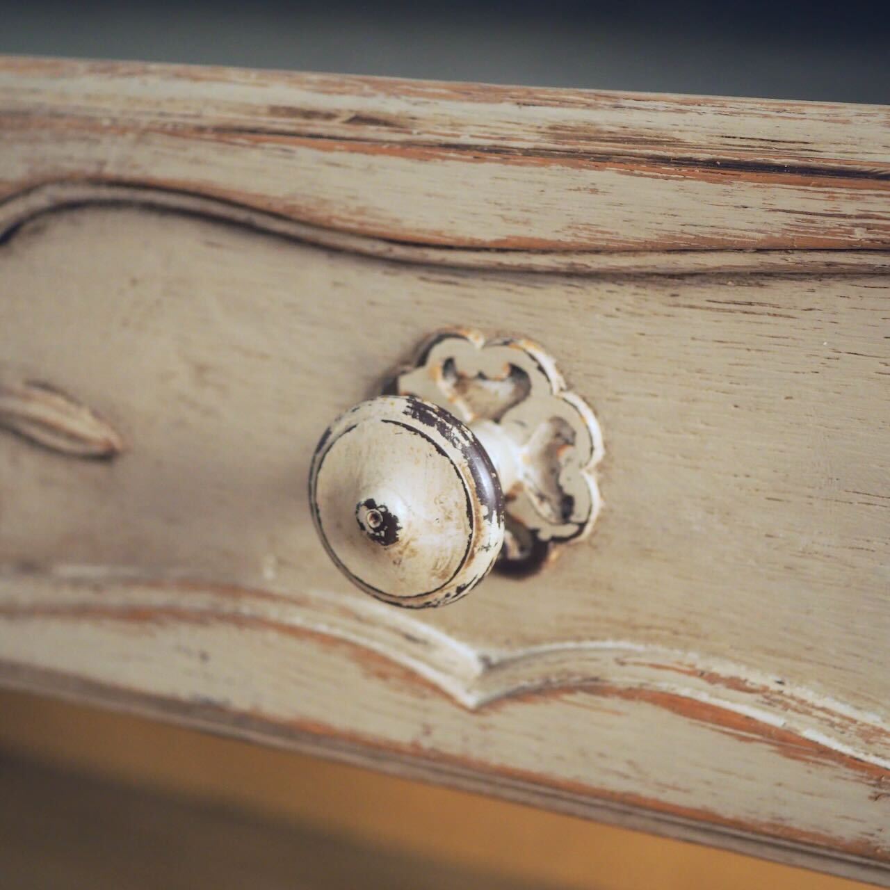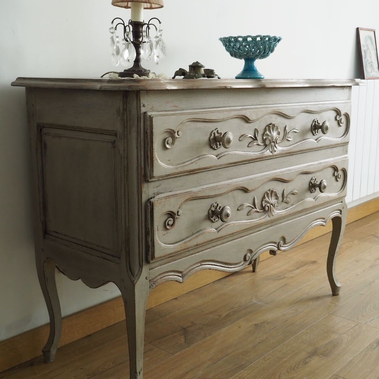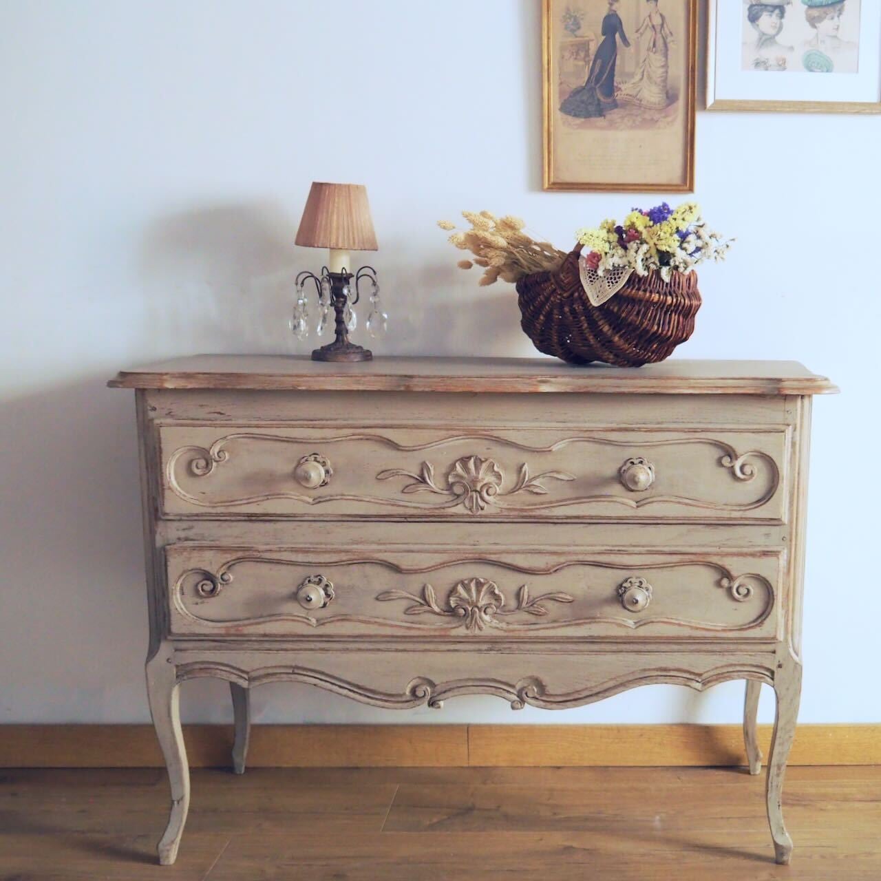 フランスの古き良き風情を纏った、グレーペイントのアンティークチェストです。こちらのチェストは、引き出しが2段あり、機能性とデザイン性を兼ね備えています。美しいグレーカラーは、どんなインテリアにも自然と溶け込み、素敵なアクセントを加えてくれることでしょう。