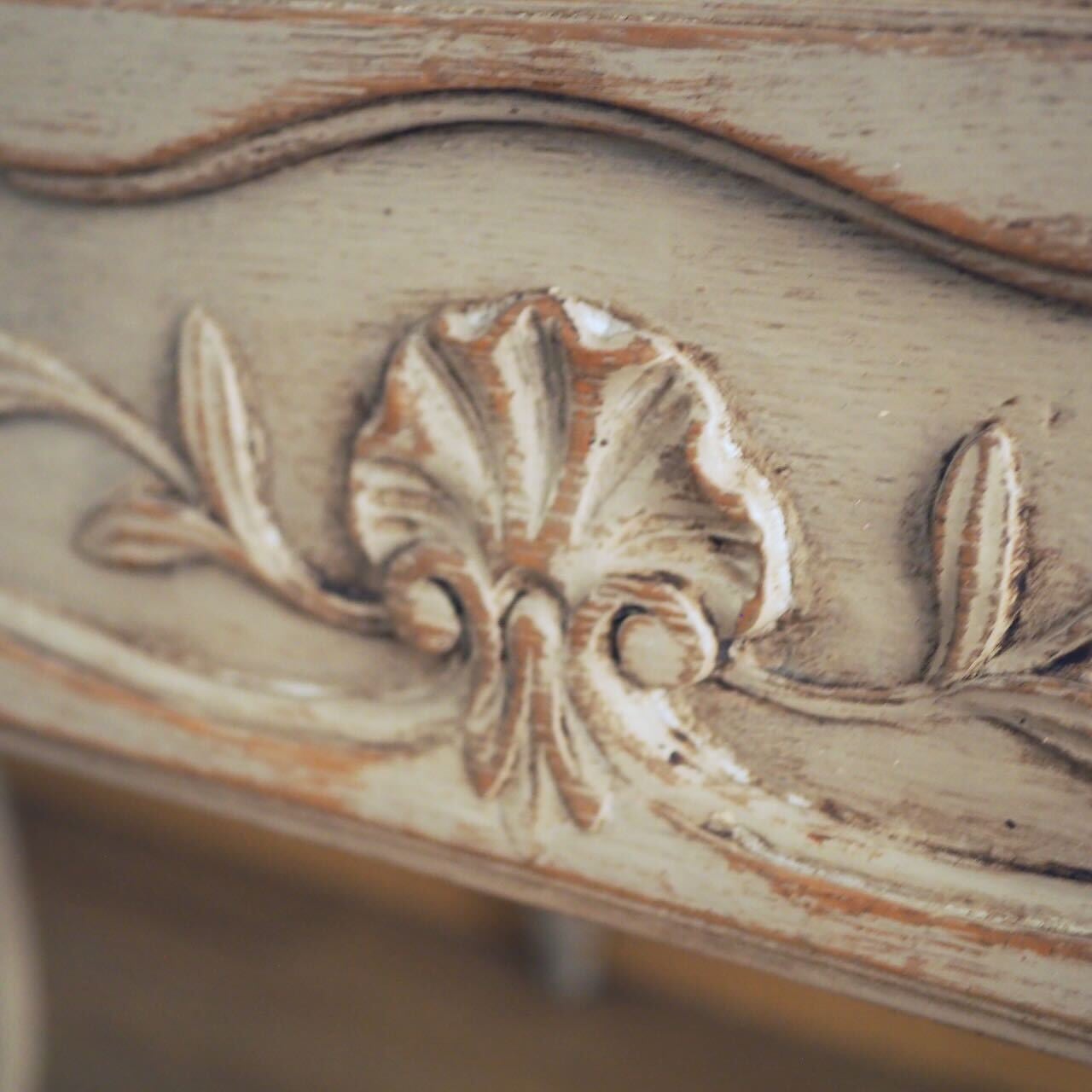 フレンチスタイルの雰囲気を醸し出す本チェストは、そのしっかりとした作りと優雅なラインが特徴です。引き出しに装飾されているのは帆立貝とオリーブの葉でしょうか。平和のシンボルです。そして取っ手のデザインがシンプルながらもエレガントな印象を与え、部屋全体のクオリティを高めます。グレーペイントは、モダンからクラシックまで幅広いテイストに馴染みます。