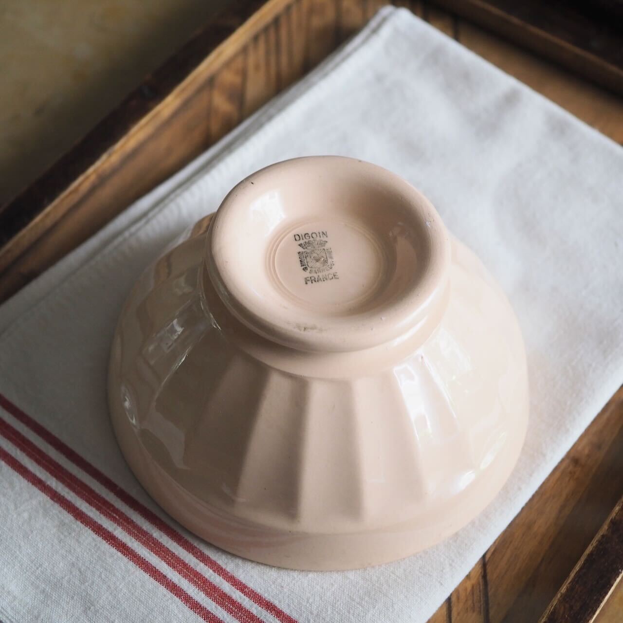 1920 - 1950年に作られたディゴワン・サルグミンヌの究極的デザインのカフェオレボウルです。こちらはなんともやさしい色合いのパウダーピンクですが、フランスではこういう白っぽい薄ピンクをローズ・パールと表現します。写真でうまく伝わるかわかりませんが、絵柄がないぶん、このやさしさがストレートに伝わり、とてもなごむカフェオレボウルなのです。凹凸による光の陰影で違う表情を見せてくれます。