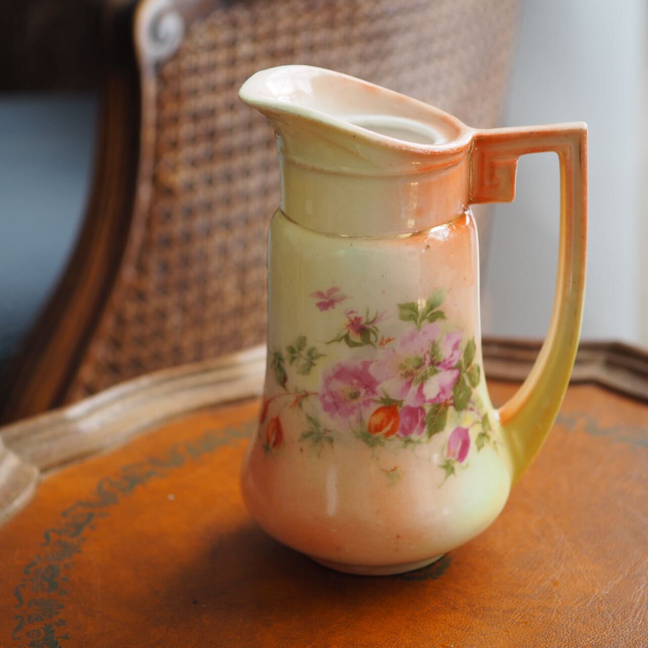 オレンジ色のグラデーションに花の絵がプリントされたビンテージピシェです。花やグリーンをさりげなく飾ったりするのにちょうどいい大きさです。レトロな雰囲気が新しい!