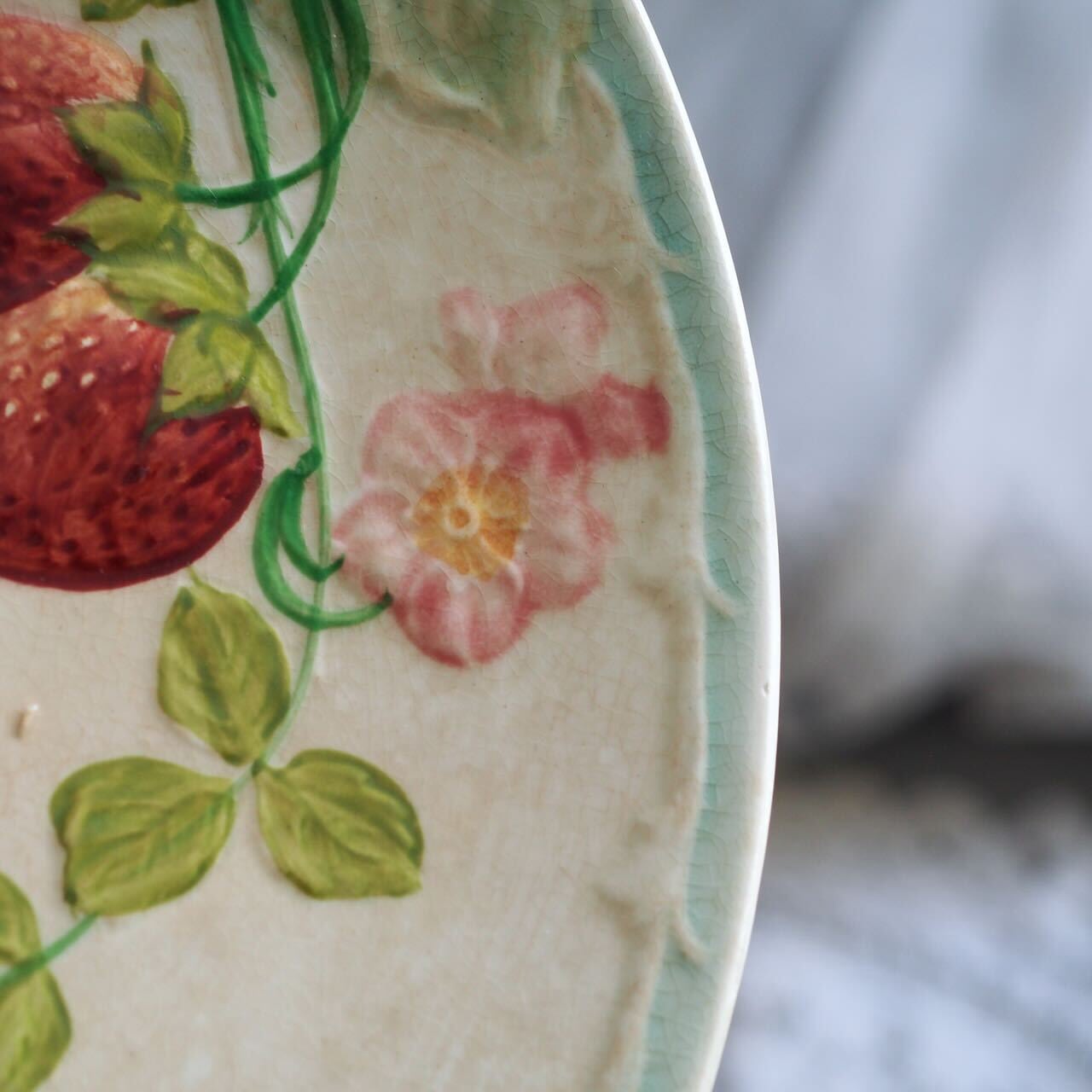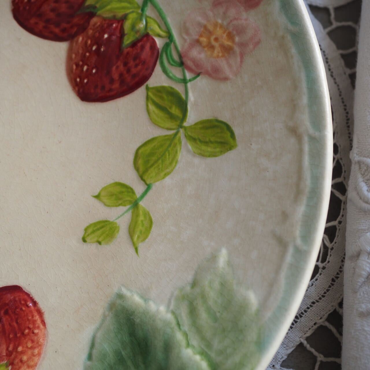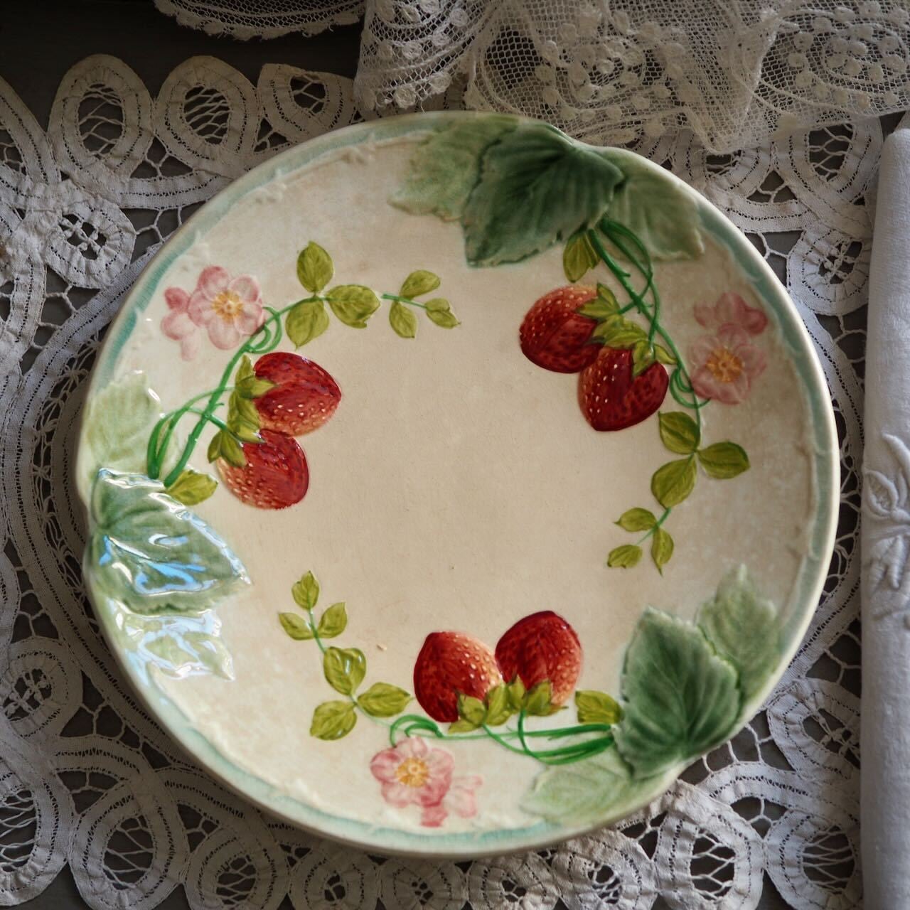 バルボティーヌとは、粘土を含む泥漿(でいしょう)を成形した陶器。こちらはいちごがモチーフになった愛らしいプレートです。果実だけでなく、淡いピンクの花が添えられているのが最高にかわいい!