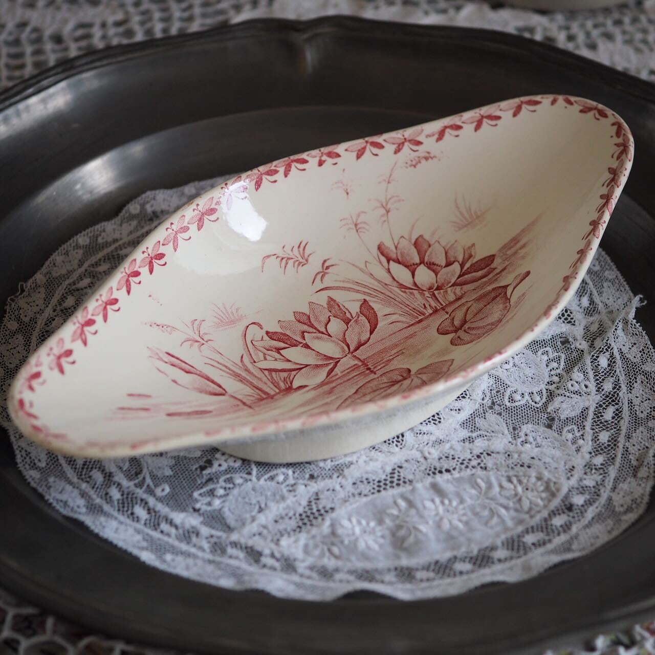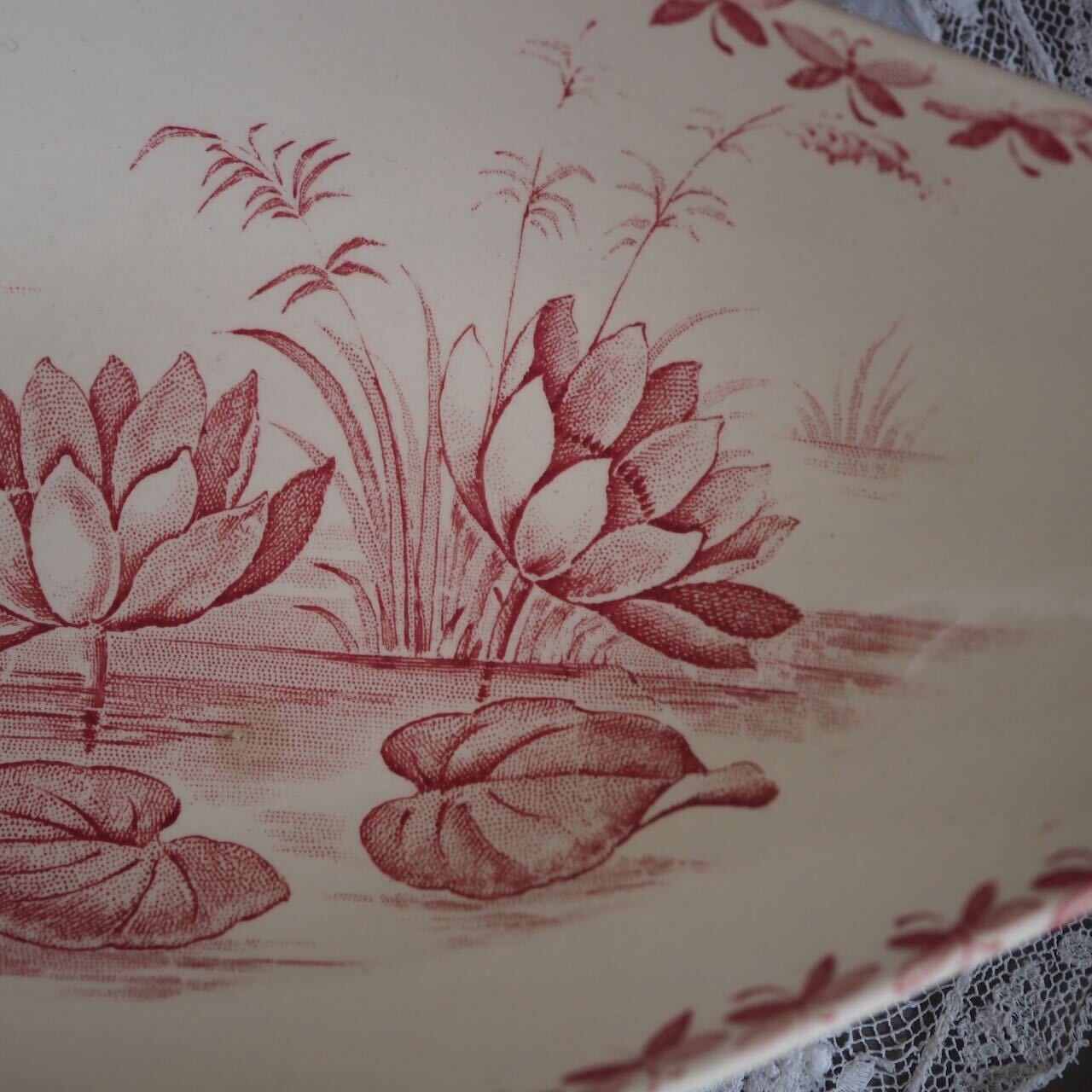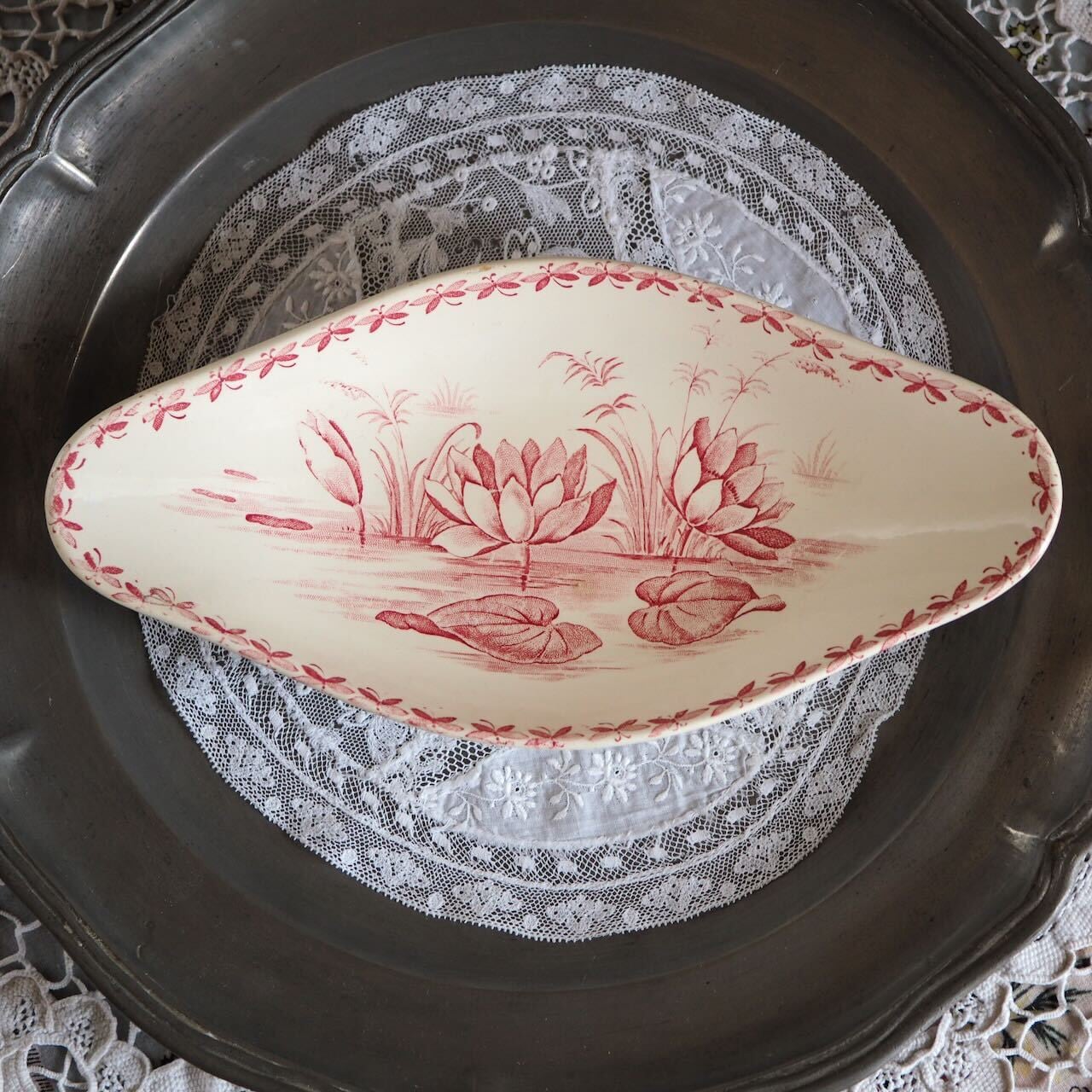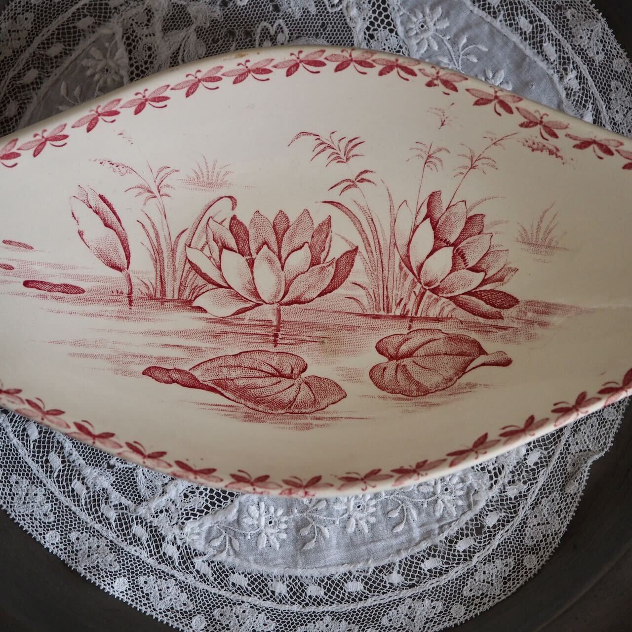 とても100年前に作られたと思えないラヴィエ(オーバル皿)です。フランスのバドンヴィレー窯。絵柄を横に配置した構成は珍しく、それが睡蓮にぴったりで素敵です。