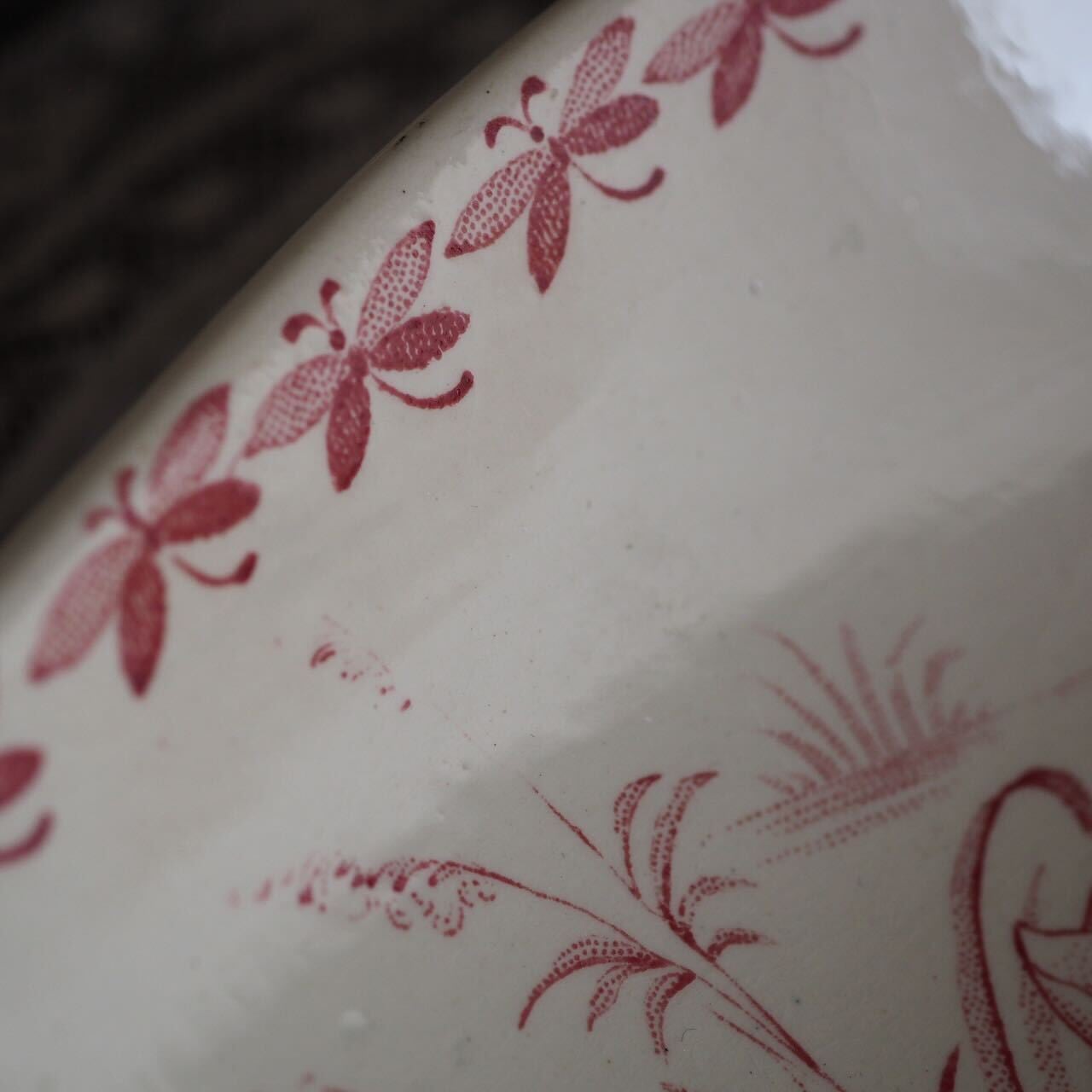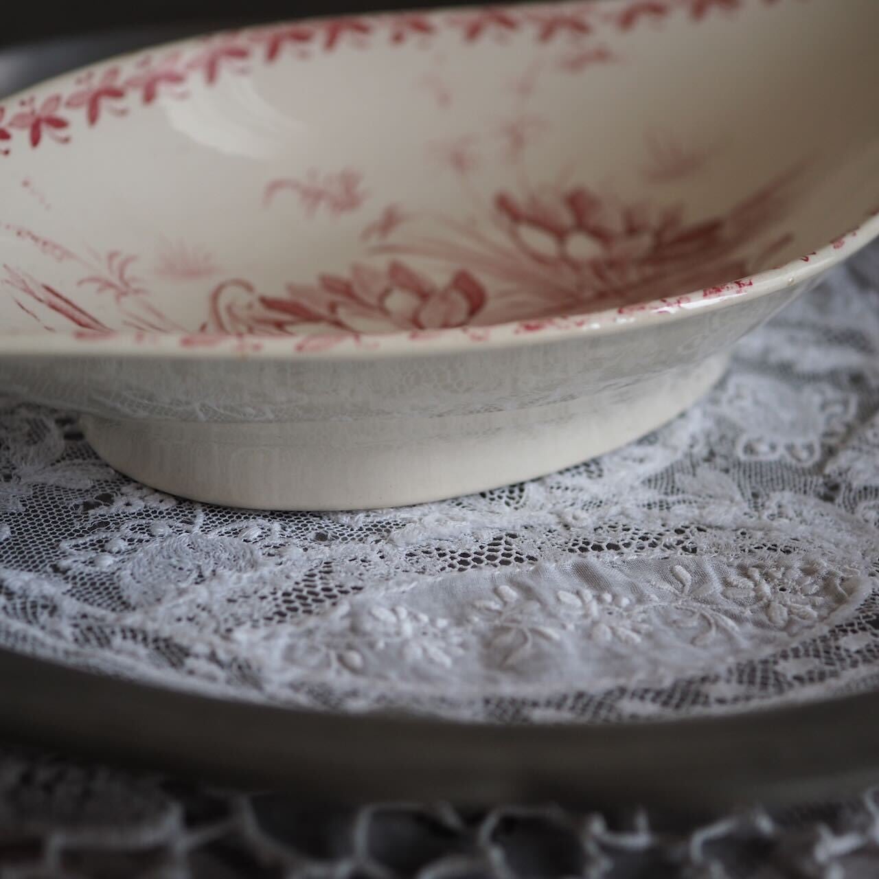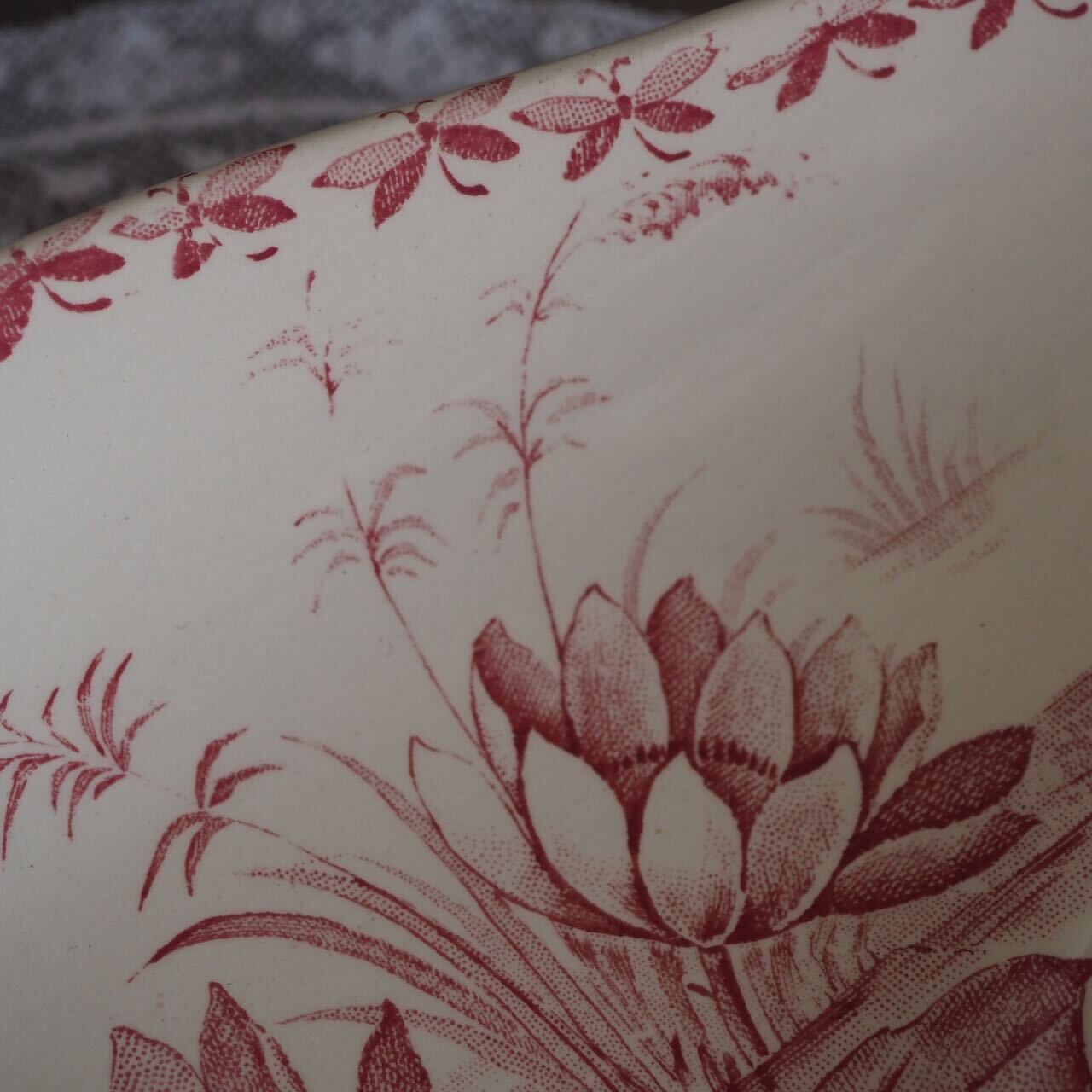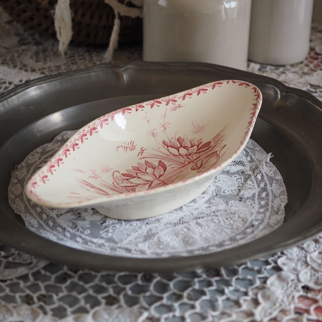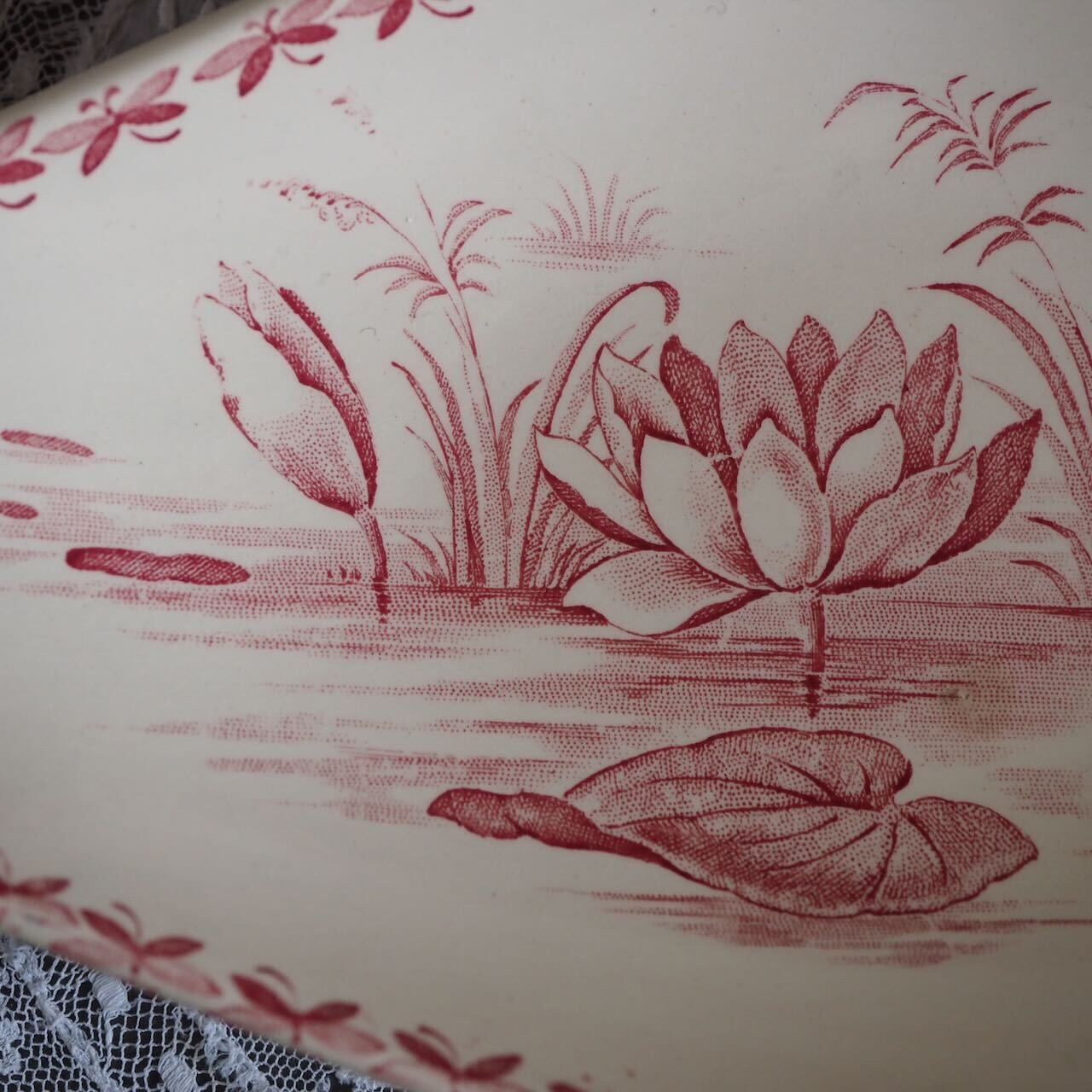 とても100年前に作られたと思えないラヴィエ(オーバル皿)です。フランスのバドンヴィレー窯。絵柄を横に配置した構成は珍しく、それが睡蓮にぴったりで素敵です。