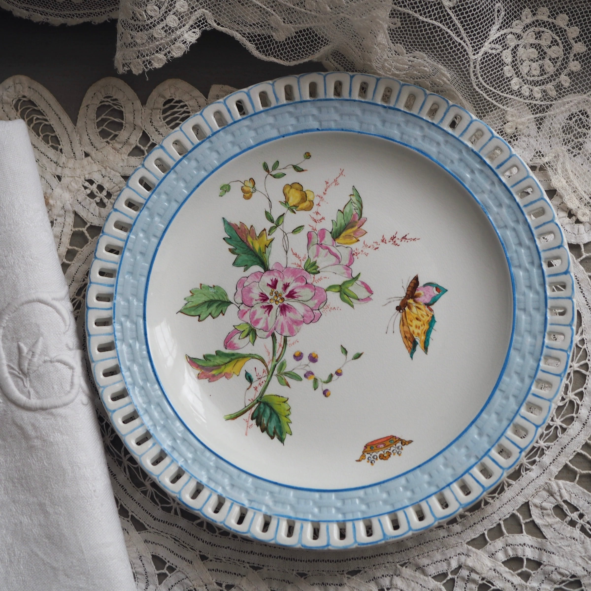明るいブルーで縁取られた最高に美しいアンティークプレートをご紹介します。花々と蝶が描かれたカラフルなハンドペイントの色付け絵皿です。透かし模様とパニエ模様。ため息ものの芸術品です。