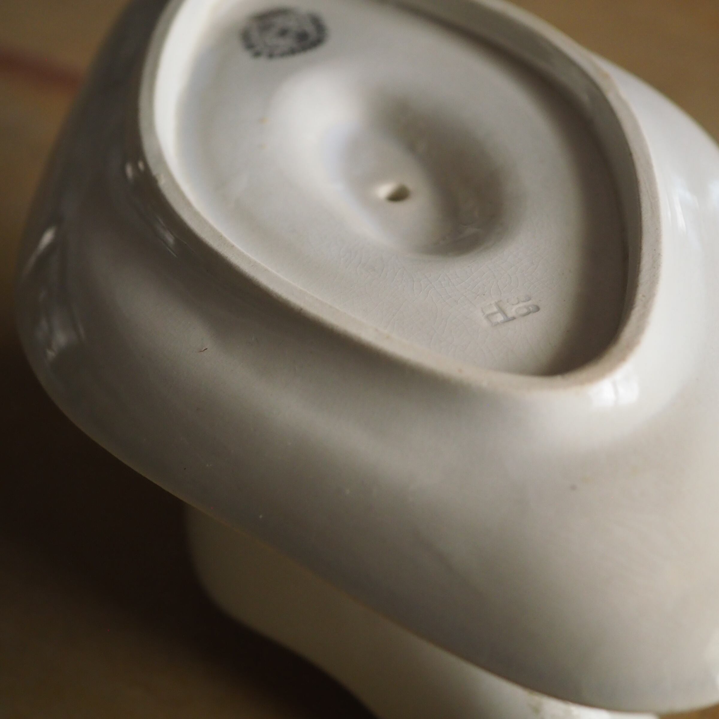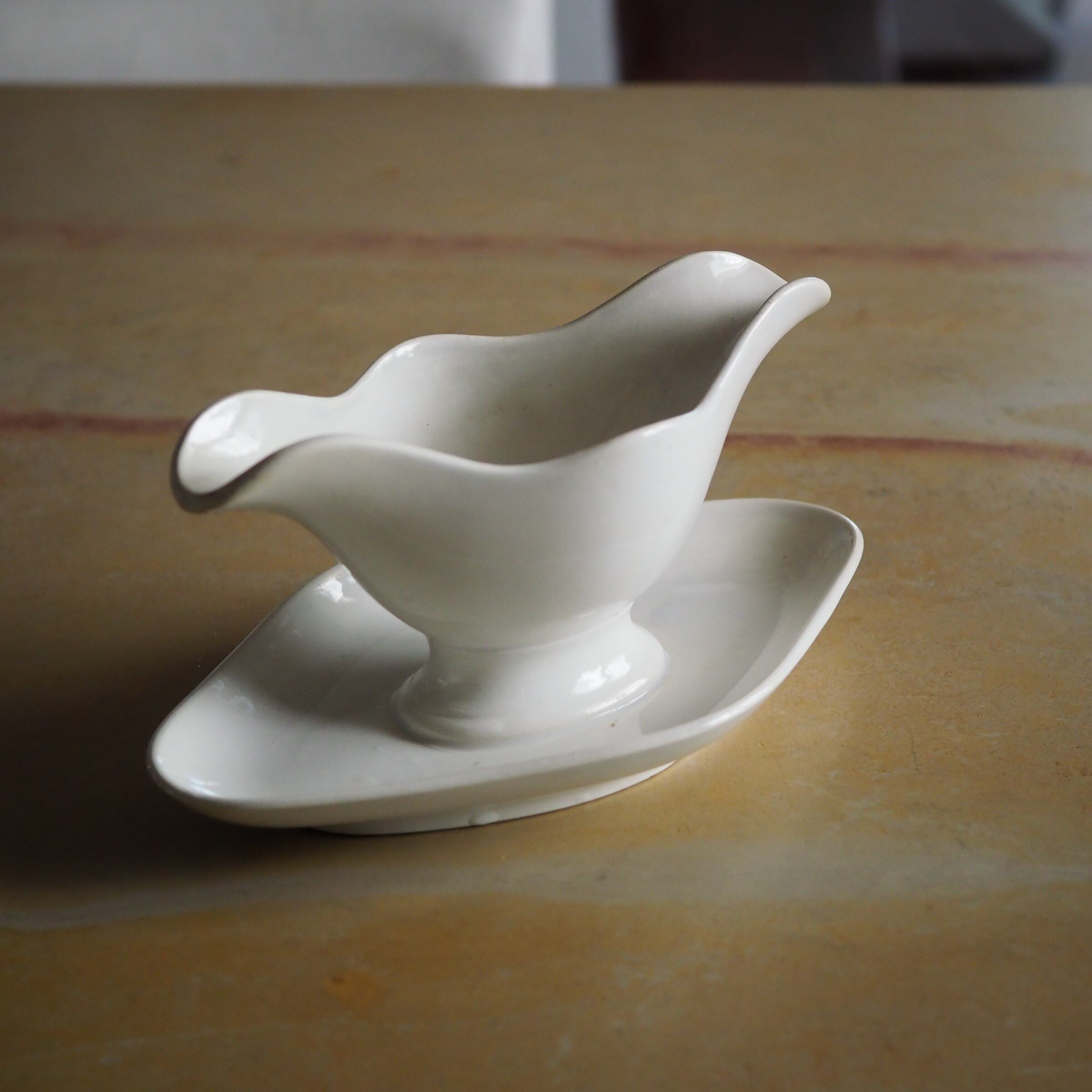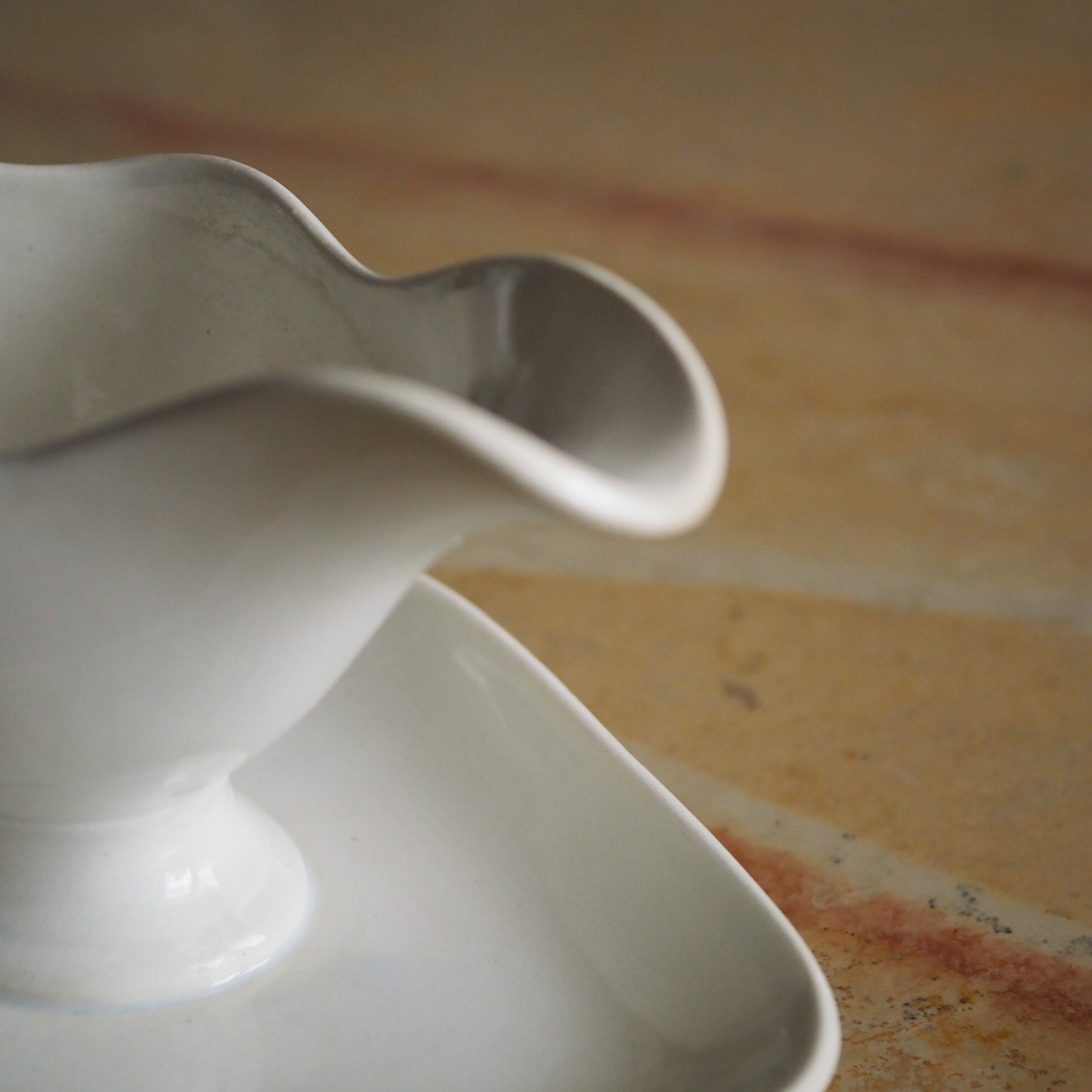 白一色の美しいソーシエールです。ディゴワン・サルグミンヌの19世紀後半に作られたアンティークの器です。流れるようなラインにフランスのエレガンスを感じます。