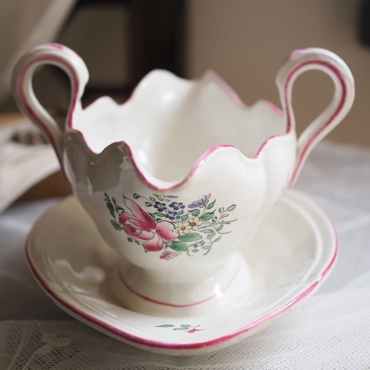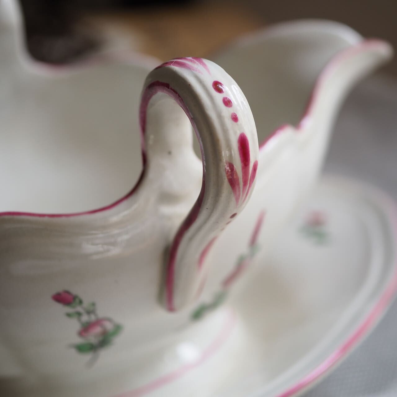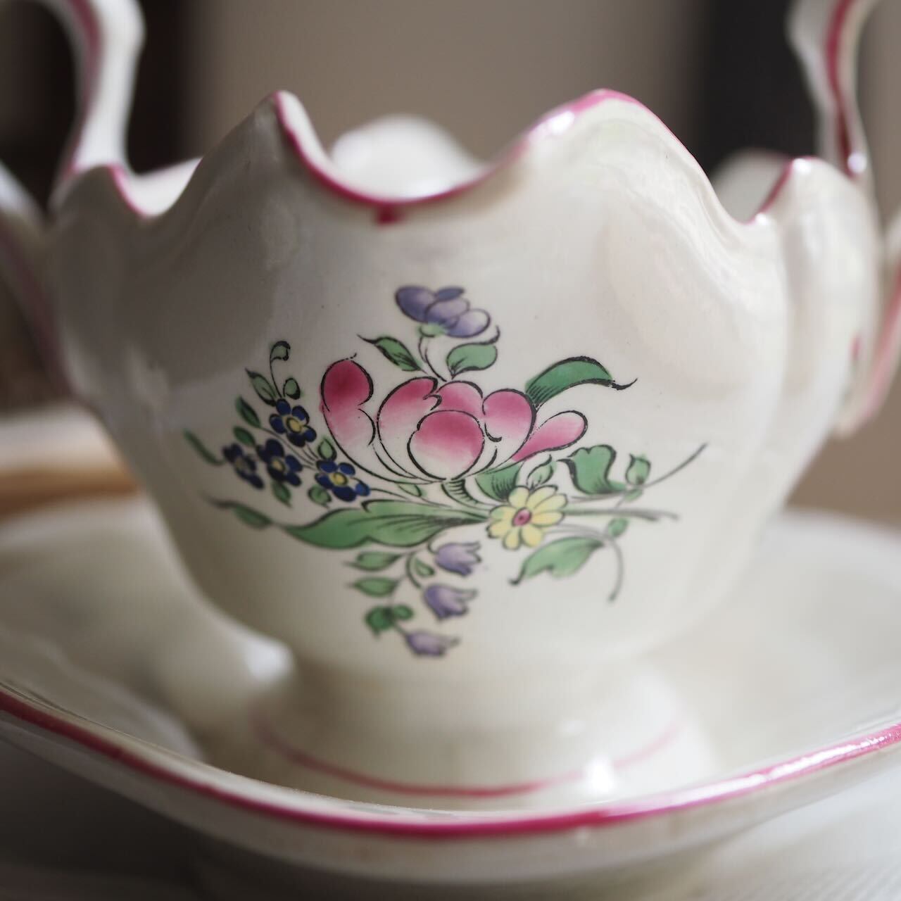 19世紀のリュネヴィルのソーシエールをご紹介します。とびきりキュートなピンクの縁取りバージョンで、状態も良好です。絵柄にもチューリップとバラと小花で変化があり、眺めているだけで幸せです