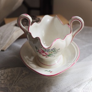 受け皿は一体型。もとはソースをテーブルでサーブするための専用の器ですが、現代では花を飾るのによく用いられています。ソースを注ぐための両端の形状が花をうまくキャッチしてくれるので、花がきれいにまとまります。