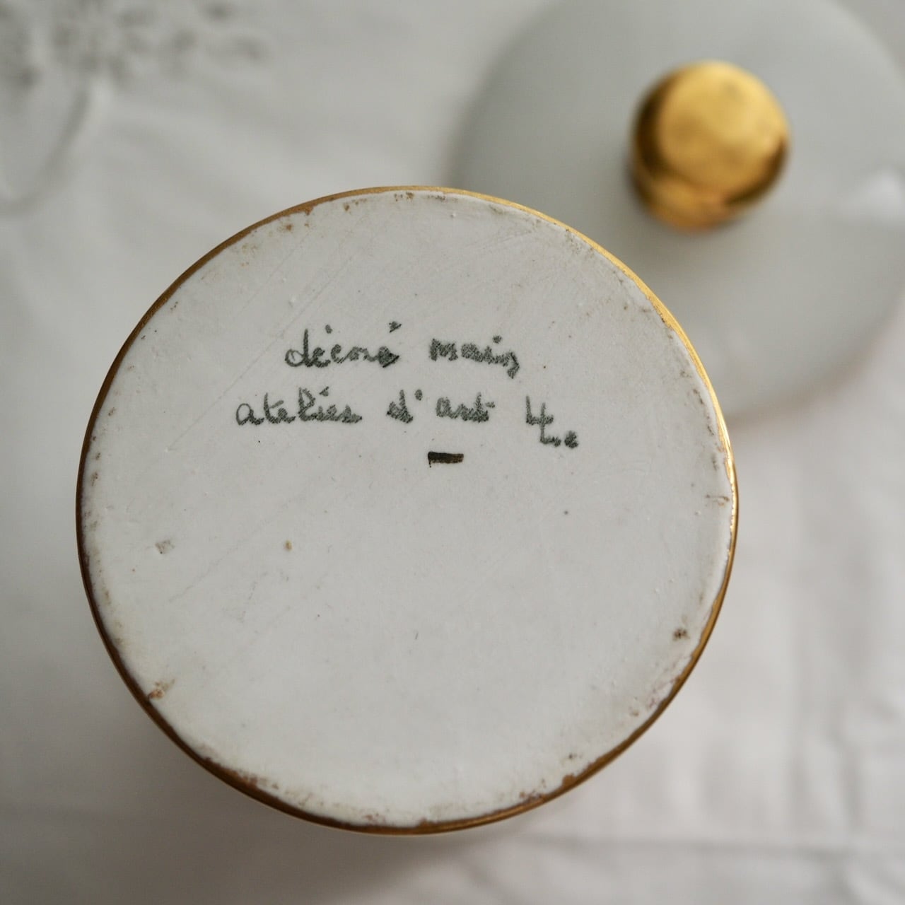 ブロカント市で見つけた、ポルスレーヌ(磁器)の小物入れです。窯はわかりませんが、裏に「ハンドペイント」と手描きで書かれています。
