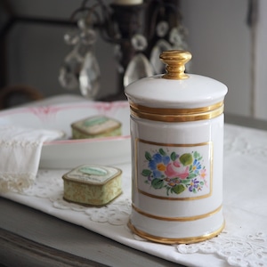 真っ白な磁器に品のいいゴールドのライン、中央にブーケが描かれています。まさに女性のバスルームのために作られた逸品です。