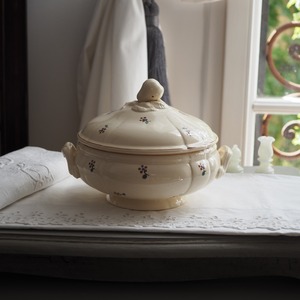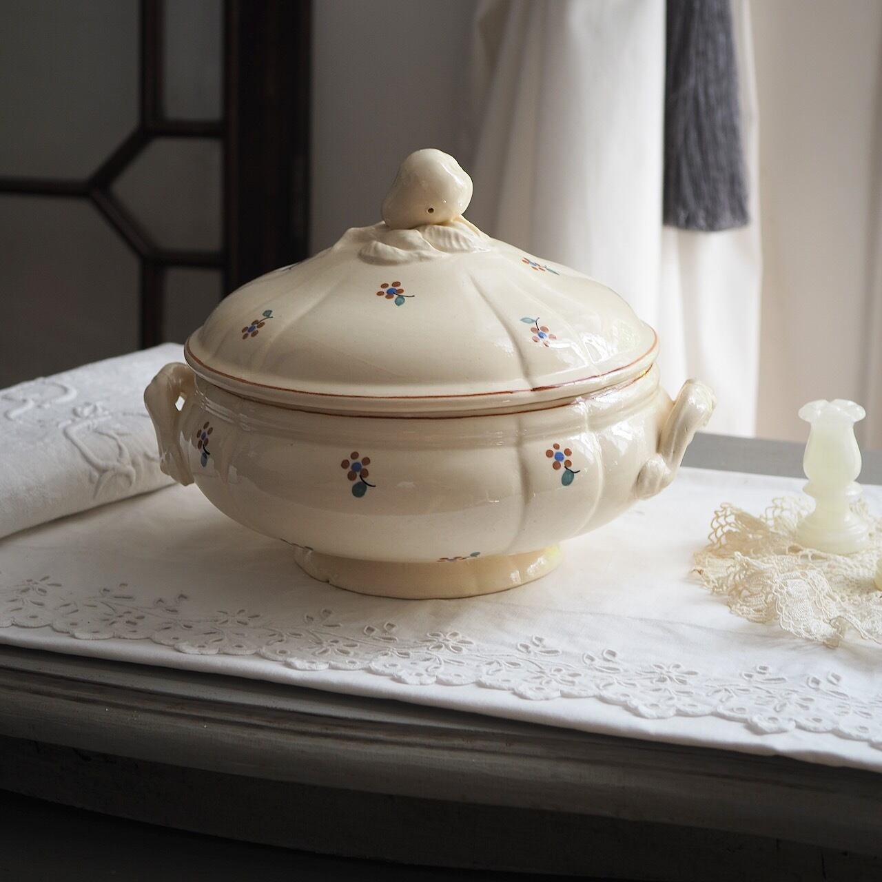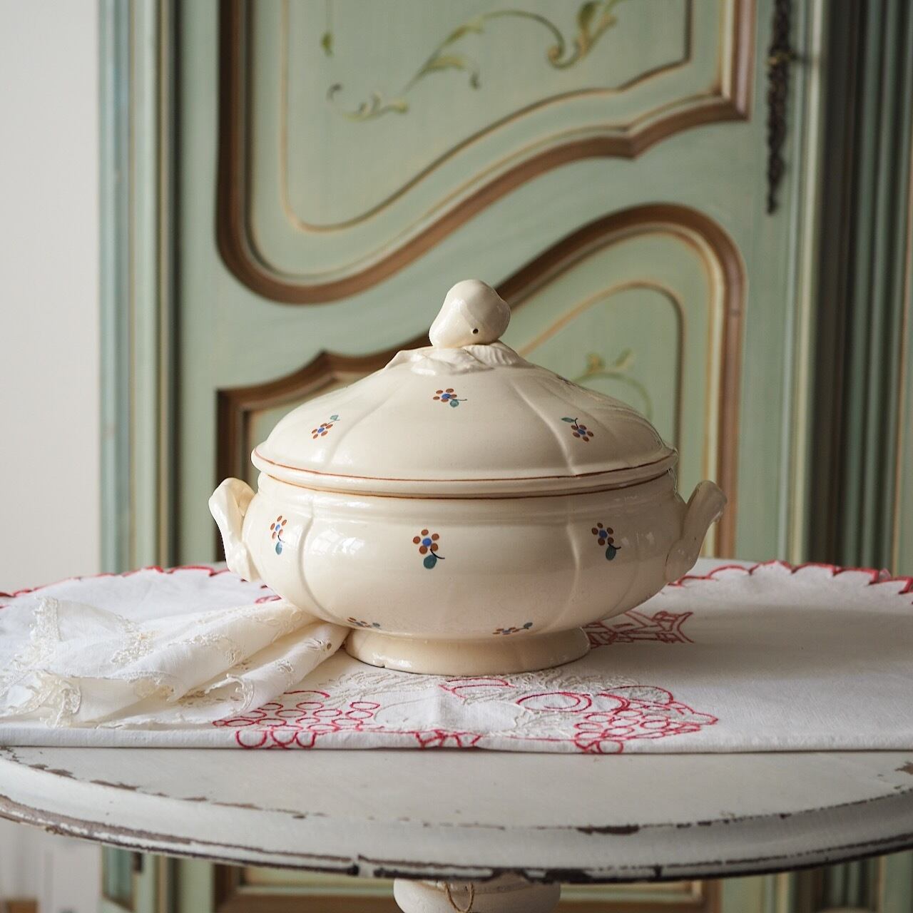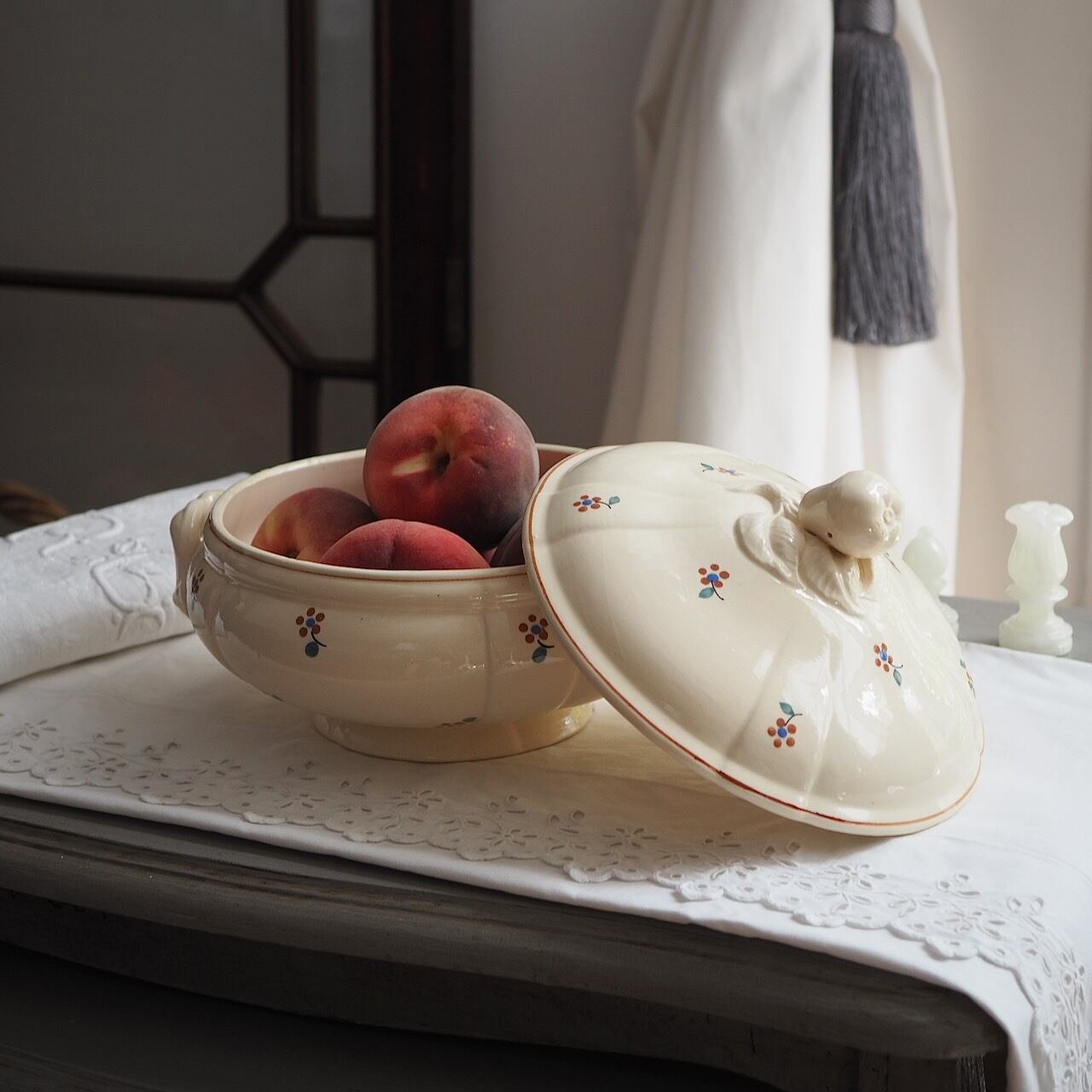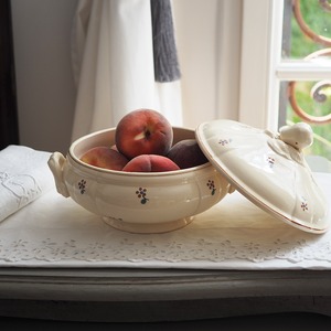 もとはスープを入れて、テーブルでサーブするための器ですが、大家族が少ない現代ではフルーツや野菜などを入れる人が多いです。お気に入りのトルションやレースなどを入れても素敵。蓋つきなので、埃除けにもなります。