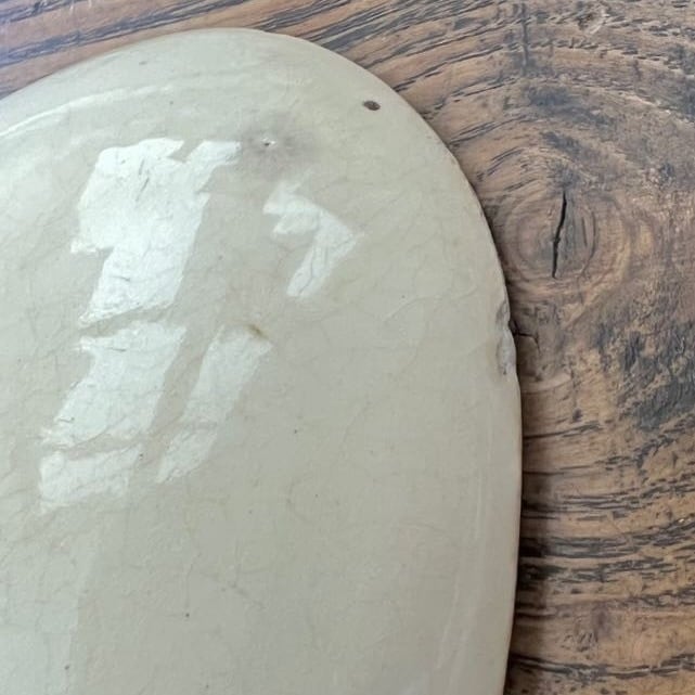 貫入からのシミがうっすら入っています。150年ほど前に作られたものなので、なんともいえない時の重みが感じられます。一か所ヘアライン、縁裏に一か所チップあるのでお安くなっています。