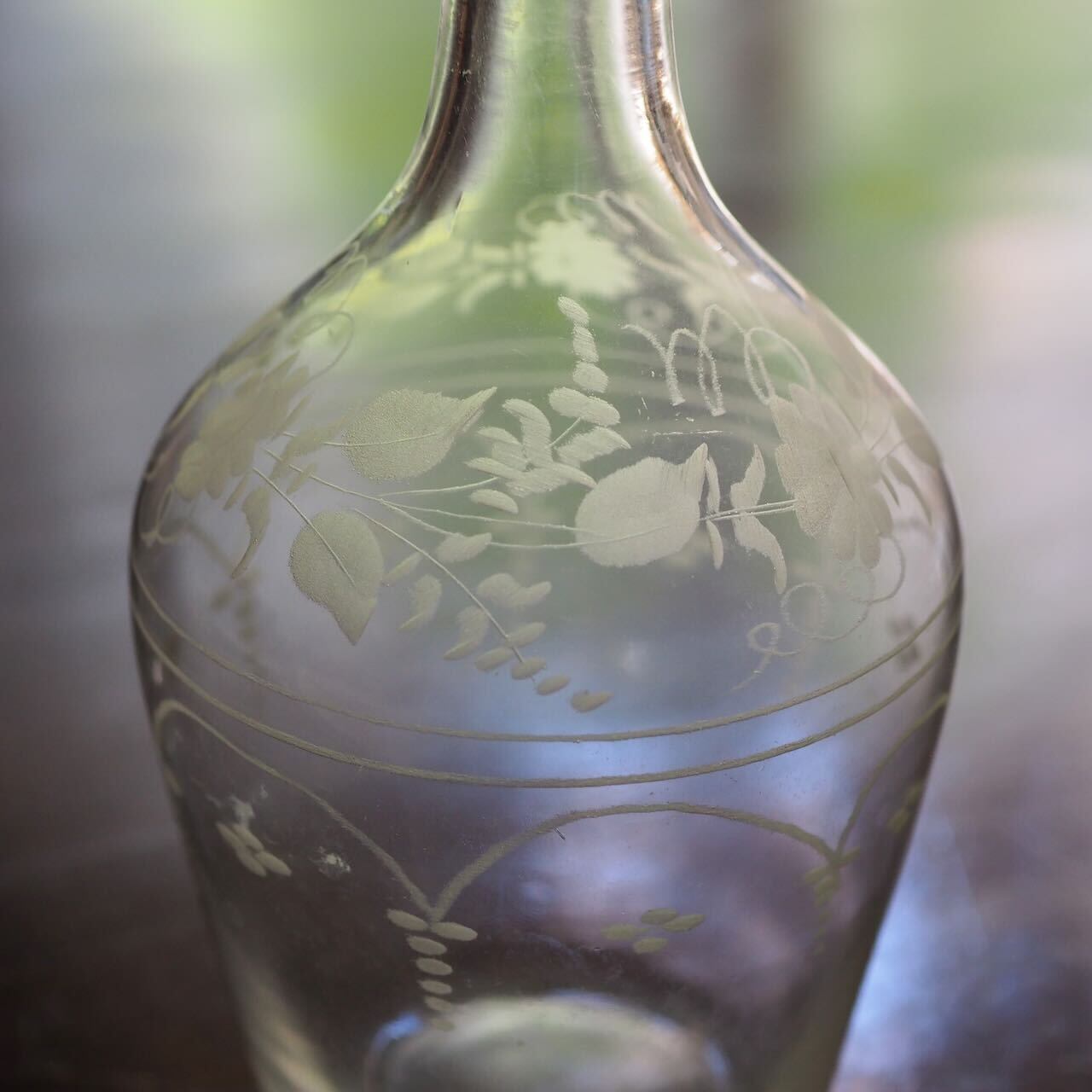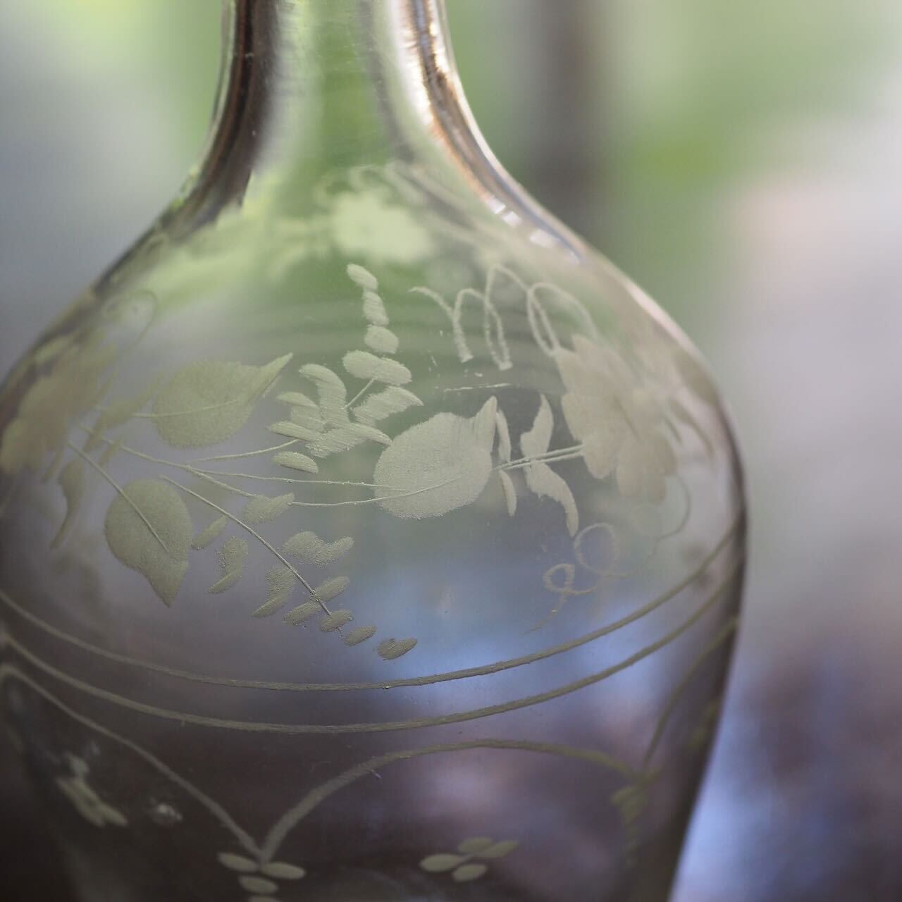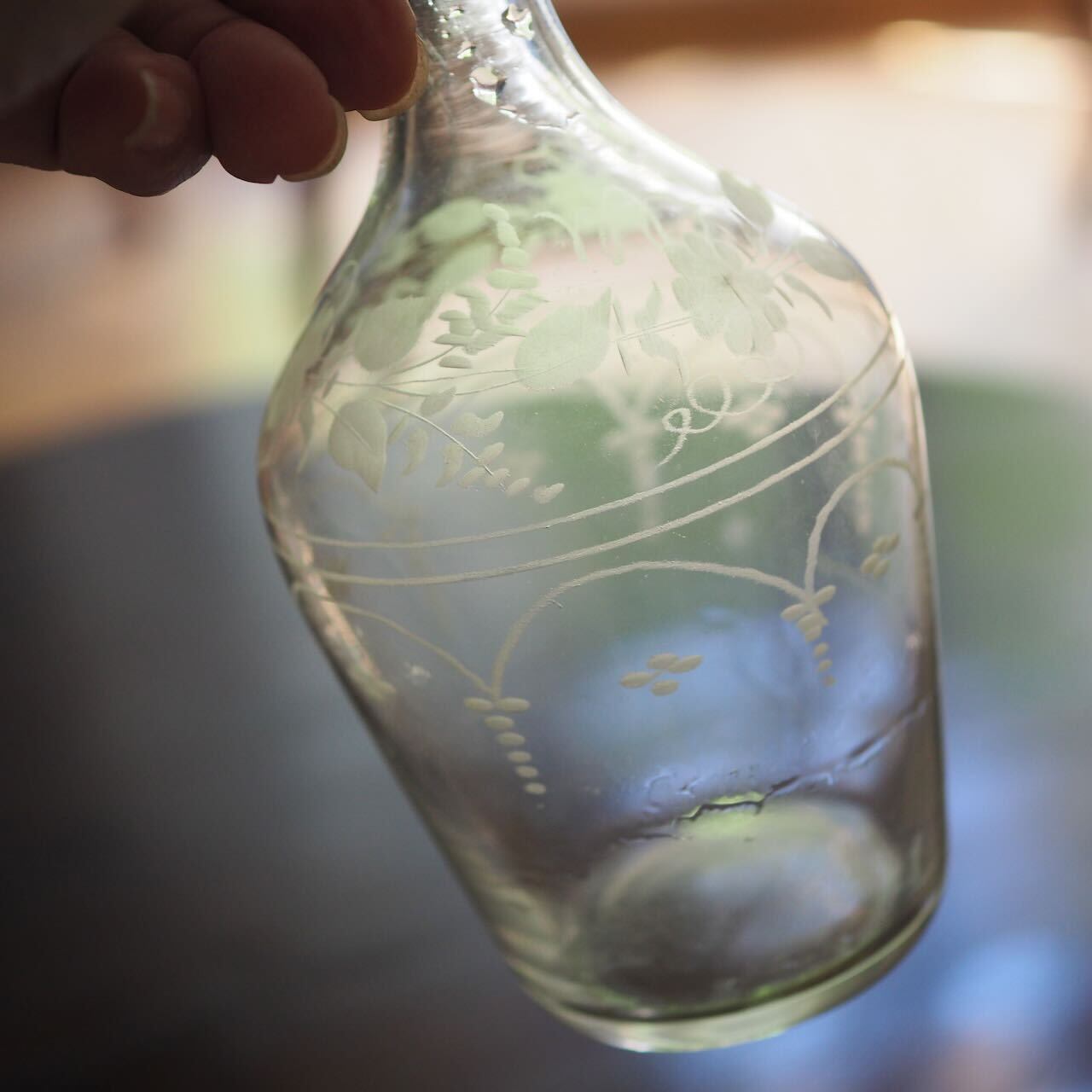繊細な植物文様が入っている美しいカラフです。リビングや窓辺にグリーンをさりげなく飾ってみたいガラス器。