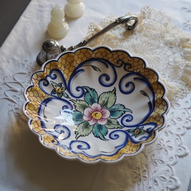 こちらはフランスのブロカントで見つけたもの。カラフルなハンドペイントが南欧の雰囲気たっぷり。ポルトガルのタイルで彩られた古い建物を彷彿とさせます。