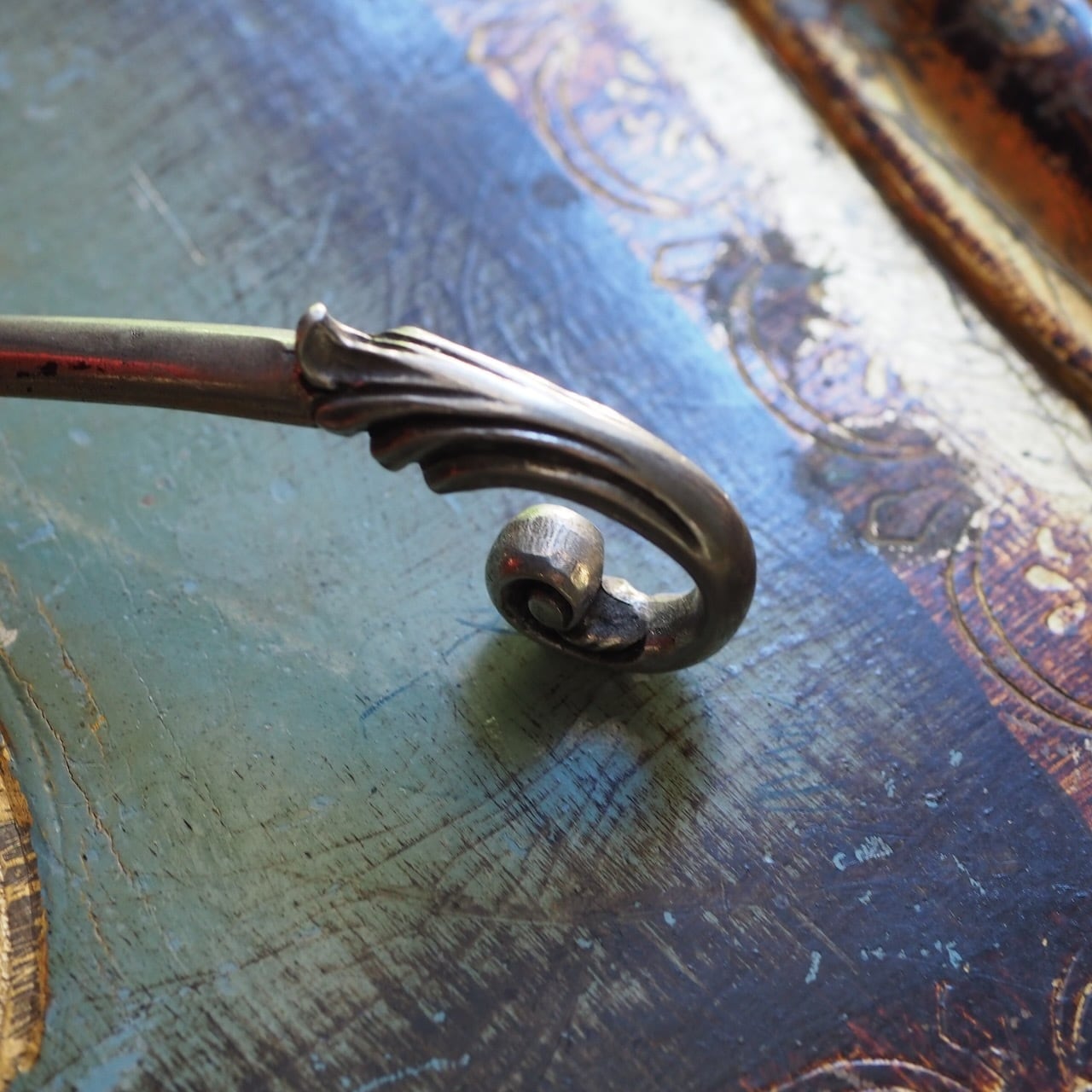 フランスのアンティーク、ピューター製キャンドルスナッファー。小さなベルのようなデザイン部分をキャンドルの火にかぶせて、煙を最小限にして消すための道具です。
