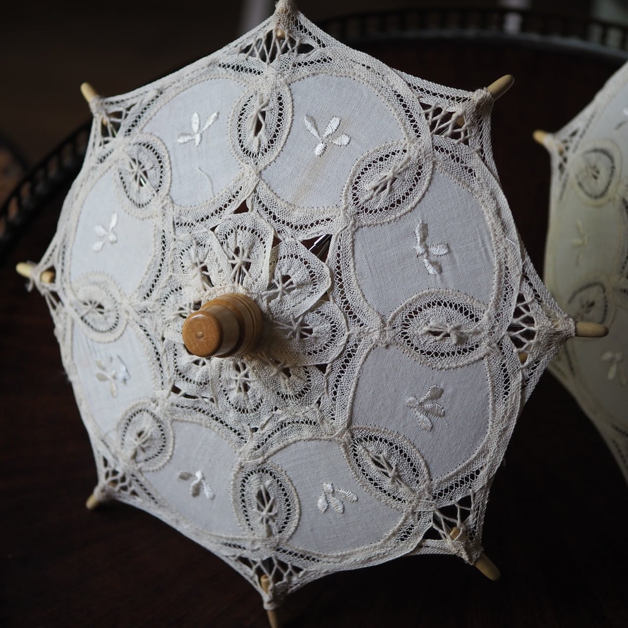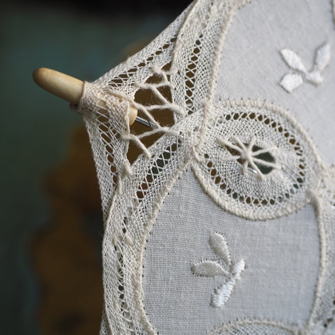 繊細な刺繍と透かし模様が美しく、木製ハンドルの温かみが素敵。