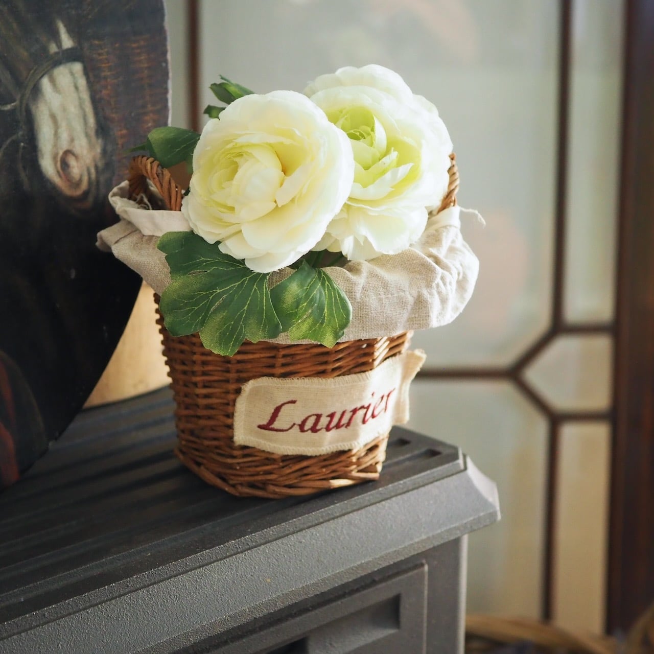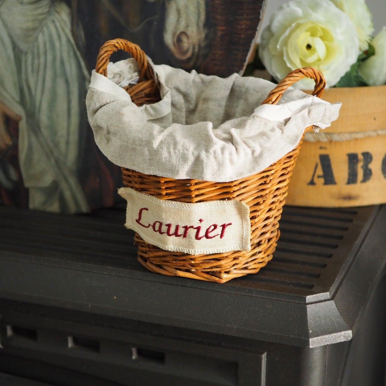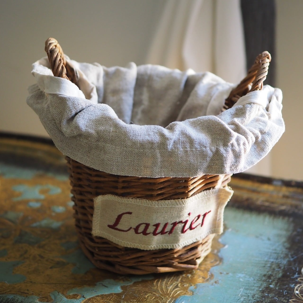 フロントには赤い刺繍文字で「Laurier(ロリエ・月桂樹)」「Thym(タイム)」と書かれています。ハーブ用バスケットですが、花を飾っても。