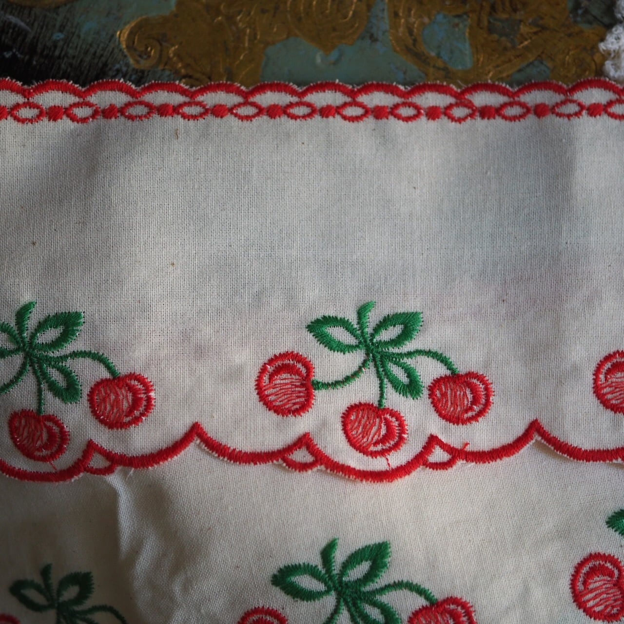 赤と緑でさくらんぼが刺繍された、かわいらしいデザイン。