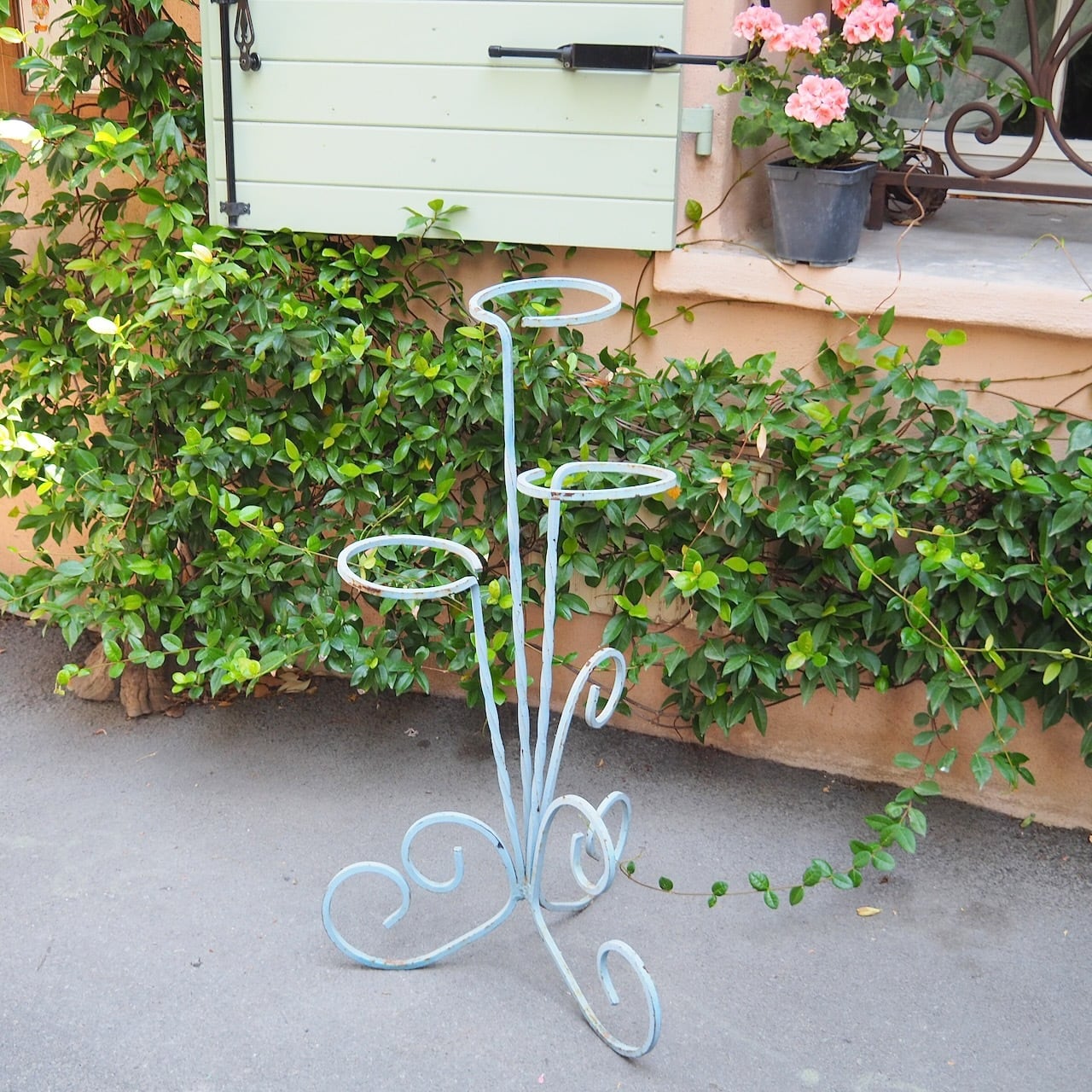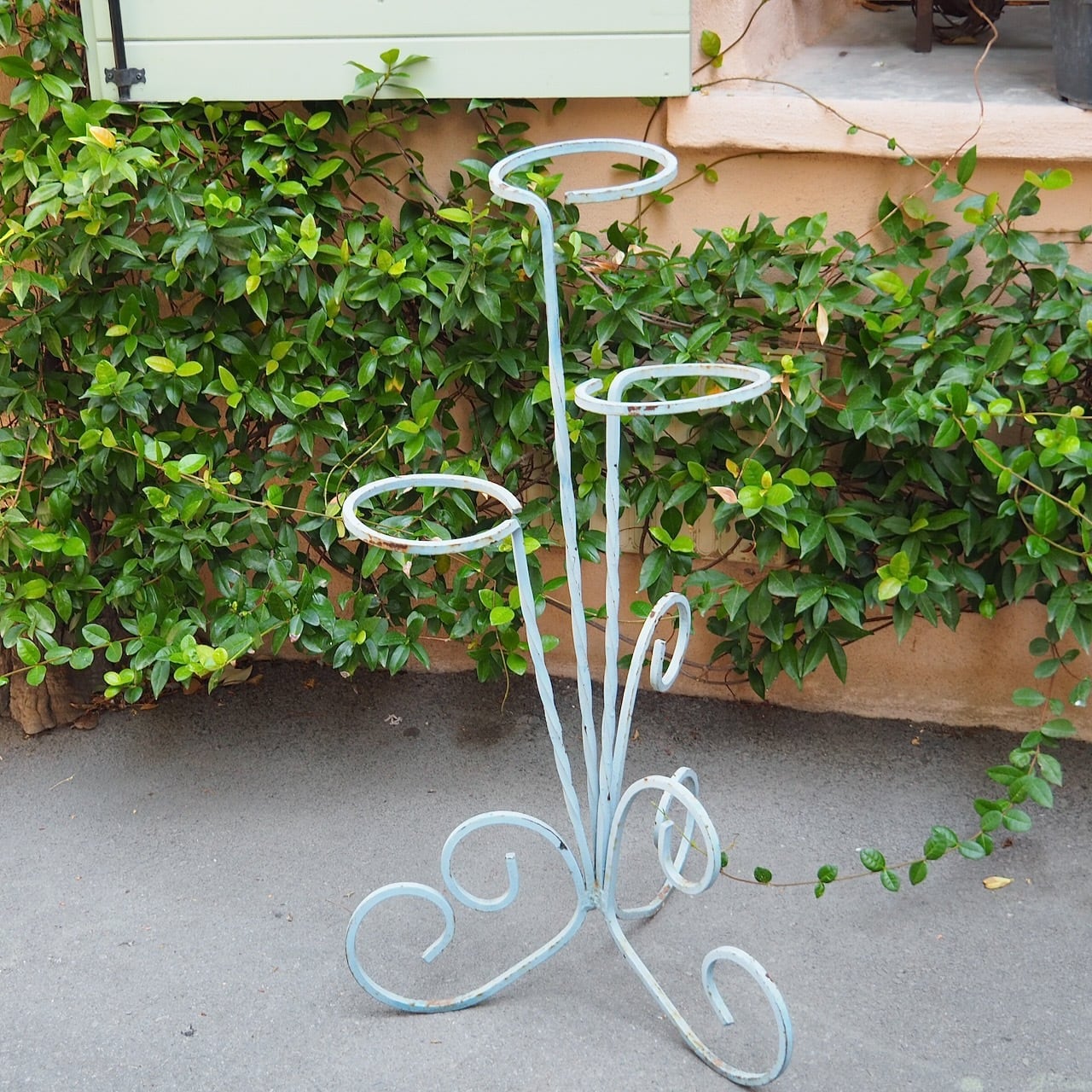 南仏プロヴァンスのブロカント市で見つけた、淡いアクアブルーの色調が爽やかな3段タイプのフラワースタンドです。曲線を描くアイアンの脚が優美で、空間に軽やかなリズムを添えてくれます。