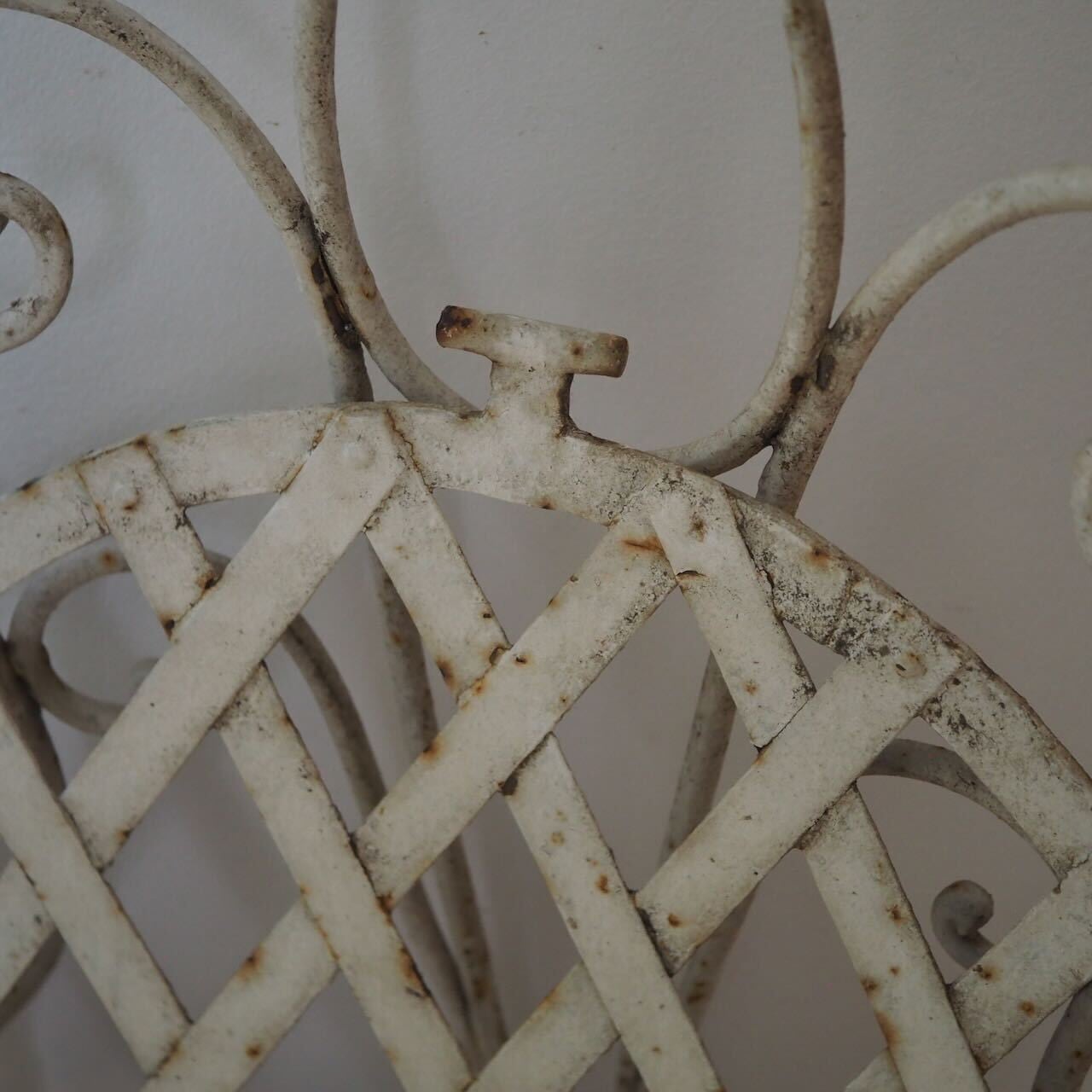白いペイントがやさしく剥がれた、古い折りたたみ式のアイアンチェア。