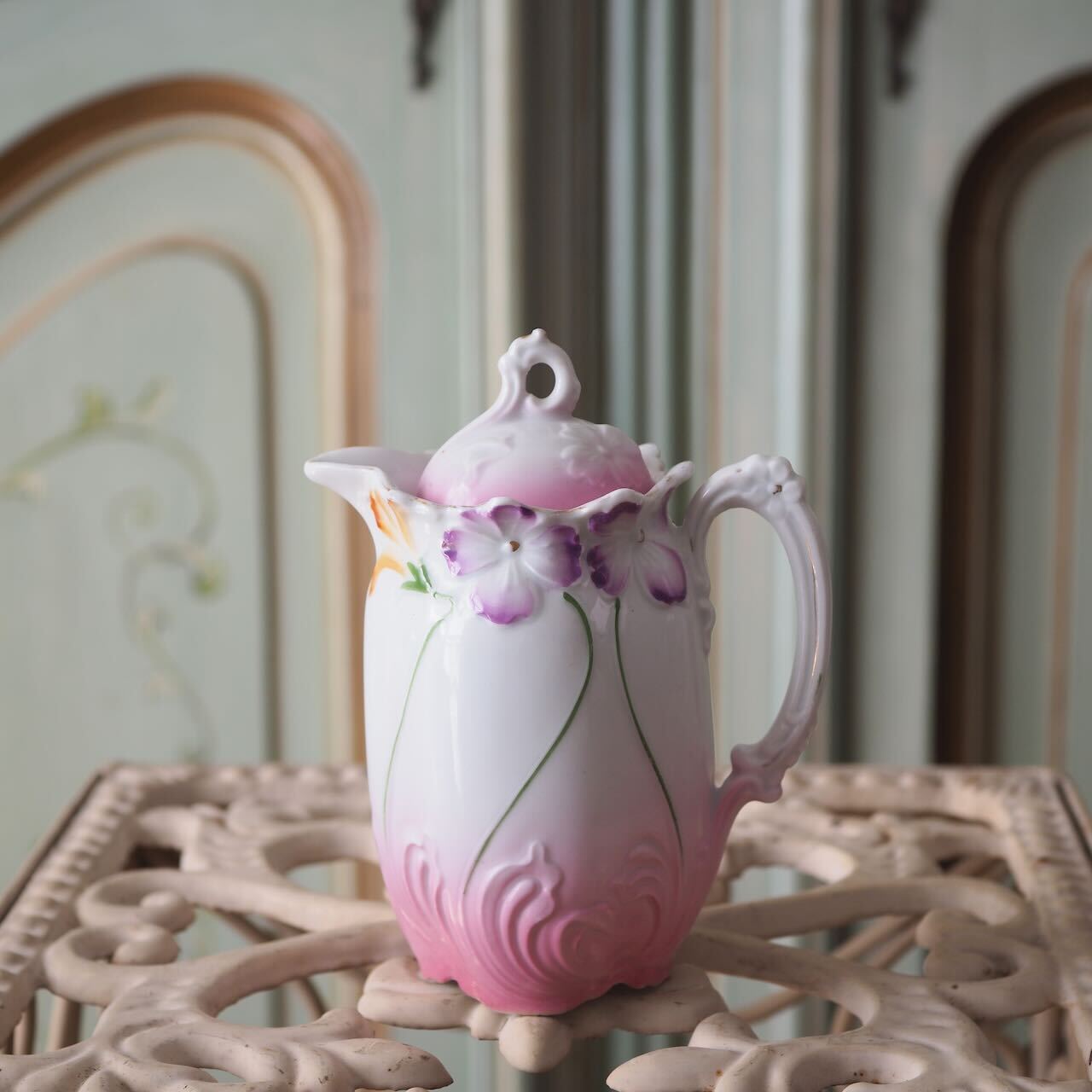 フランス南西部のブロカント市で出会ったビンテージピシェです。ピンクのグラデーションが愛らしく、2輪の花のデザインがアール・デコでとてもおしゃれ。後ろ姿は1輪だけ、というのも素敵です。
