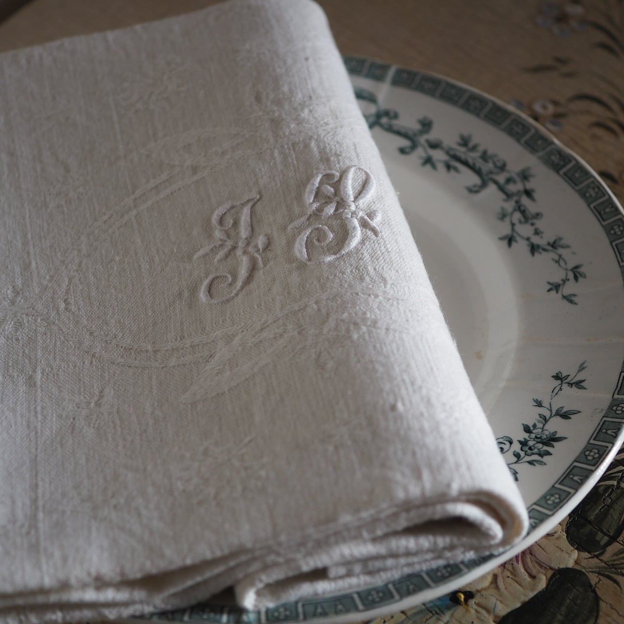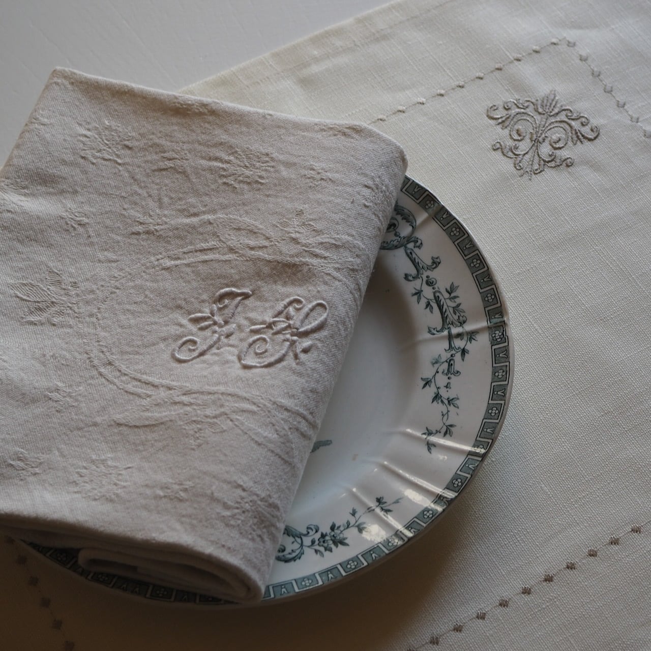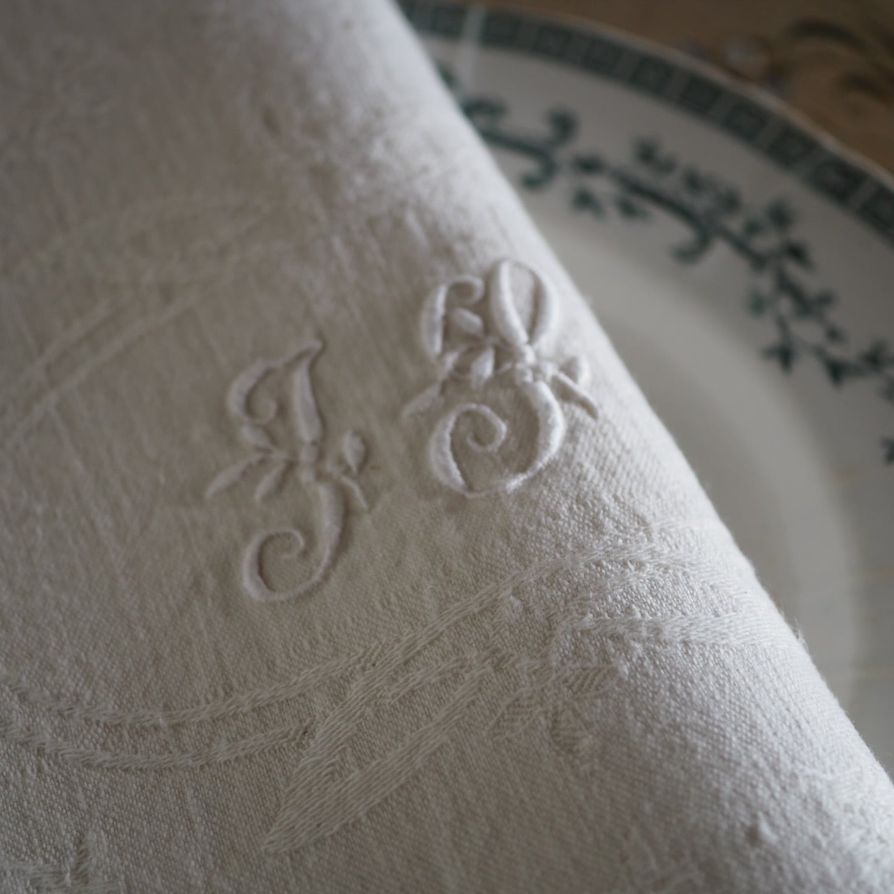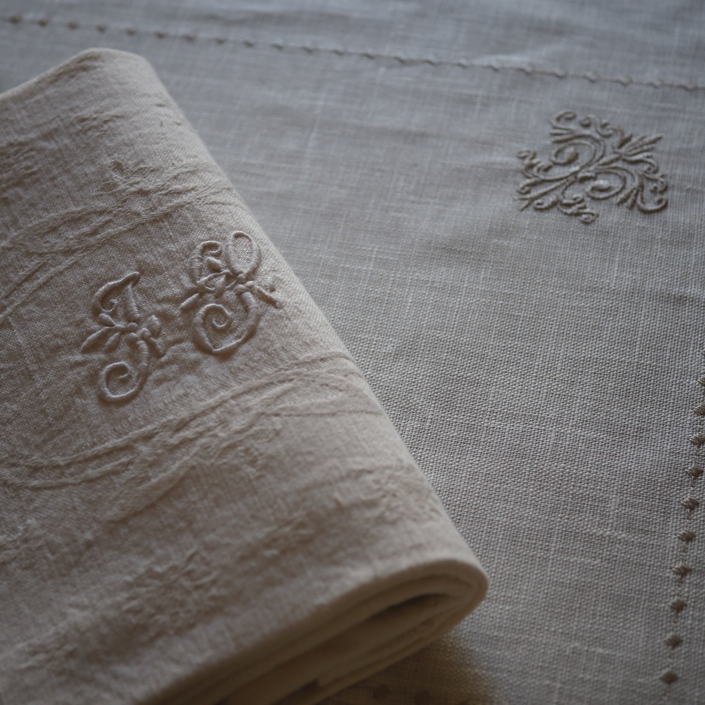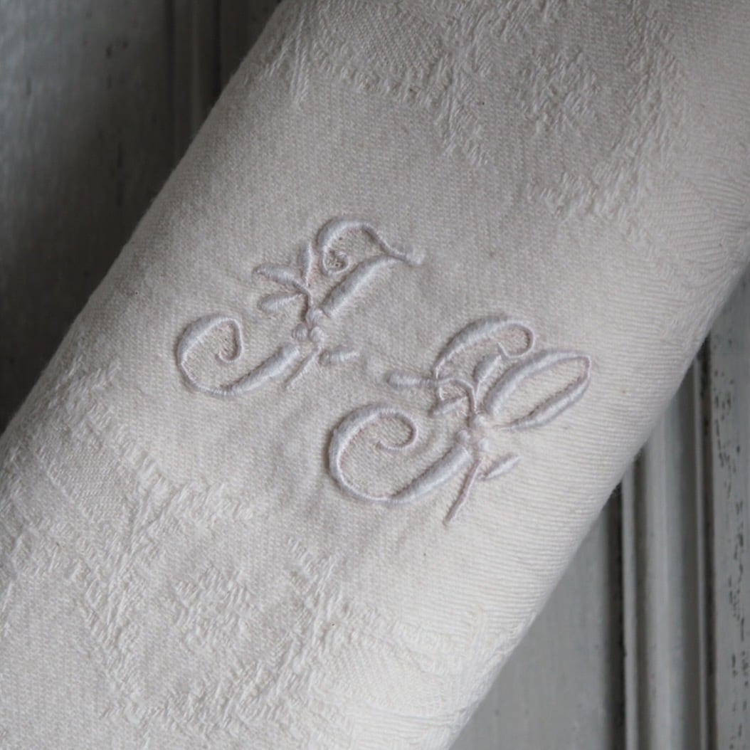 手刺繍のモノグラムが美しい、生成りの大判セルヴィエット。手触りがとてもやわらかいリネンです。