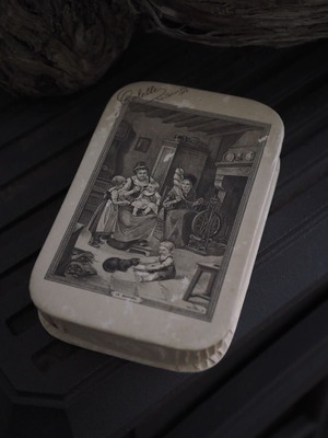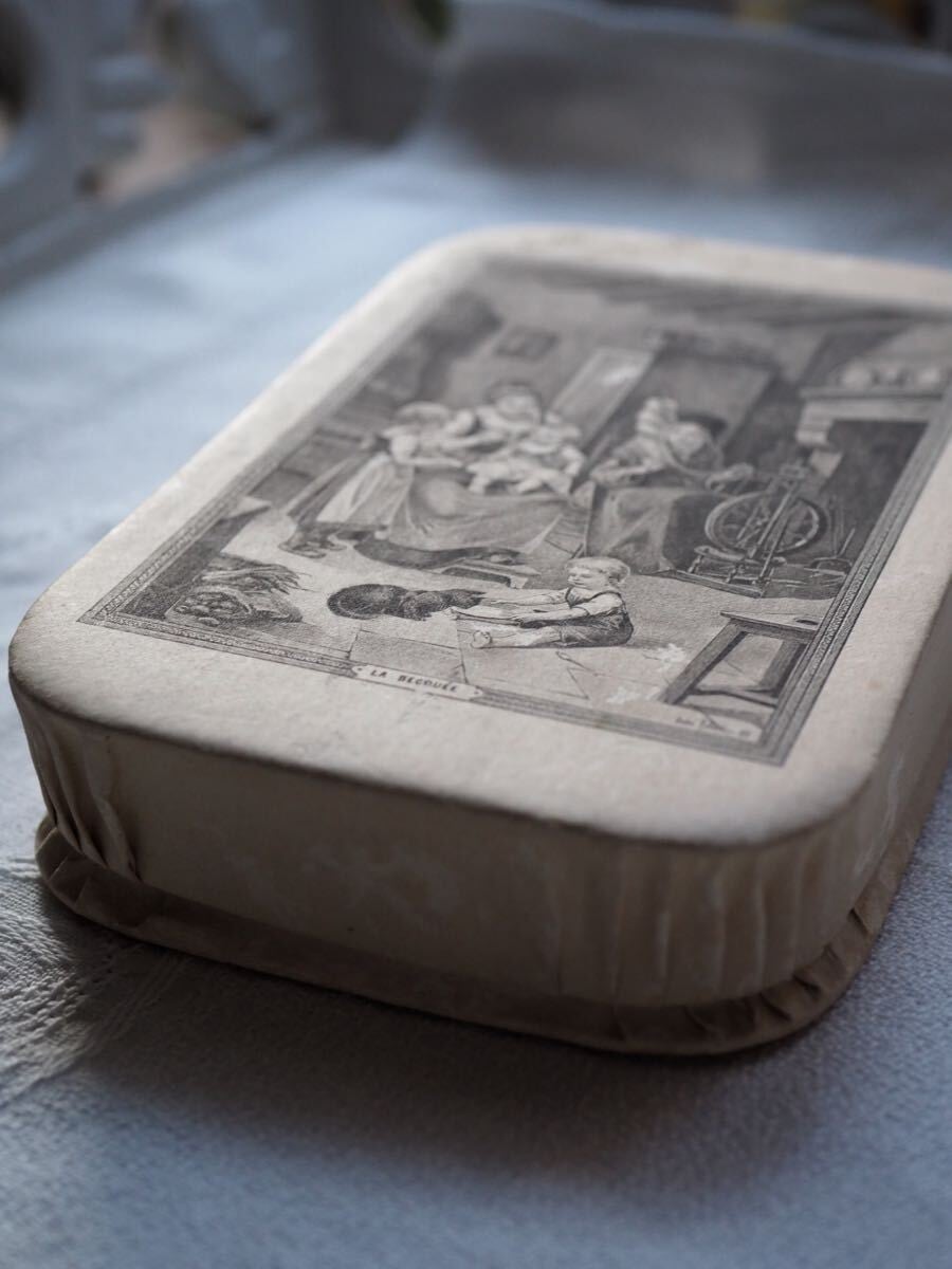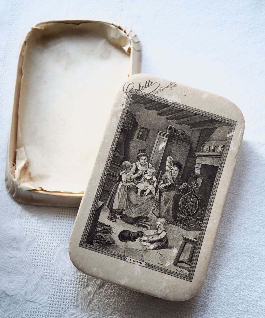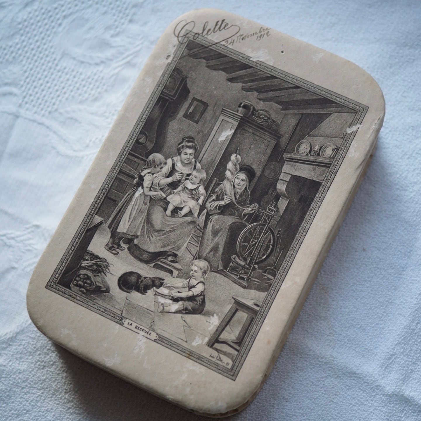 家族団欒の様子が精緻なリトグラフで表現された、美しいドラジェボックス。手書きで、コレットという名前と、1912年11月24日と入っています。裕福な家の豪華な洗礼が描かれてものも多いのですが、こちらは庶民のお家。ほのぼのとした風景は、眺めているだけで幸せな気分にさせてくれます。