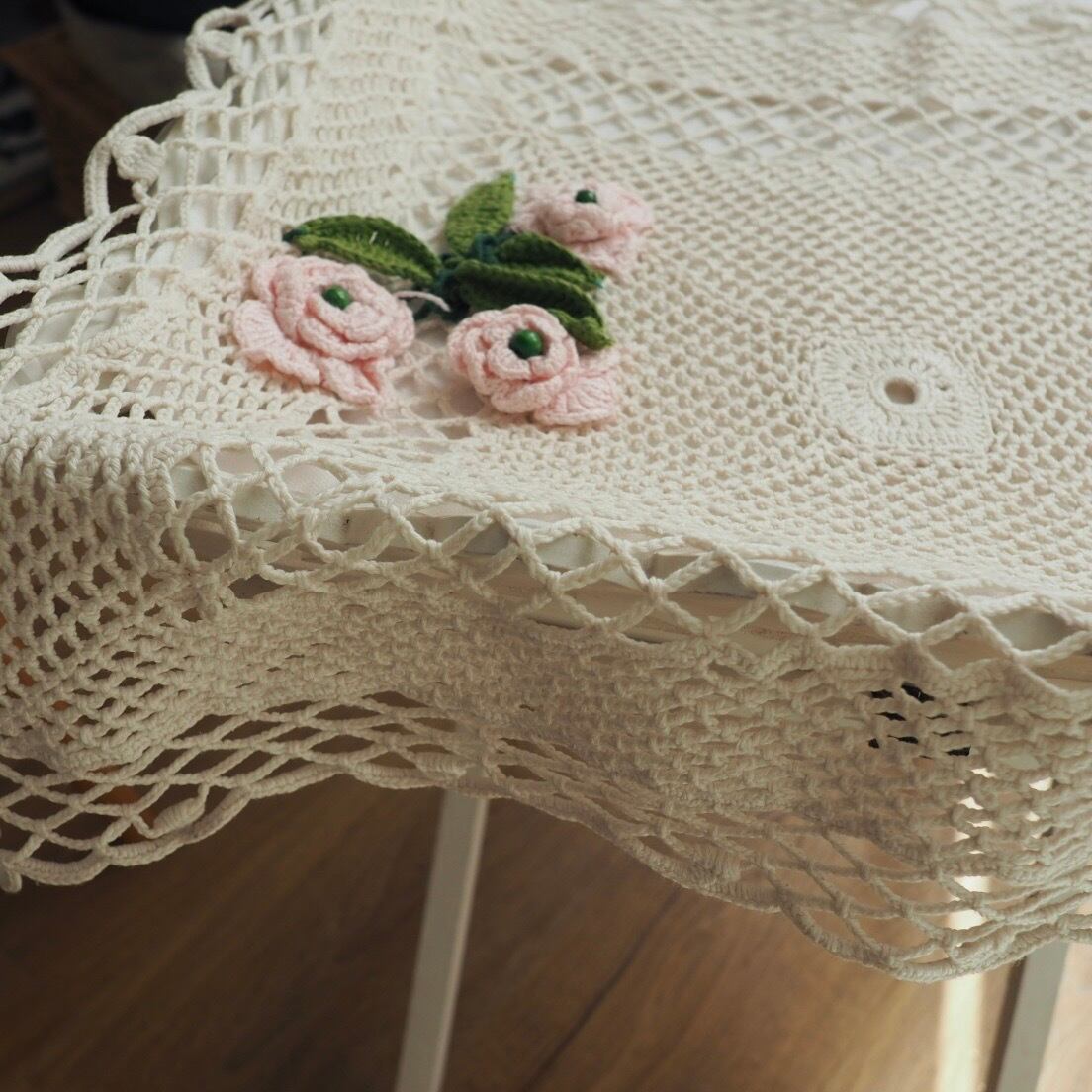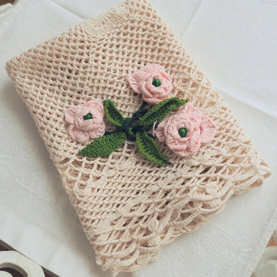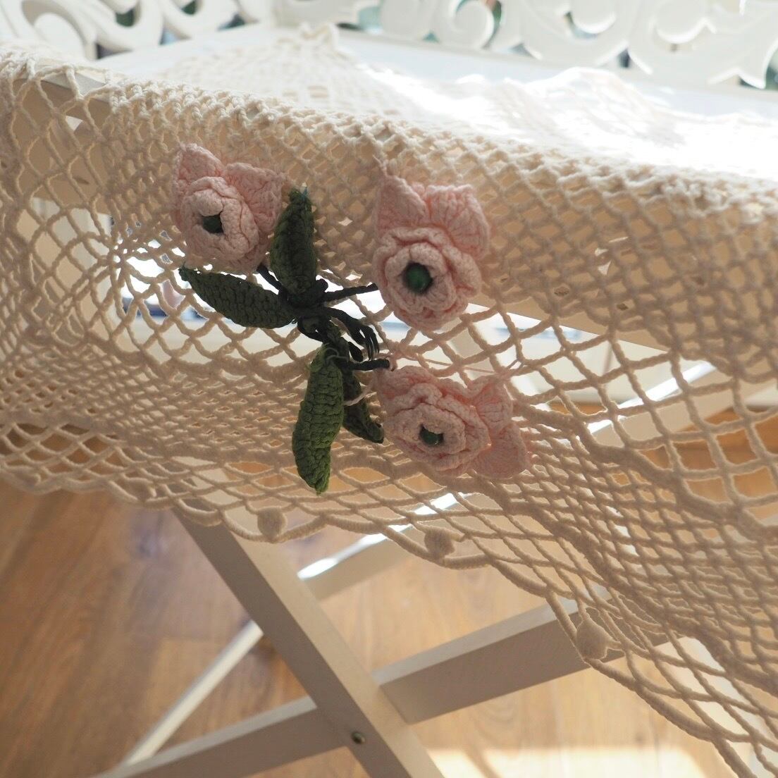 テーブルクロスの重ねがけなどにも使いたい、ざっくり編まれたクロス。3輪のかわいいバラがアップリケされています。