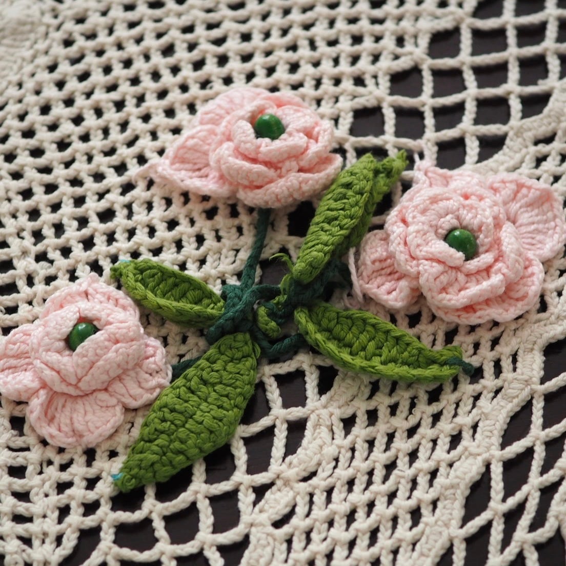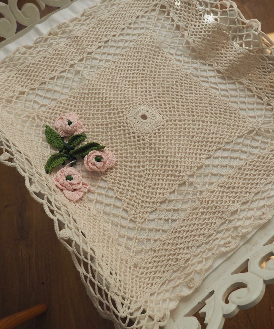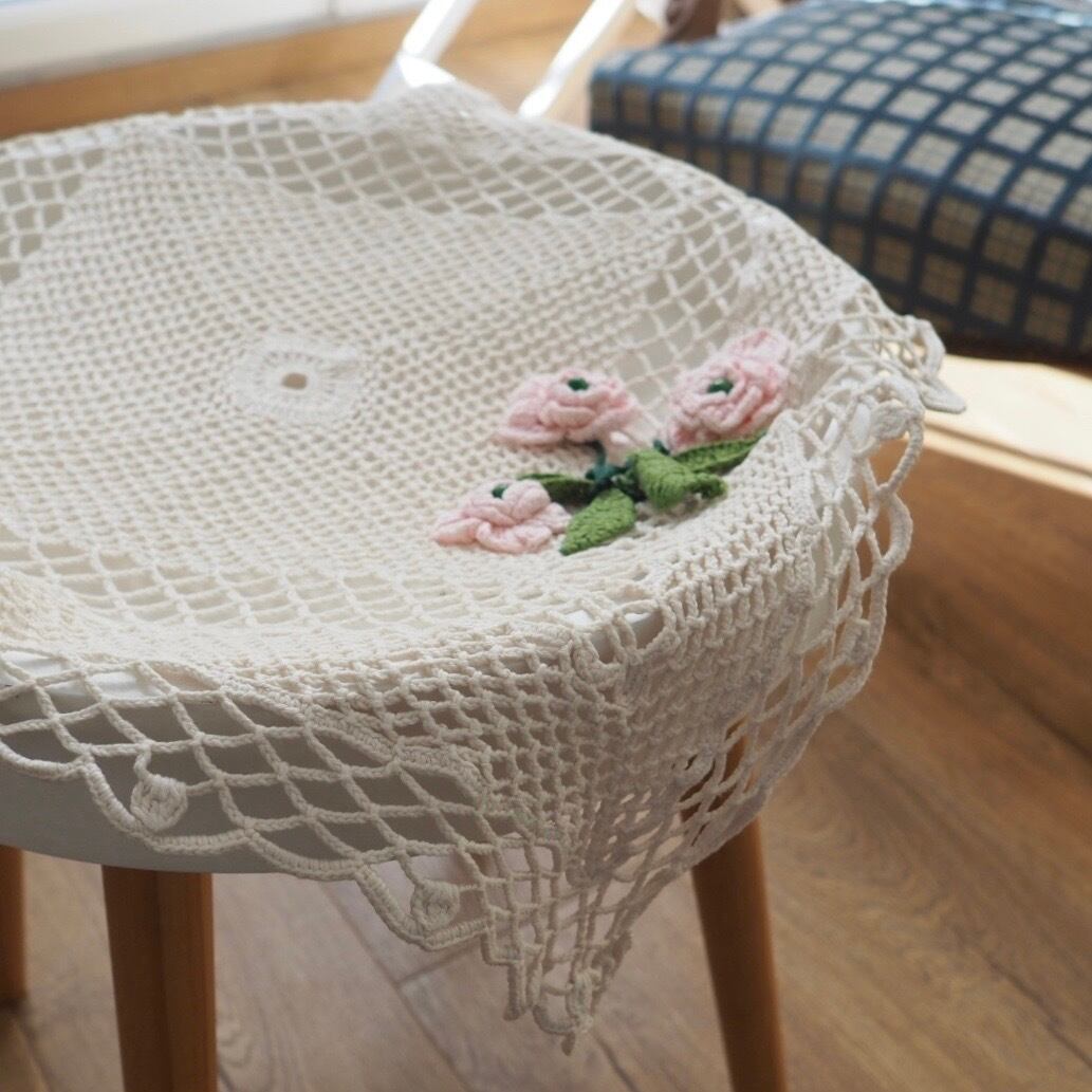 【Petite Chance】手編みミニテーブルクロス バラの花アップリケ