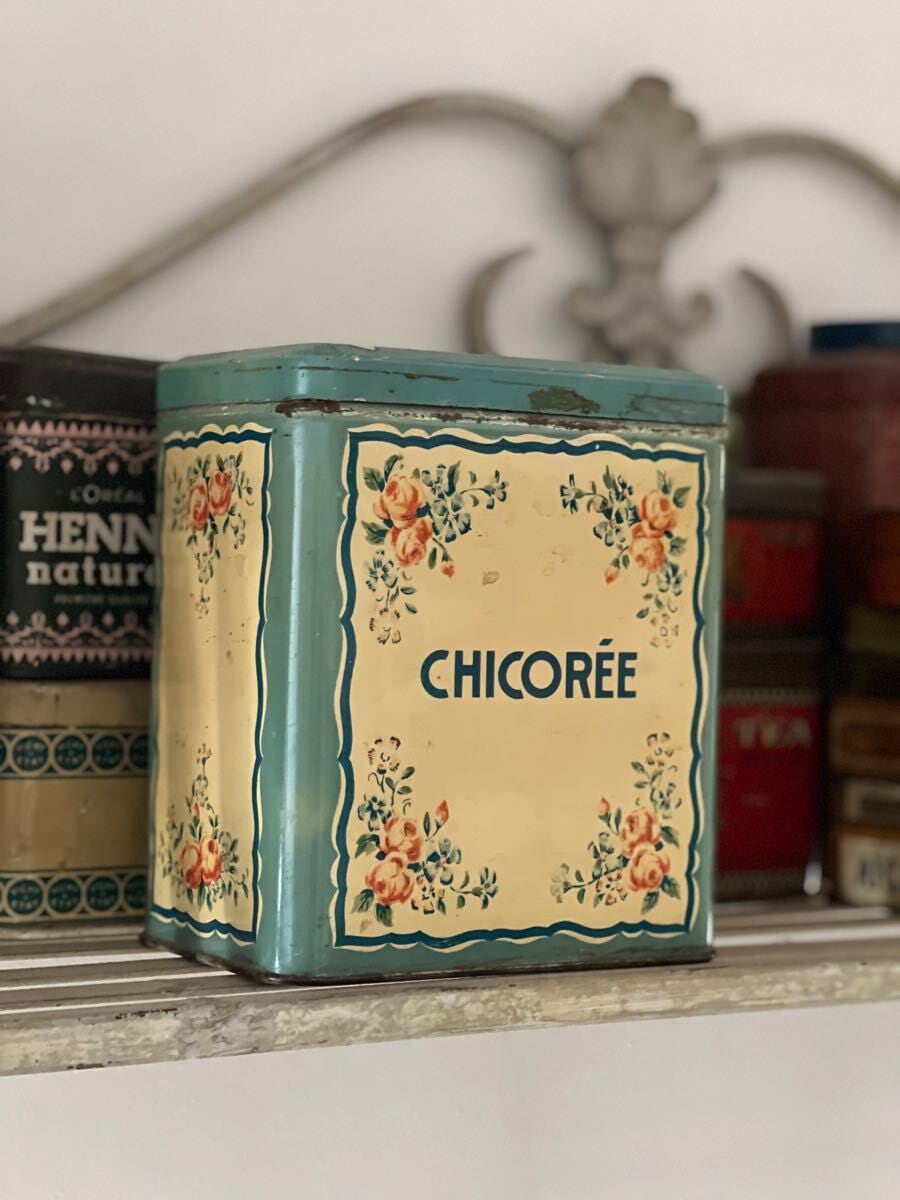 こちらはチコレ(チコレコーヒー)用の缶です。フランスでは今もノンカフェインのチコレコーヒーが愛飲されています。