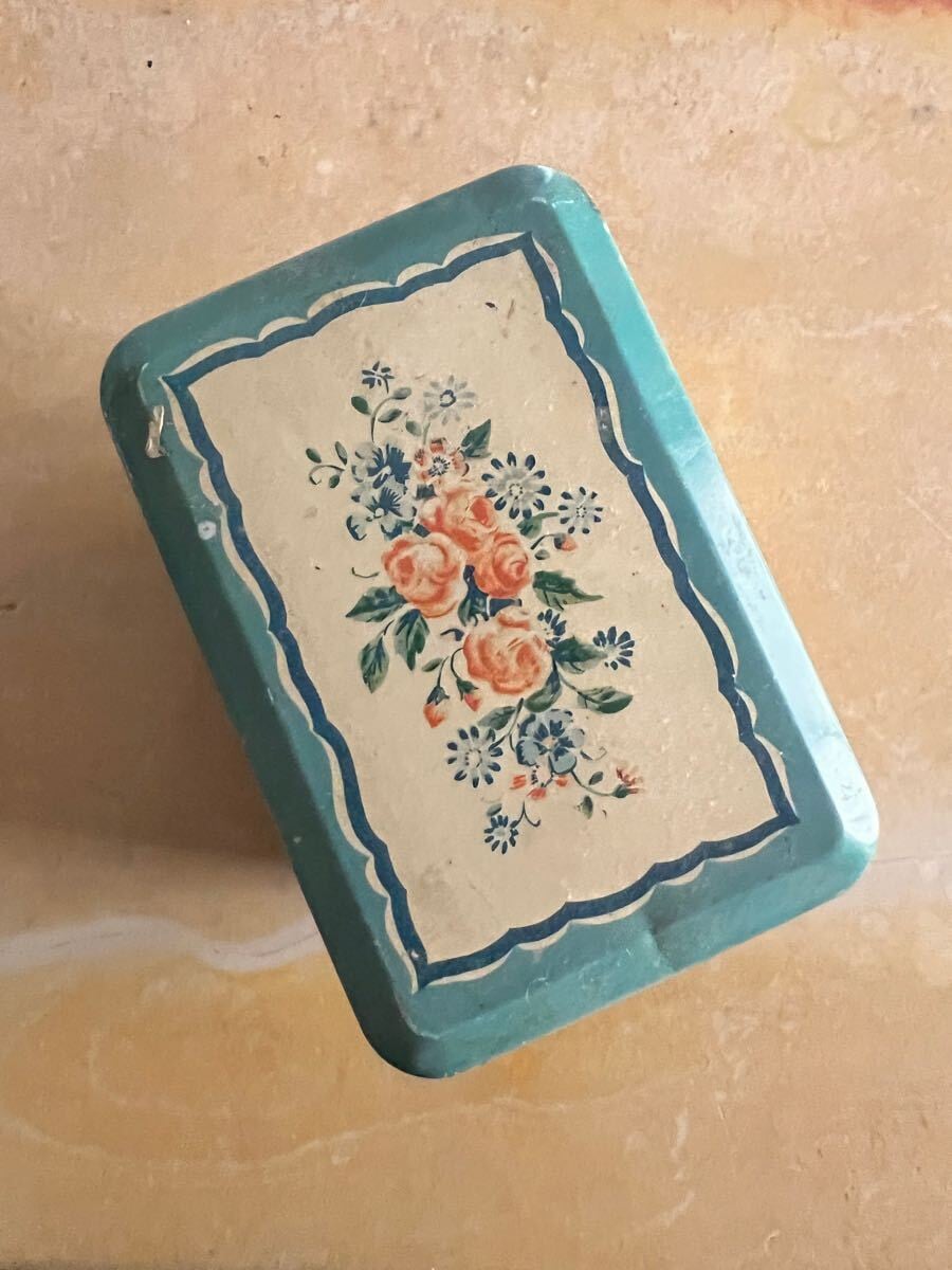 MENIER Tin缶。バラのブーケとパステルカラーがかわいい缶製キャニスターです。1900年代初頭。