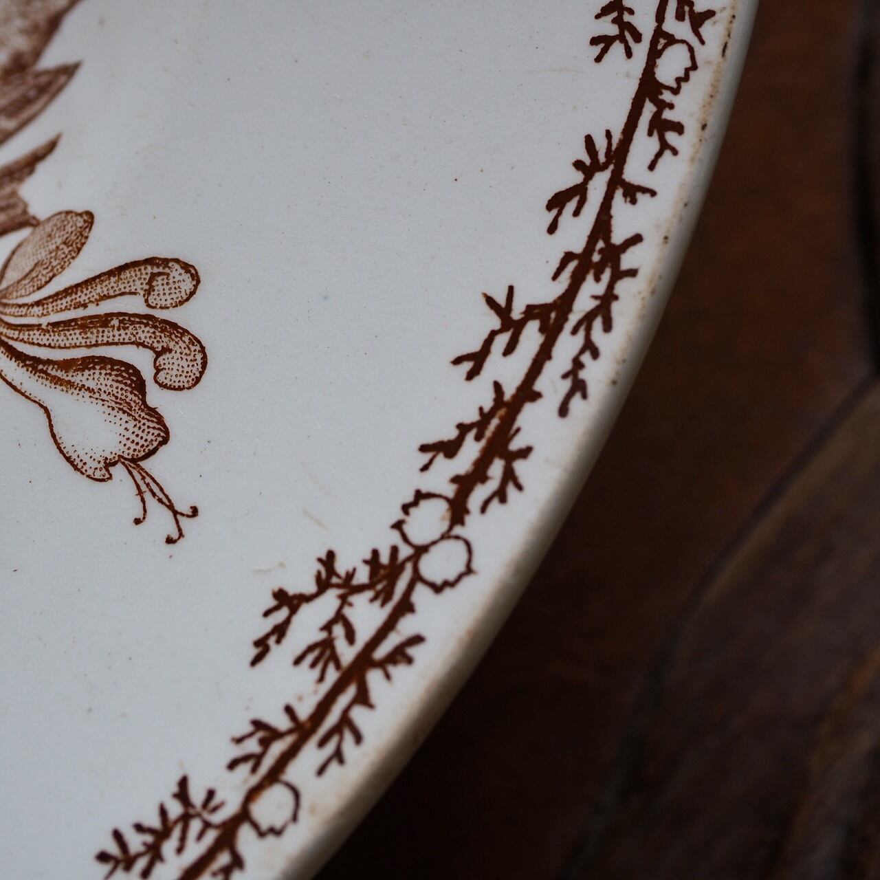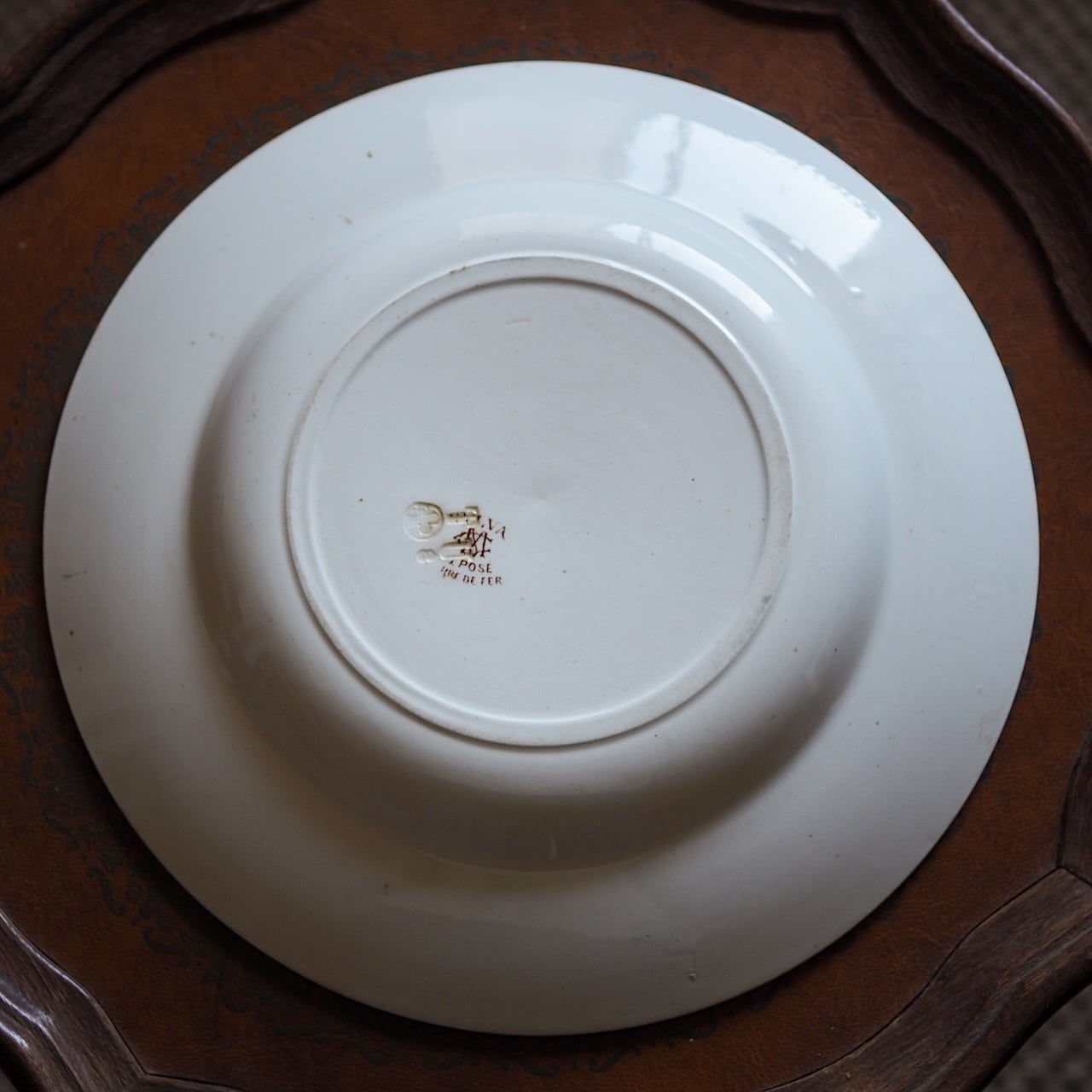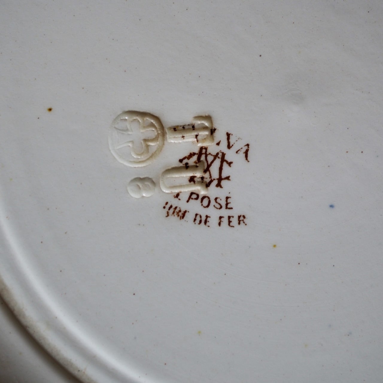 カオリンや長石が多く加えられた陶器(半陶半磁器)をTerre de fer テール・ド・フェールと呼びます。19世紀後半に量産されました。より白く、より頑丈にと作られたものです。このお皿にも裏に"Terre de fer"と記されています。