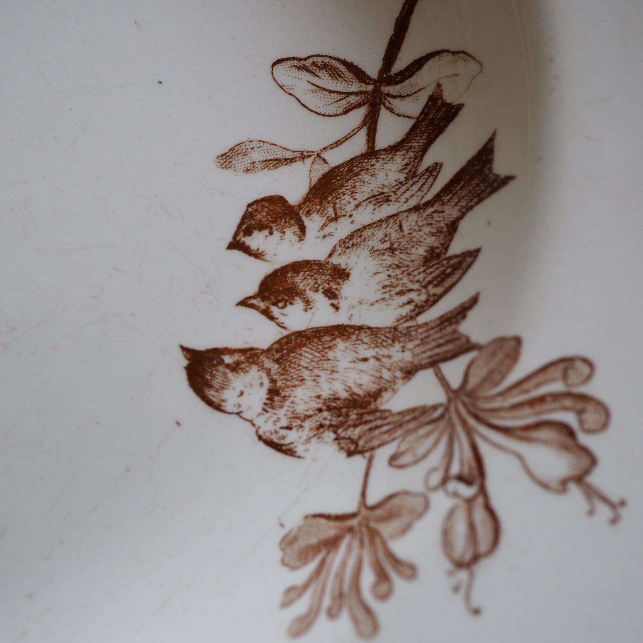 絵柄にバリエーションがありますが、こちらは三羽の小鳥とハニーサックルの花が描かれていて、リムの縁にも実ものがぐるりと囲んでいます。