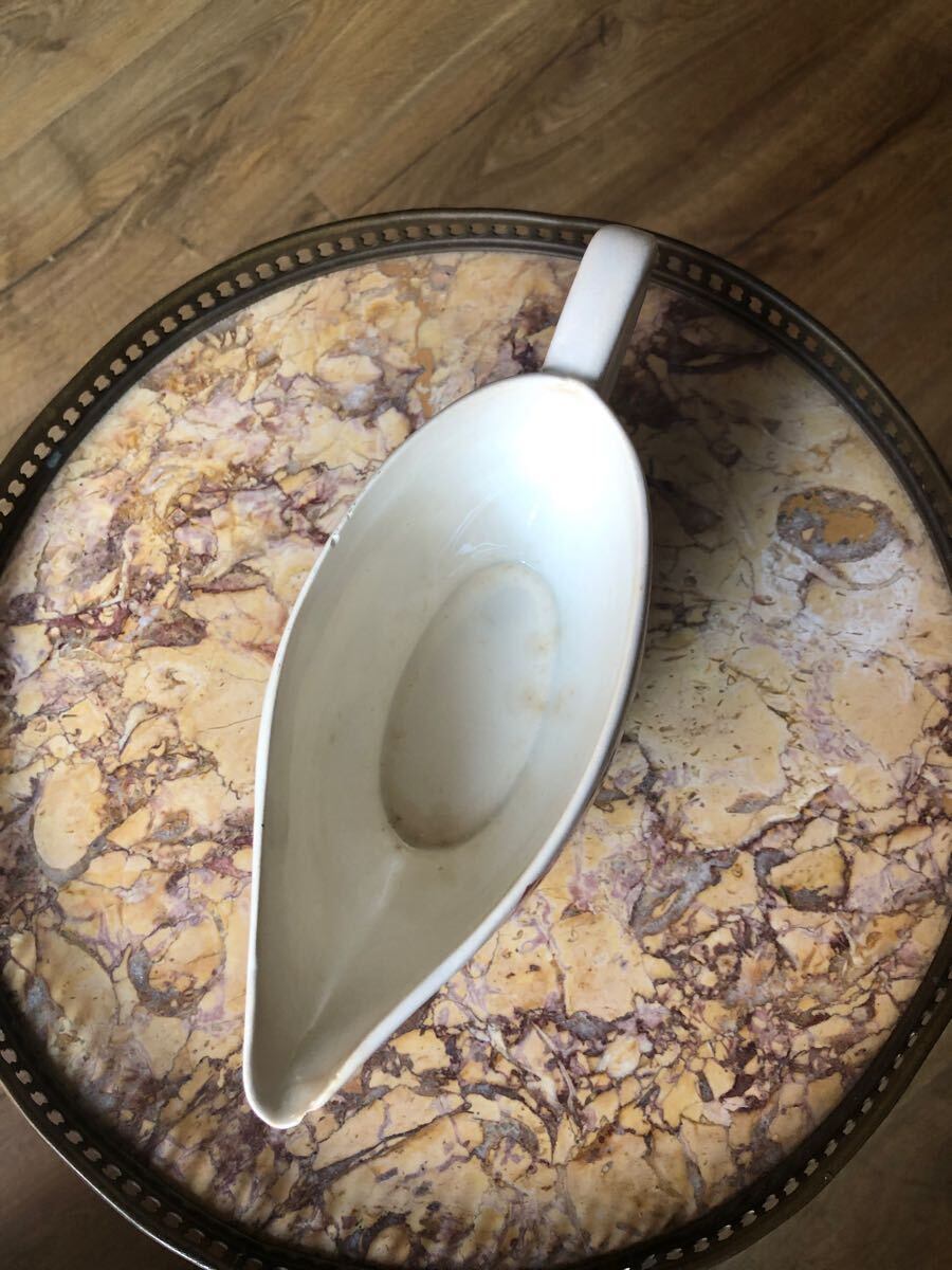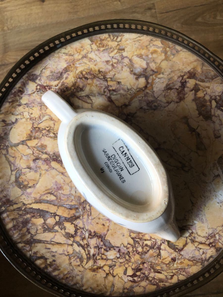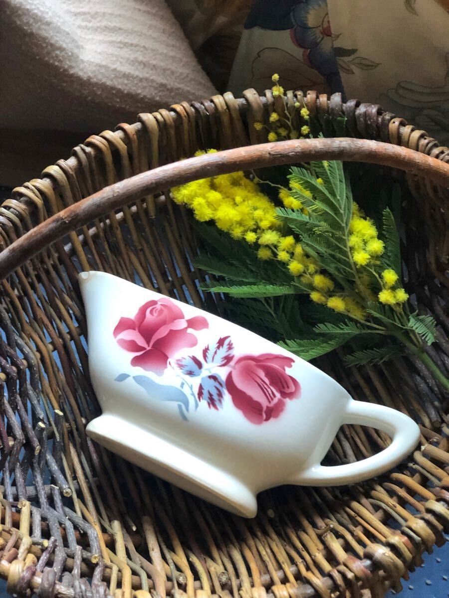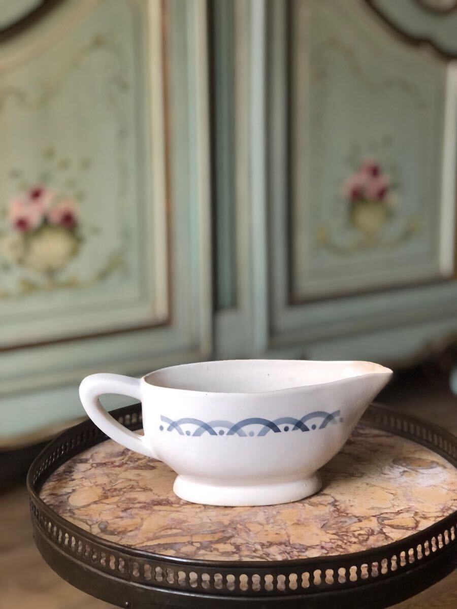 ソーシエールというのは、料理のソースをテーブルでサービスする器です。現在は花器として使う人がフランスでも多いようです。野花やベランダの花やグリーン、ハーブなどをさりげなく挿すのにぴったりです。