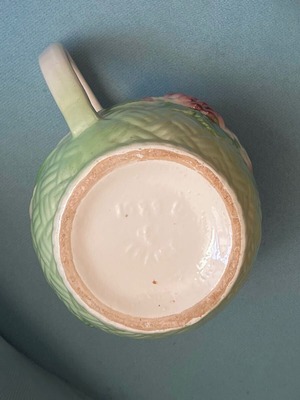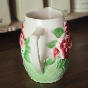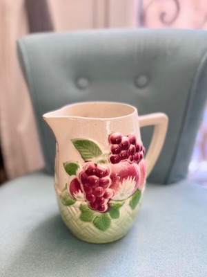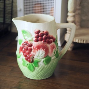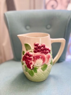 バルボティーヌの大型ピシェ(水差し)。ブドウや無花果が浮き彫りになったバルボティーヌです。フルーツのボルドー色とグリーンのツートーン。下部はパニエ柄になっていてかわいい!
