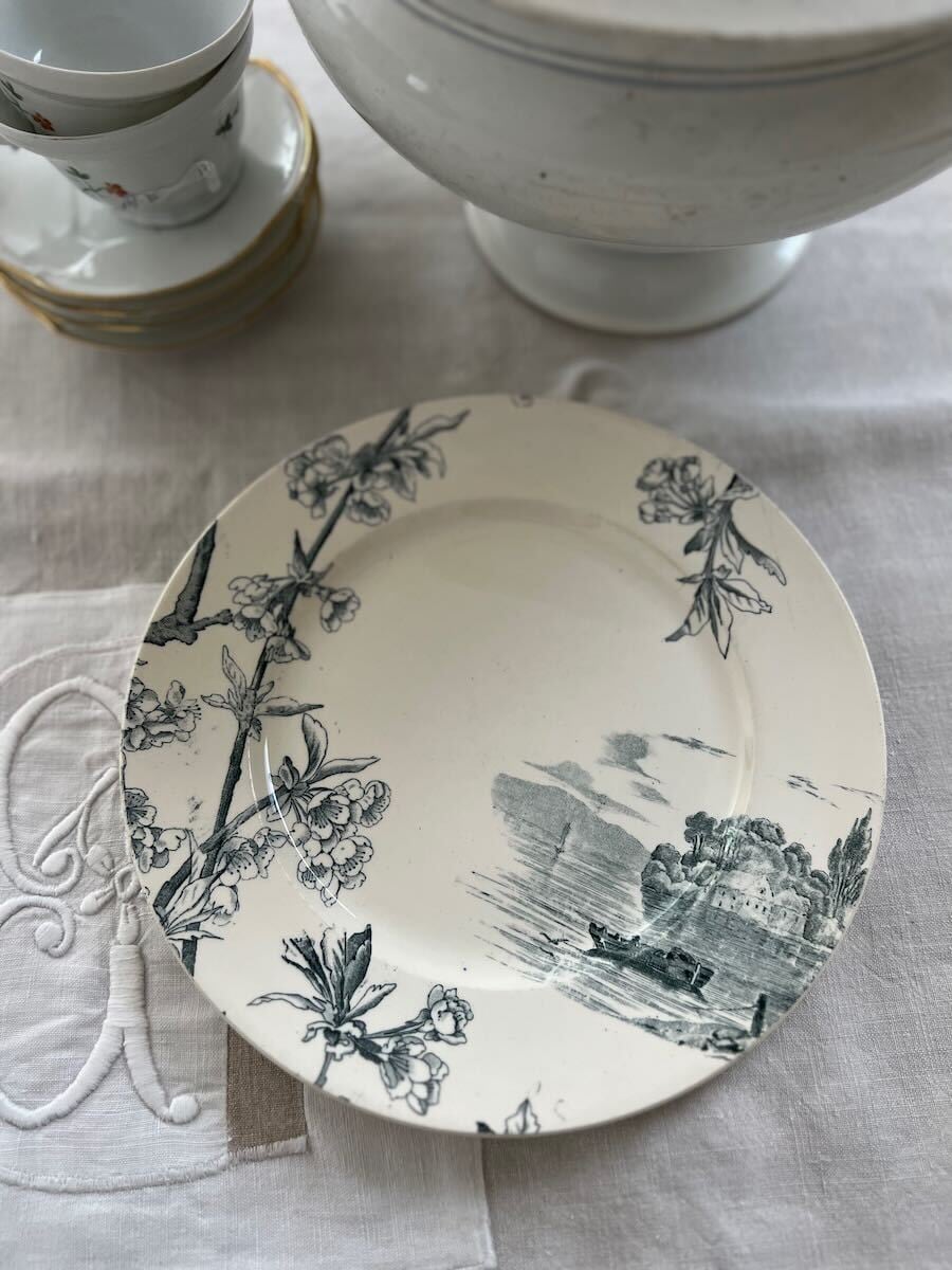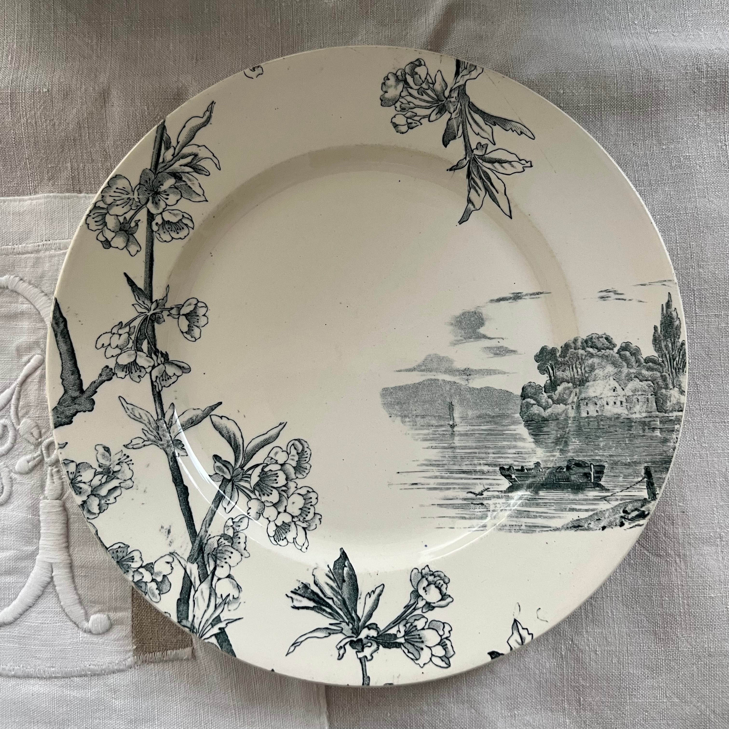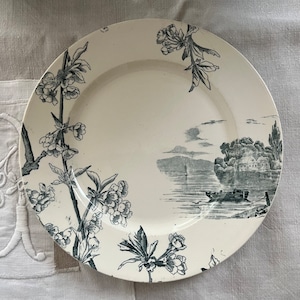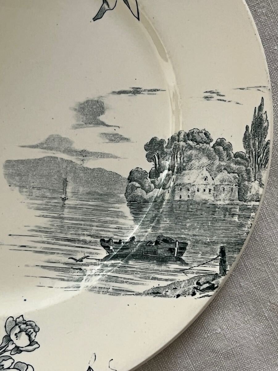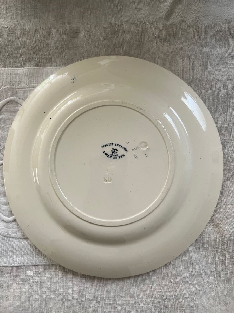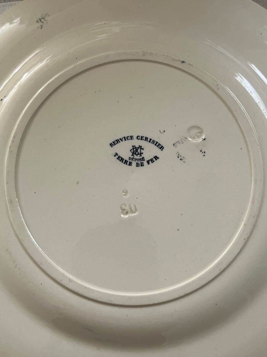 どっしり重厚感のあるテール・ド・フェール。カオリンや長石が多く加えられた陶器(半陶半磁器)をTerre de fer テール・ド・フェールと呼びます。1770年に初めて生産され、19世紀後半に量産されました。より白く、より頑丈にと作られたものです。このプレートにも裏に"Terre de fer"と記されています。