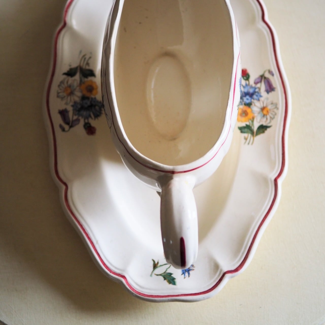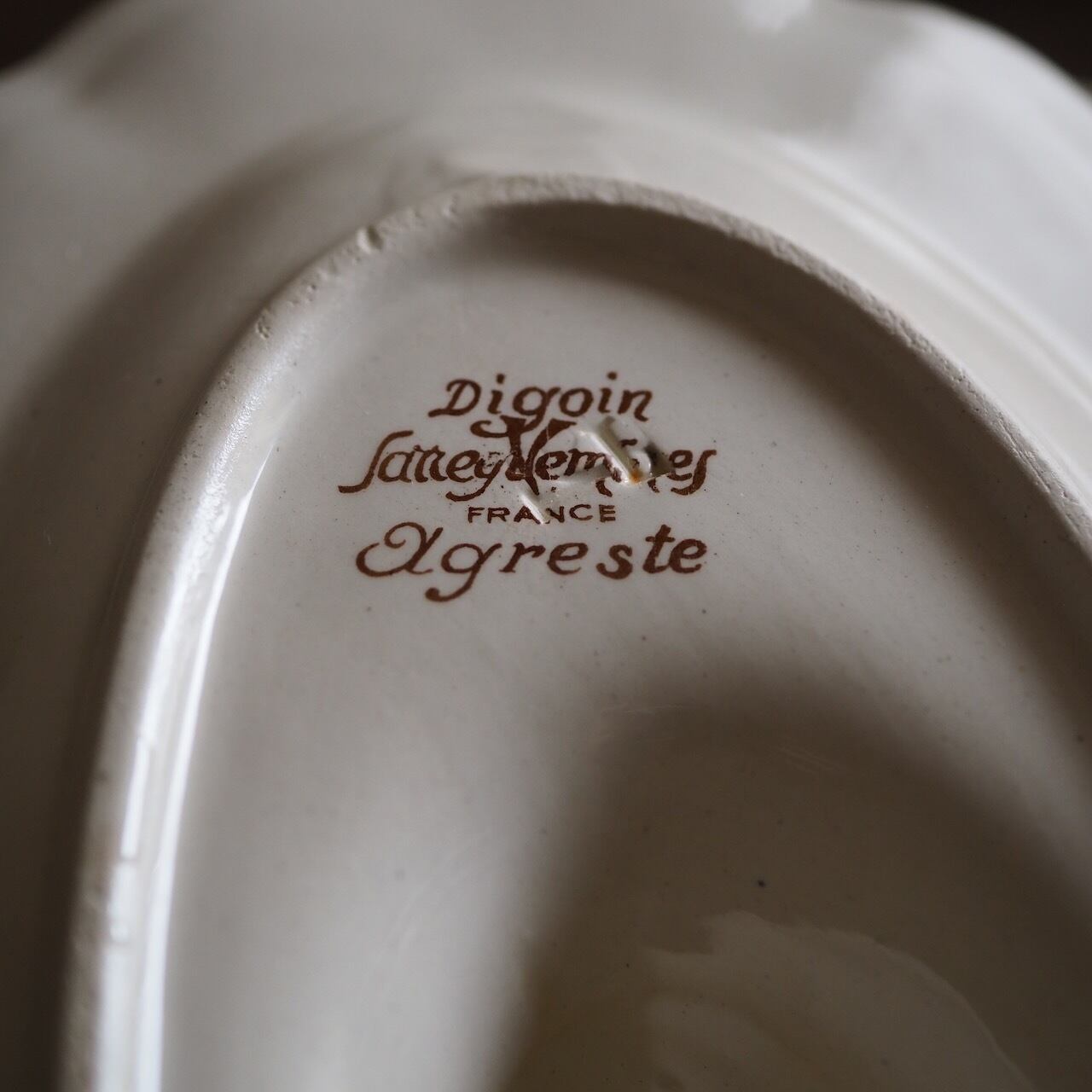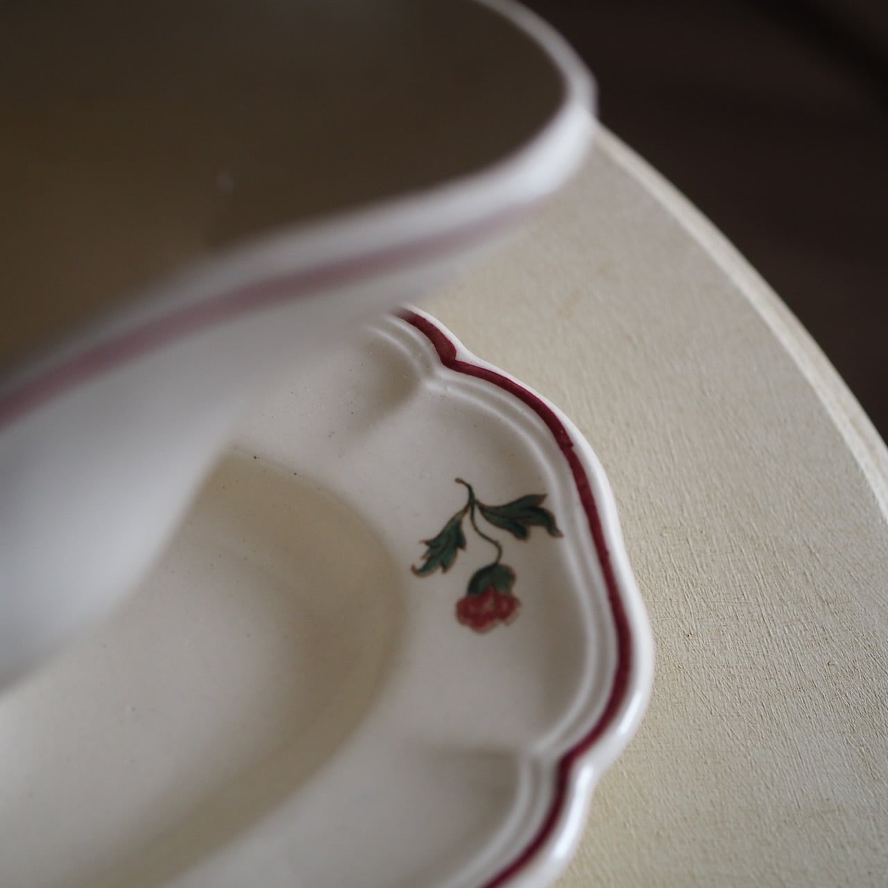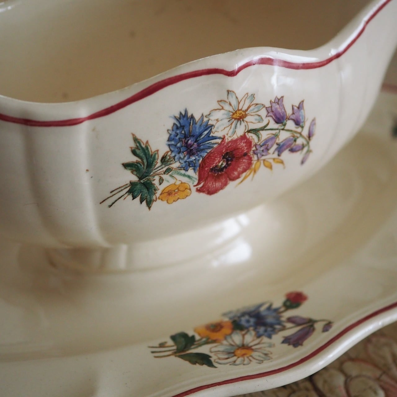 ポピーやヒナギクなどの花が配されたディゴワン・サルグミンヌのシリーズ「アグレスト」のソーシエールです。数十年間続いた人気シリーズ。ボルドー色で縁取られ、可憐でかつ落ち着いた印象です。