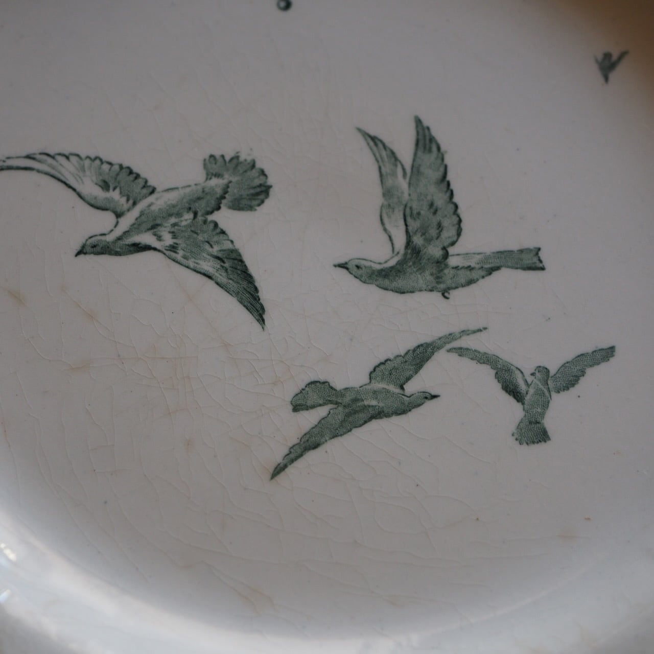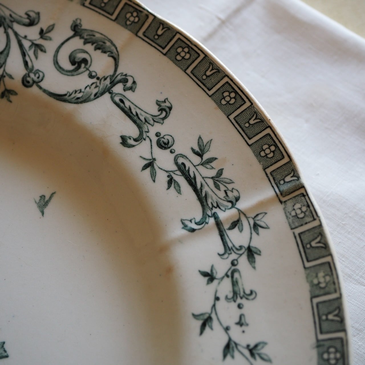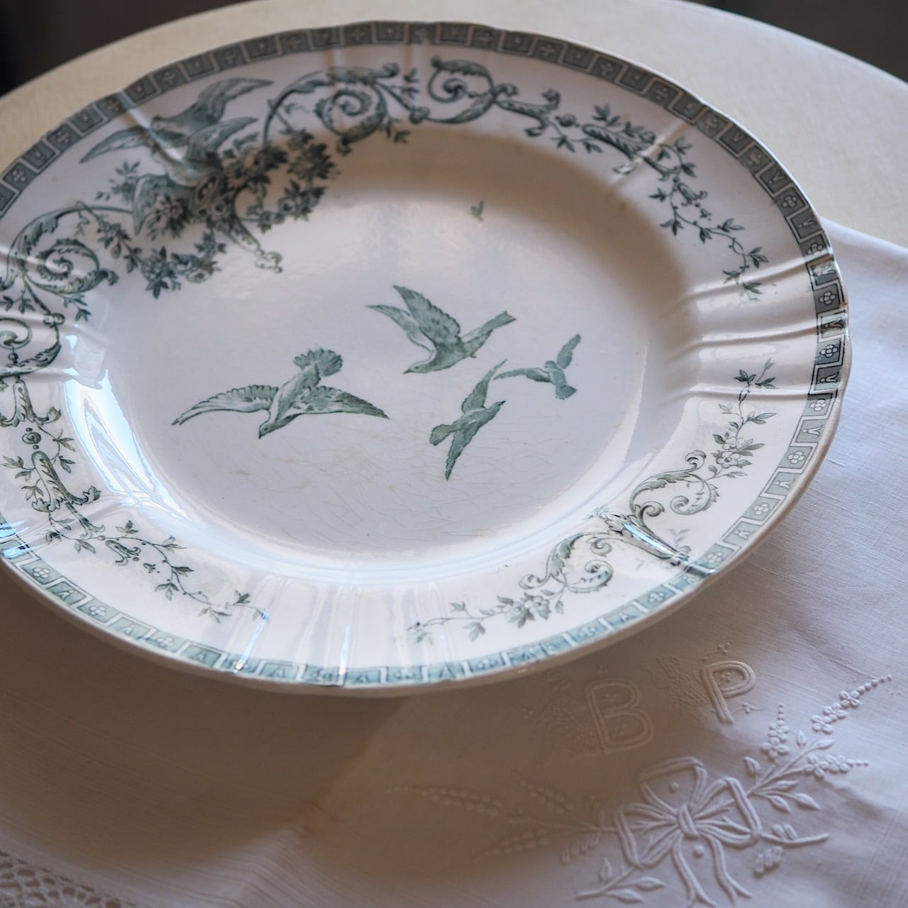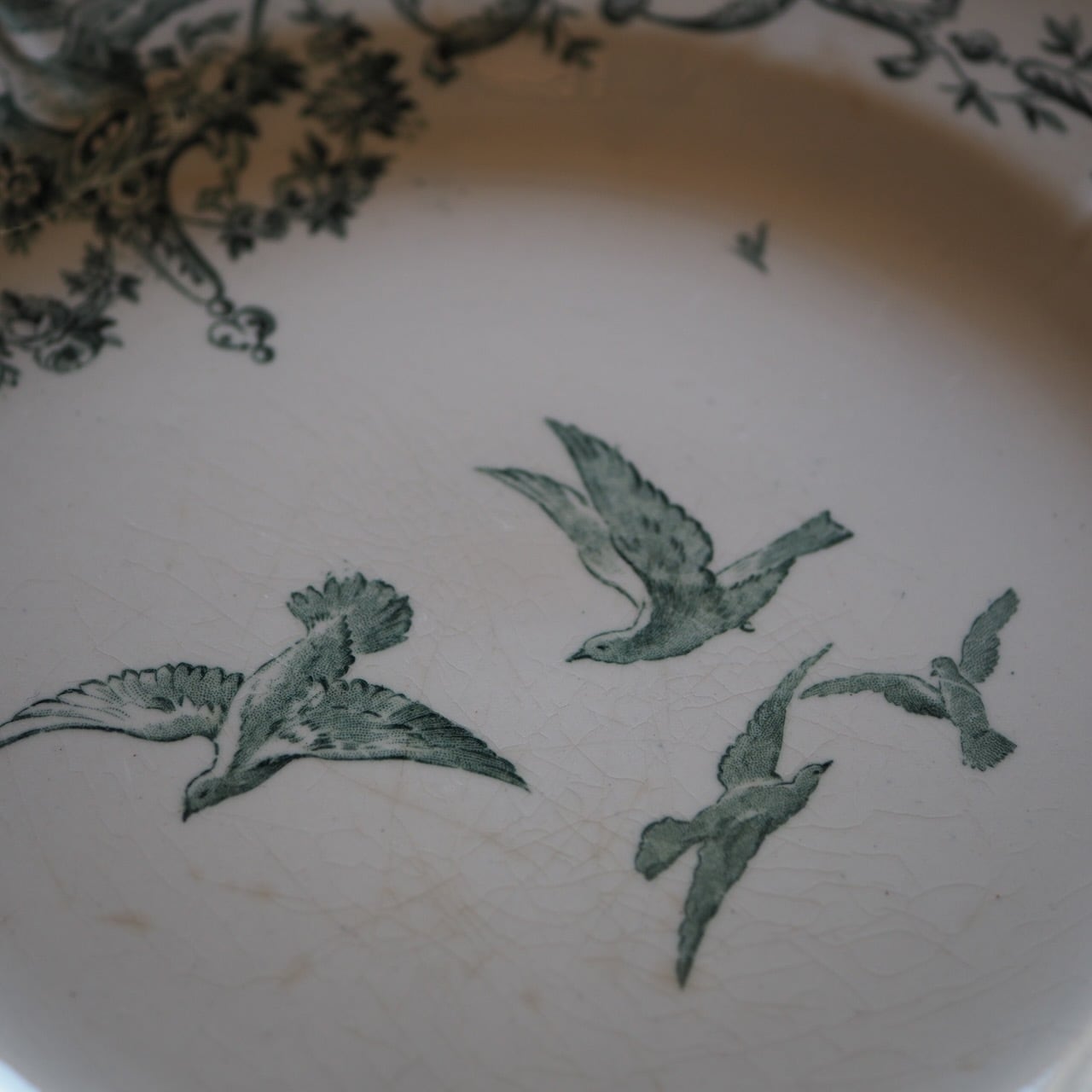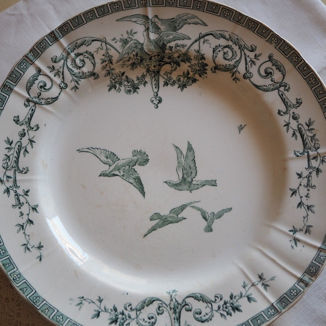 「マリー・アントワネット」という名前がついた、たいへん美しいプレート(平皿)です。写真で色を再現でききれていませんが、ブルーではなく、グリーン系です。