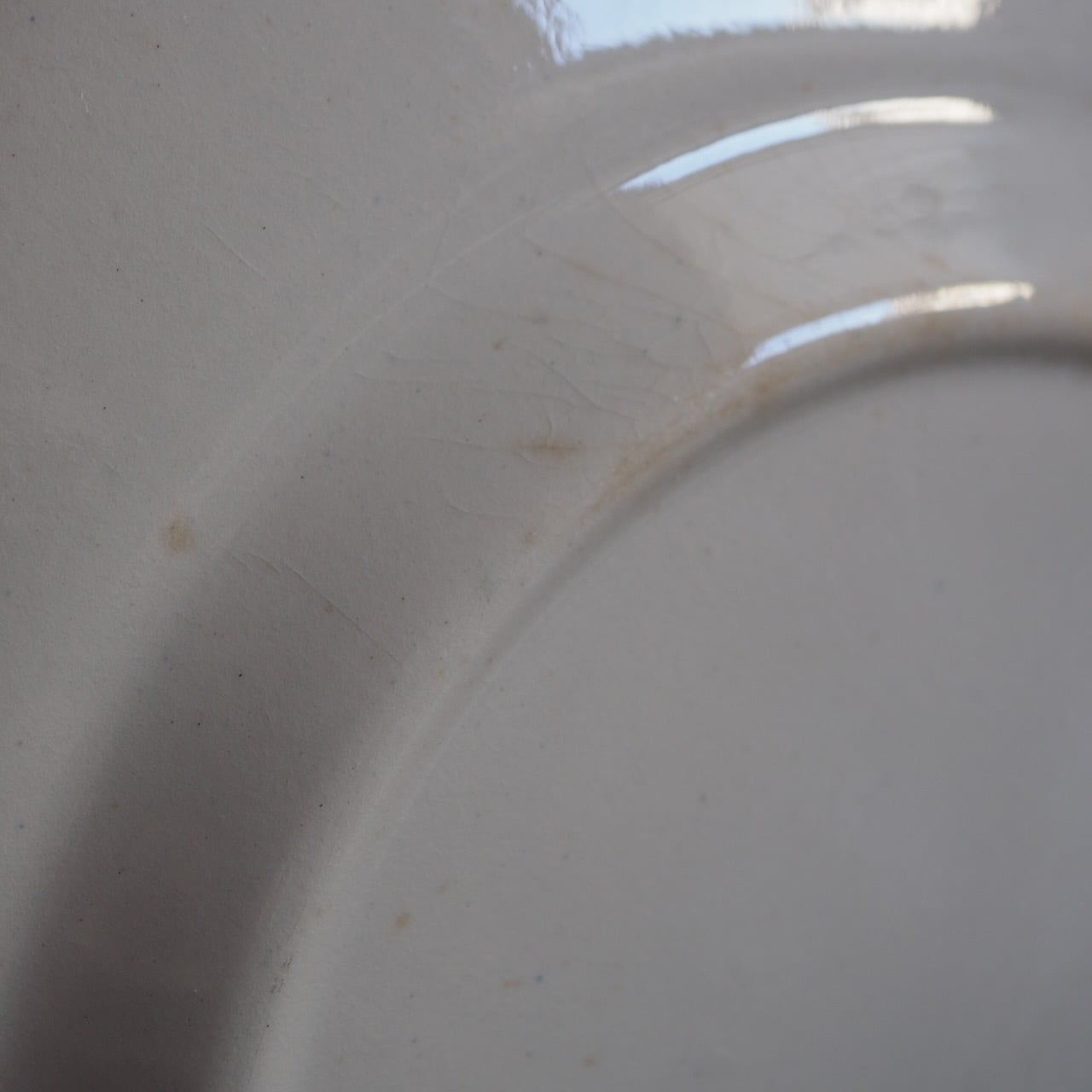 カトラリー傷は本当に細かい小さなものしか入っていません。経年による貫入からのシミが少しできていて、それが使用感に見えるかもしれませんが、実際はあまり高い頻度では使われてこなかったお皿のようです。