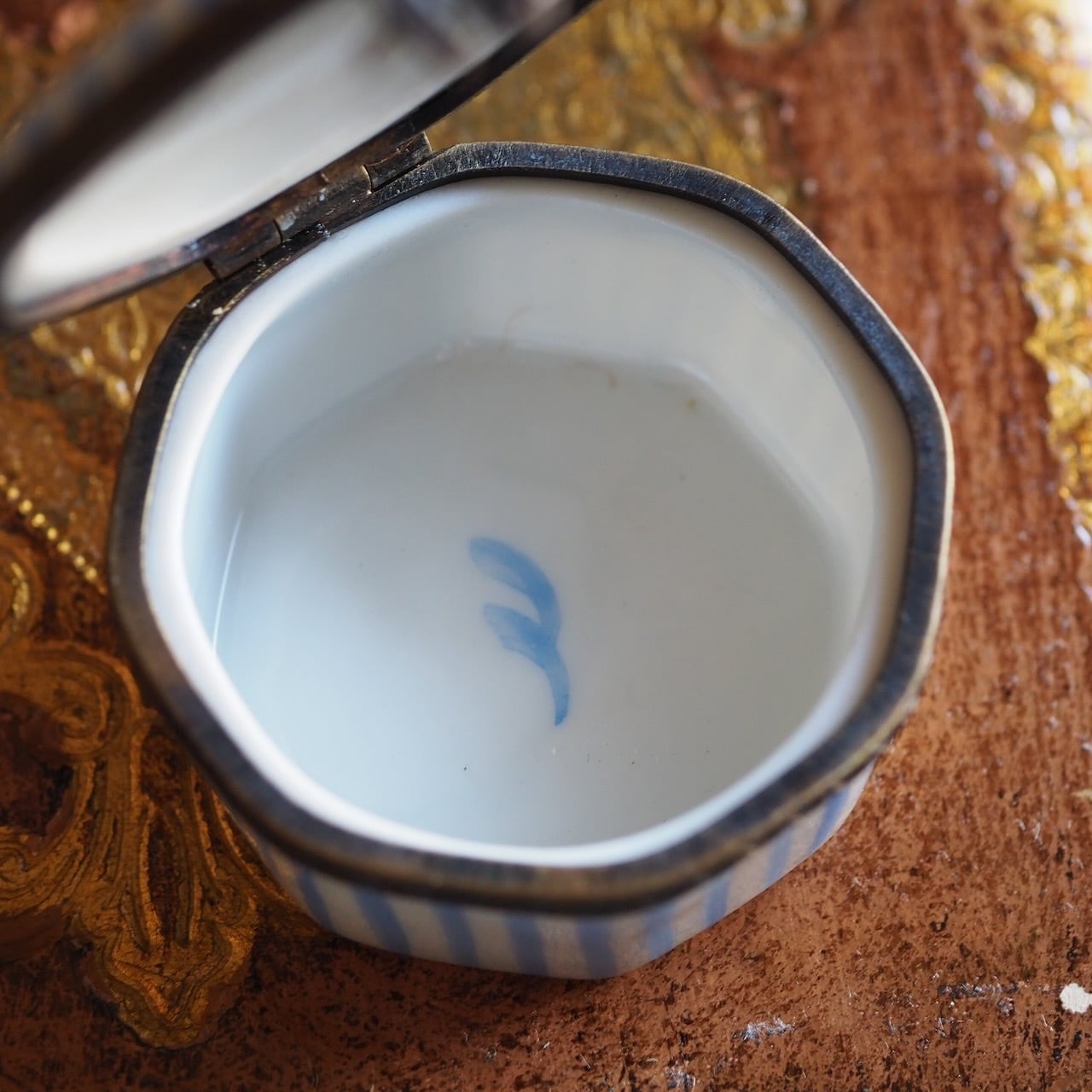 目立つダメージはなく、ビンテージ品としてはたいへん良好なコンディションです。経年変化による細かい傷や金彩の擦れなどは、アンティークの風合いとしてお楽しみください。蓋もカチッと閉まります。