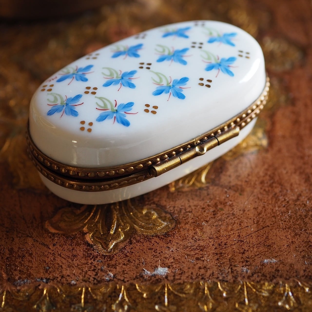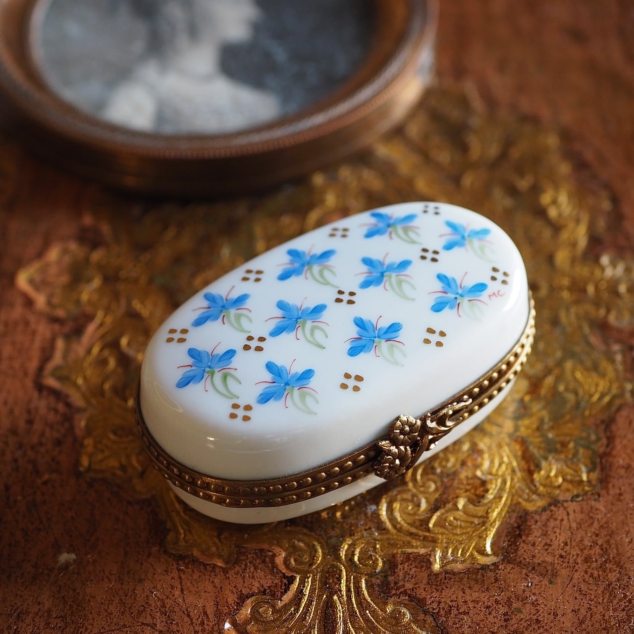 昔はジュエリーや薬、化粧品、つけぼくろ、裁縫道具などを入れていたリモージュボックス。こんなかわいい入れ物なら薬を飲むのも楽しくなりそうですね。