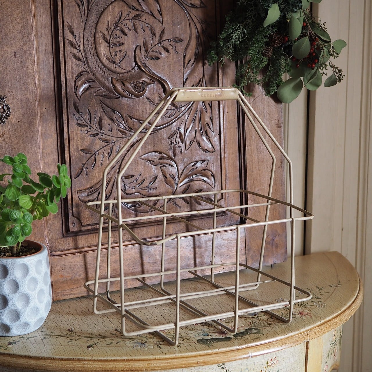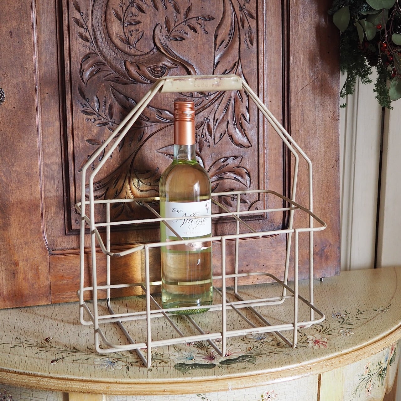このワイヤーキャリーは、6本のグラスを持ち運ぶための昔の道具です。
