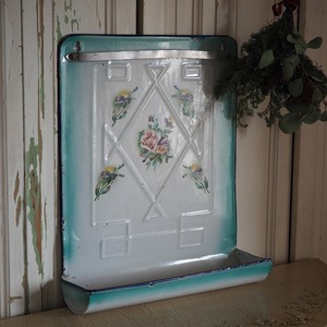 フランスJAPY社のアンティークホーローレードルラックです。ピンクのバラとビオラのモチーフですが、グリーンのぼかしなので甘すぎず、キッチンやダイニングをナチュラルな癒し空間にしてくれます。
