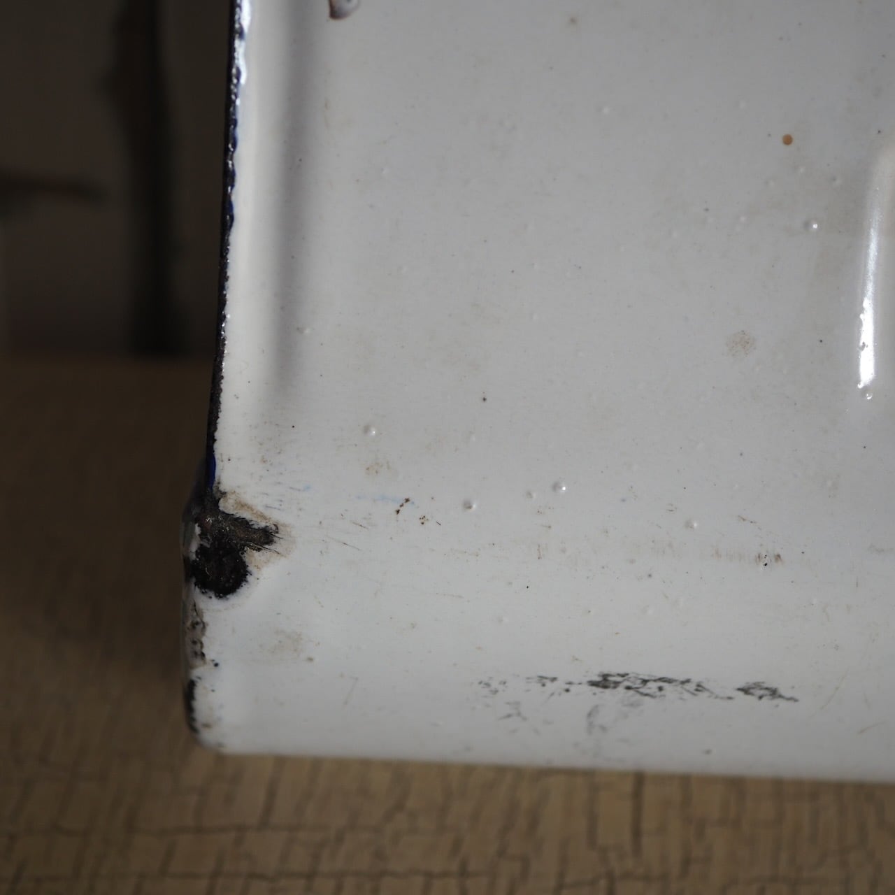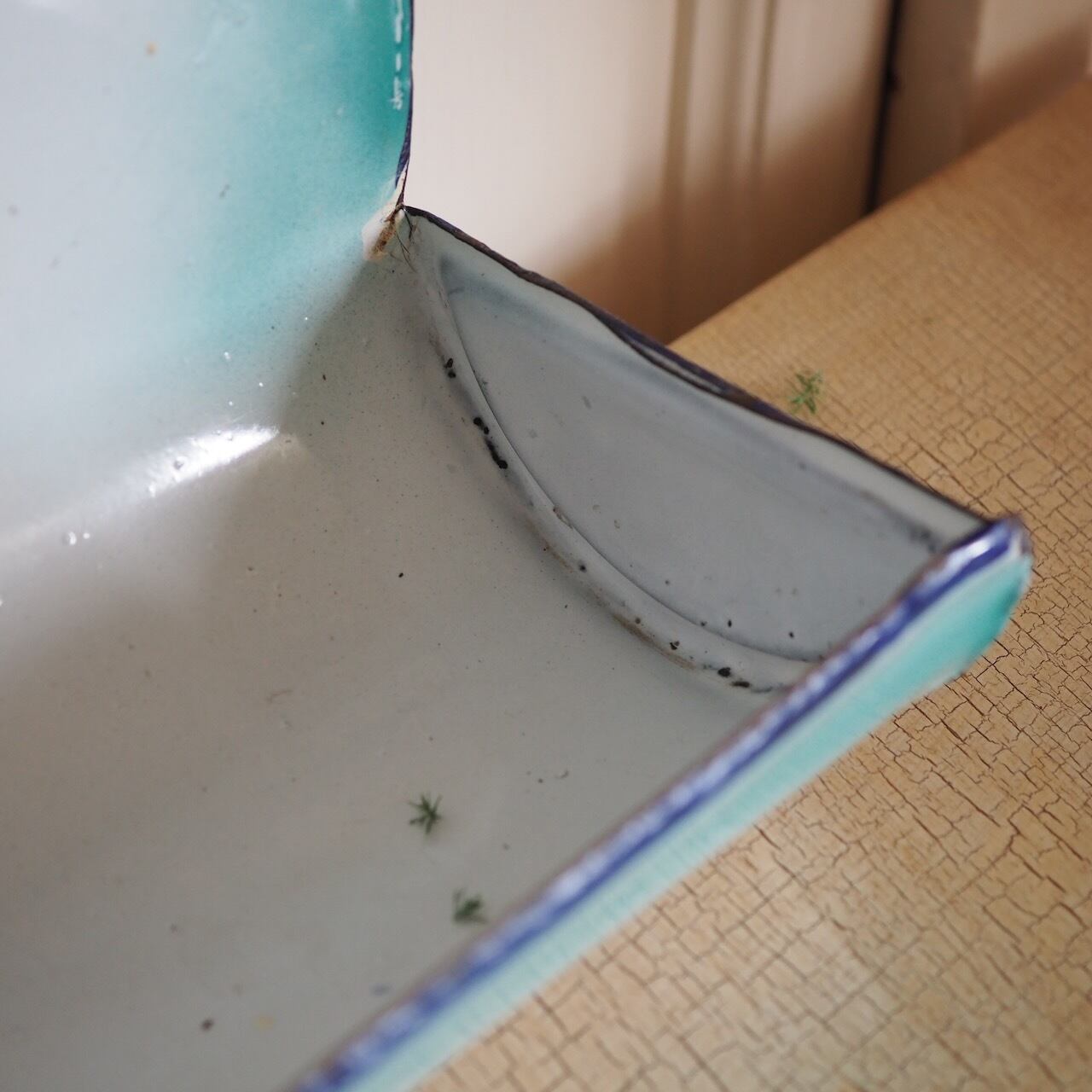 状態は大きなダメージはなく、この時代のホーロー製品にしては良好です。絵柄も艶もきれいに残り、ホーロー特有のあたりも少なめです(写真をご確認ください)。