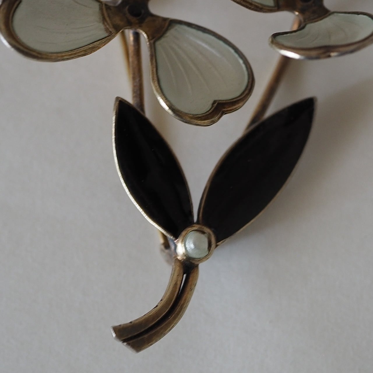 このブローチは、乳白色の花弁の質感がとても上品です。