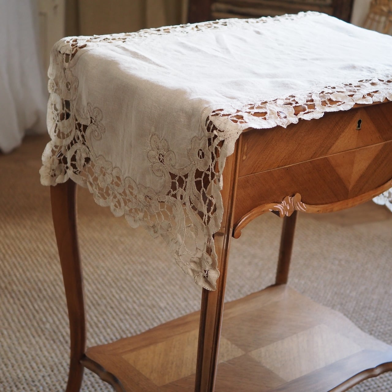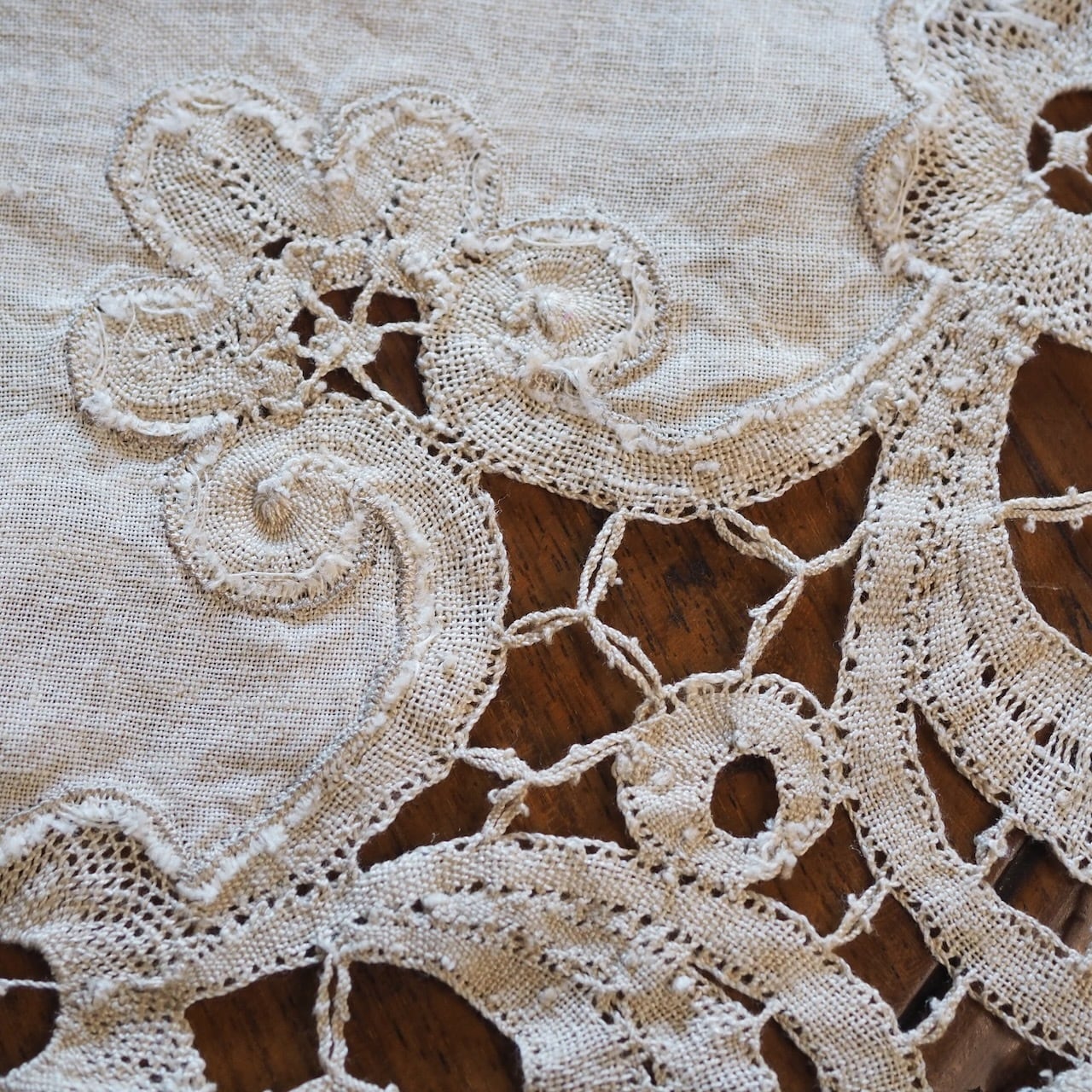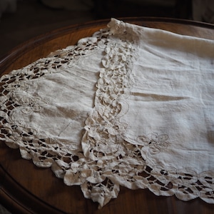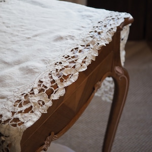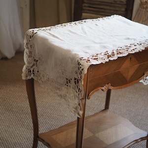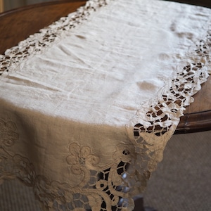手編みのアンティークレース(バテンレース)が周りを囲み、手作りで仕上げられた美しいテーブルランナーです。