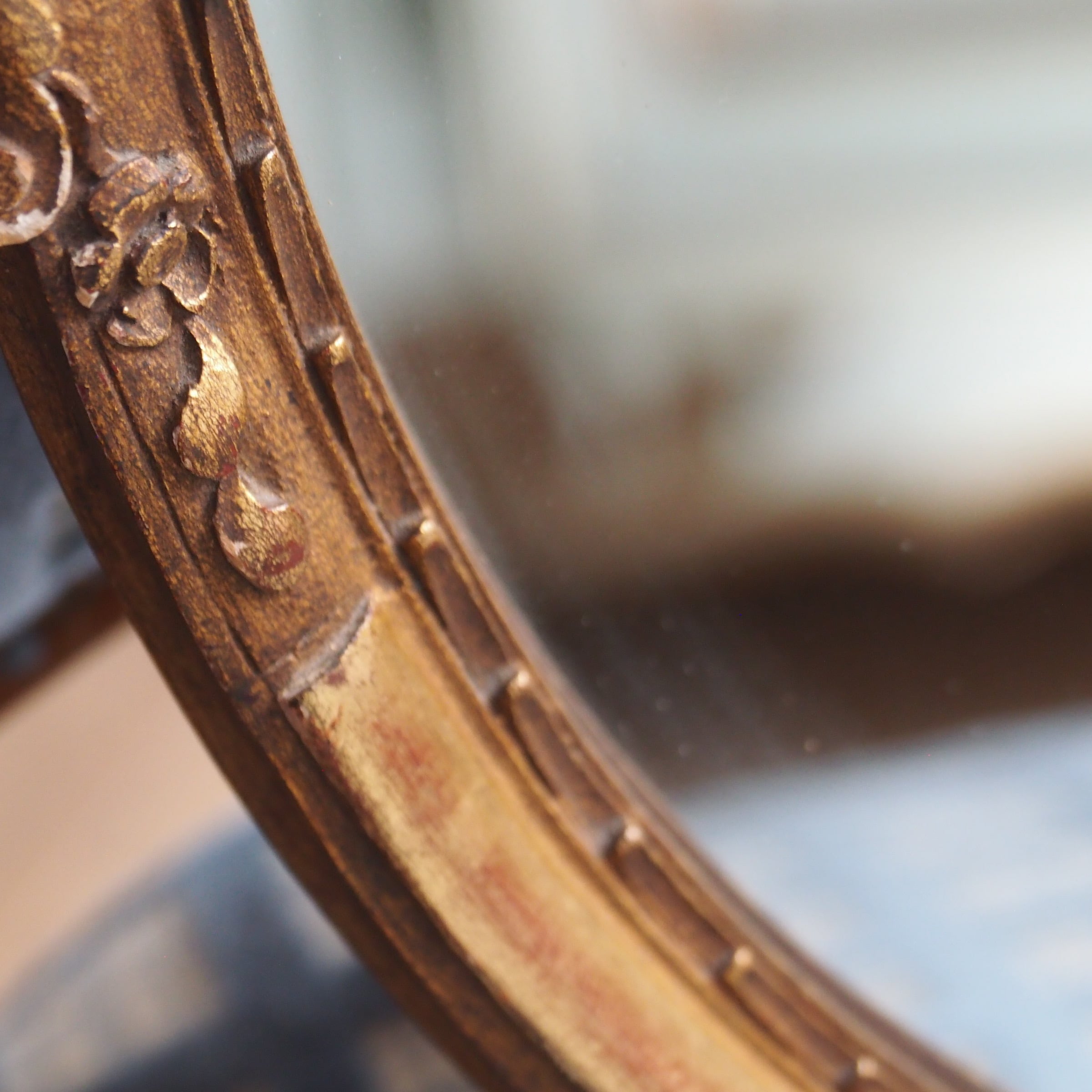 落ち着いた明るいゴールド、彫刻が施されたエレガントでシックなミラーです。