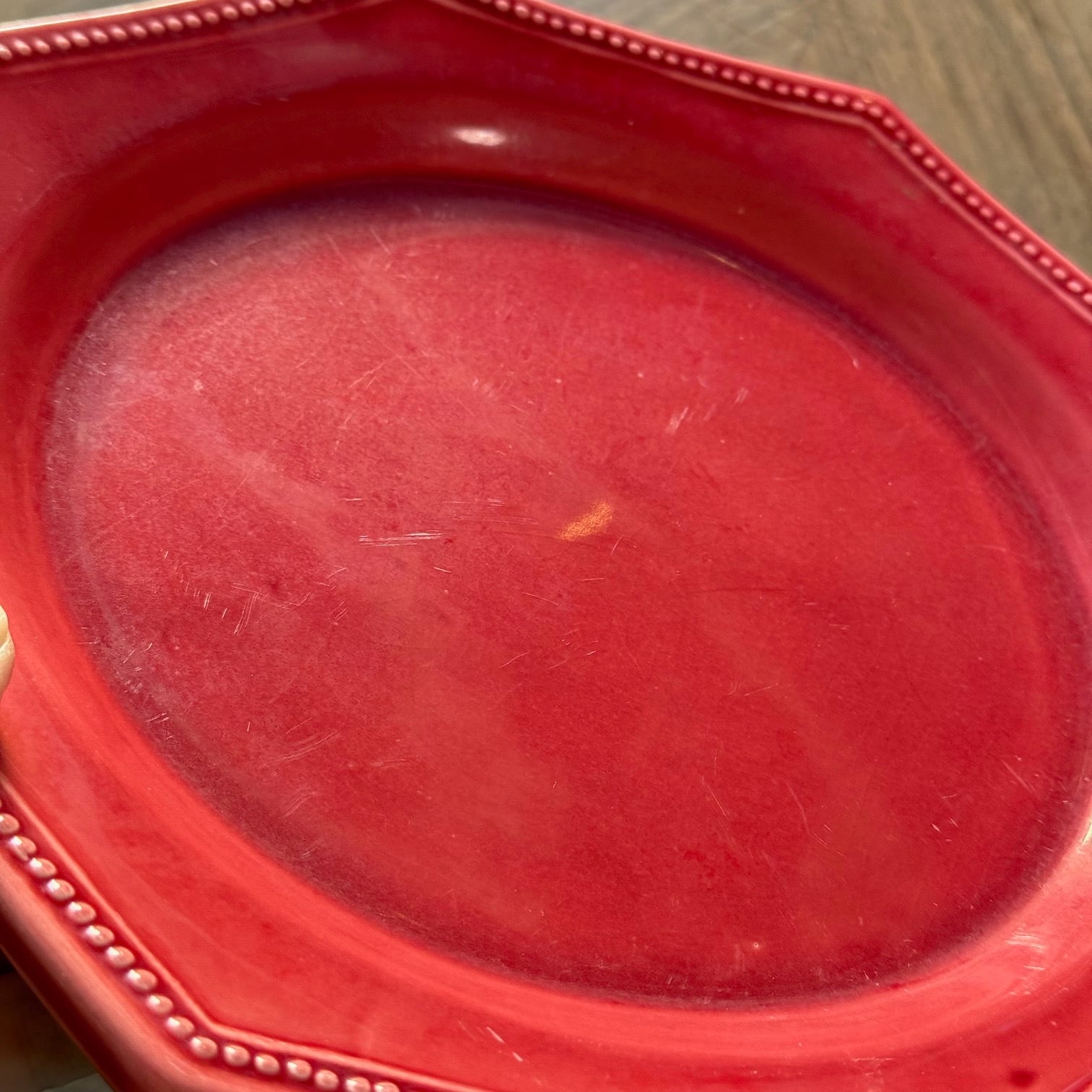 ピションのお皿にありがちなのですが、表面が少しマットな質感になっていて、経年による貫入や傷があるのでお安くなっています。釉薬のムラはピションの特徴です。