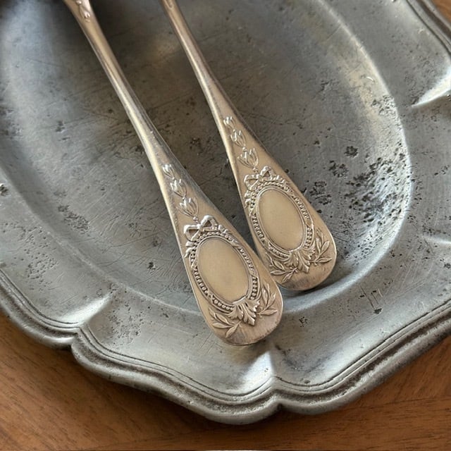フランスのテーブルセッティングはカトラリーの裏面を向けて置くため、このように裏側に装飾が入っています。