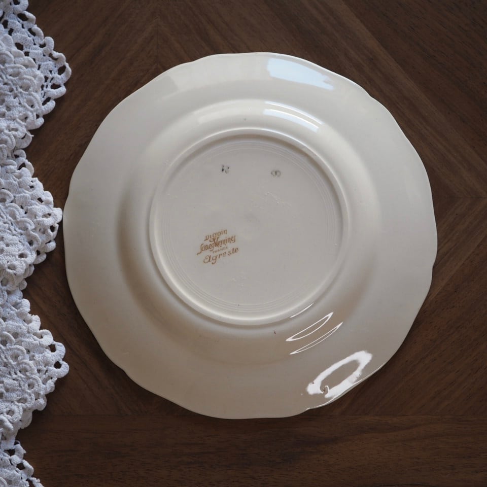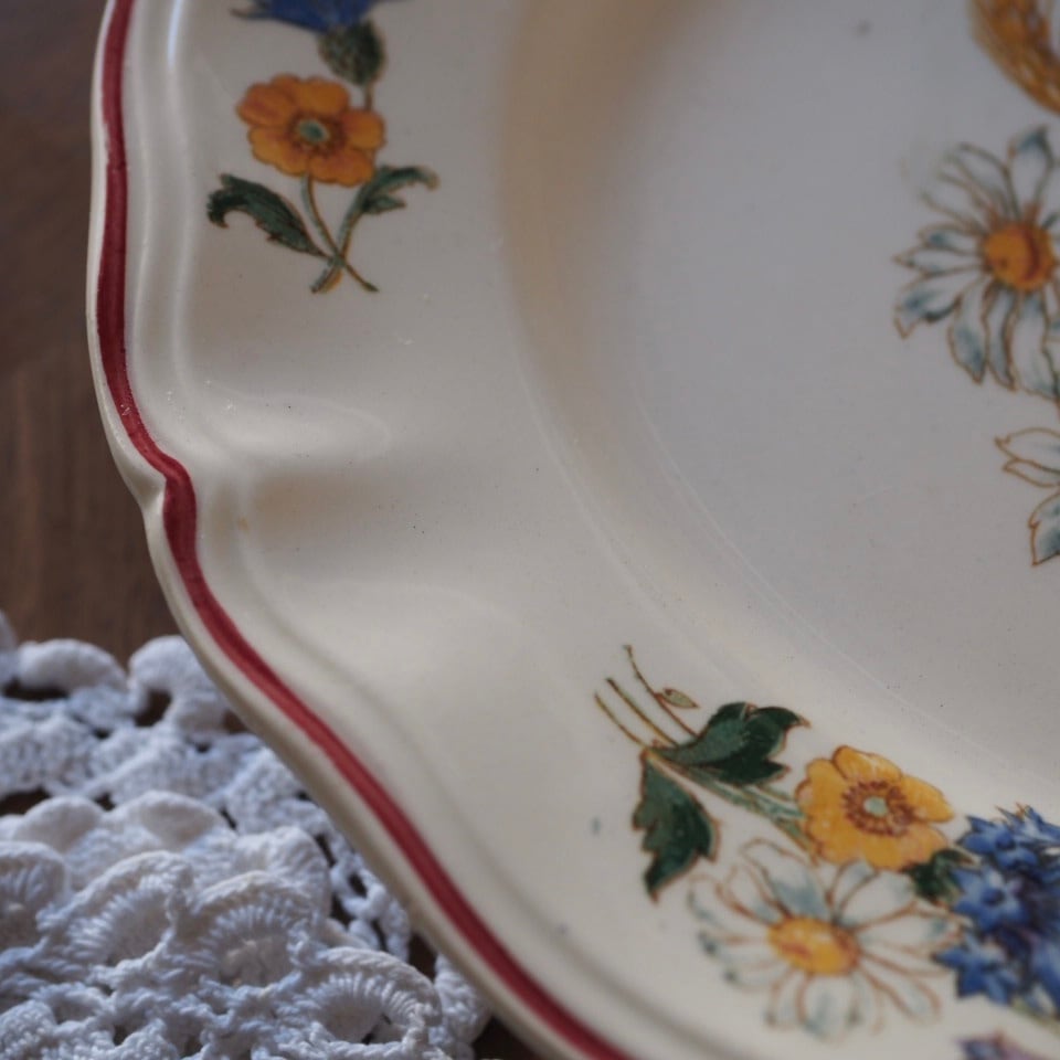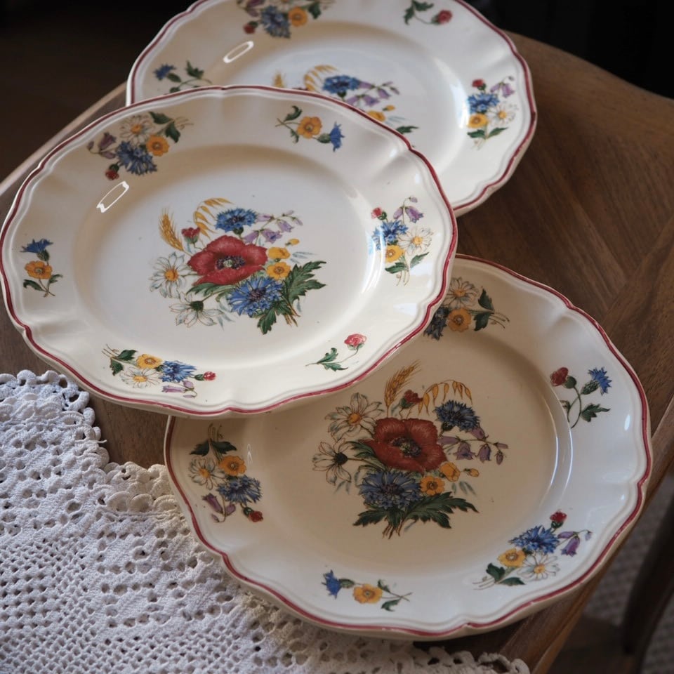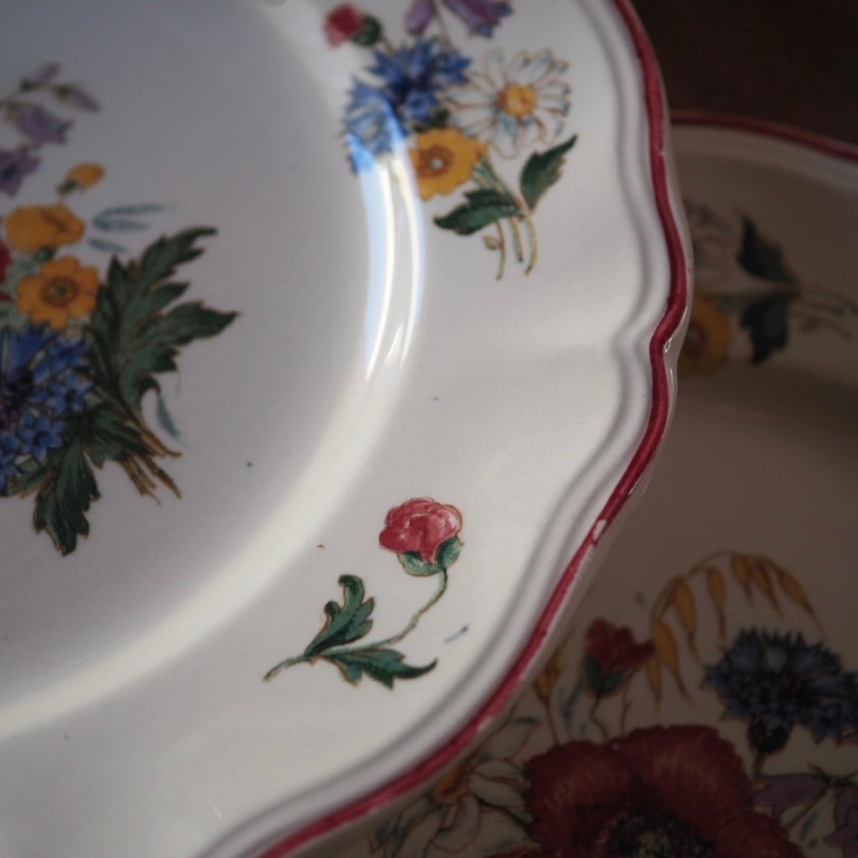 ひなげしや矢車菊など、麦畑に咲く野の花が配されたディゴワン・サルグミンヌのシリーズ「アグレスト」のプレートです。数十年間続いた人気シリーズ。ボルドー色で縁取られ、可憐でかつ落ち着いた印象です。